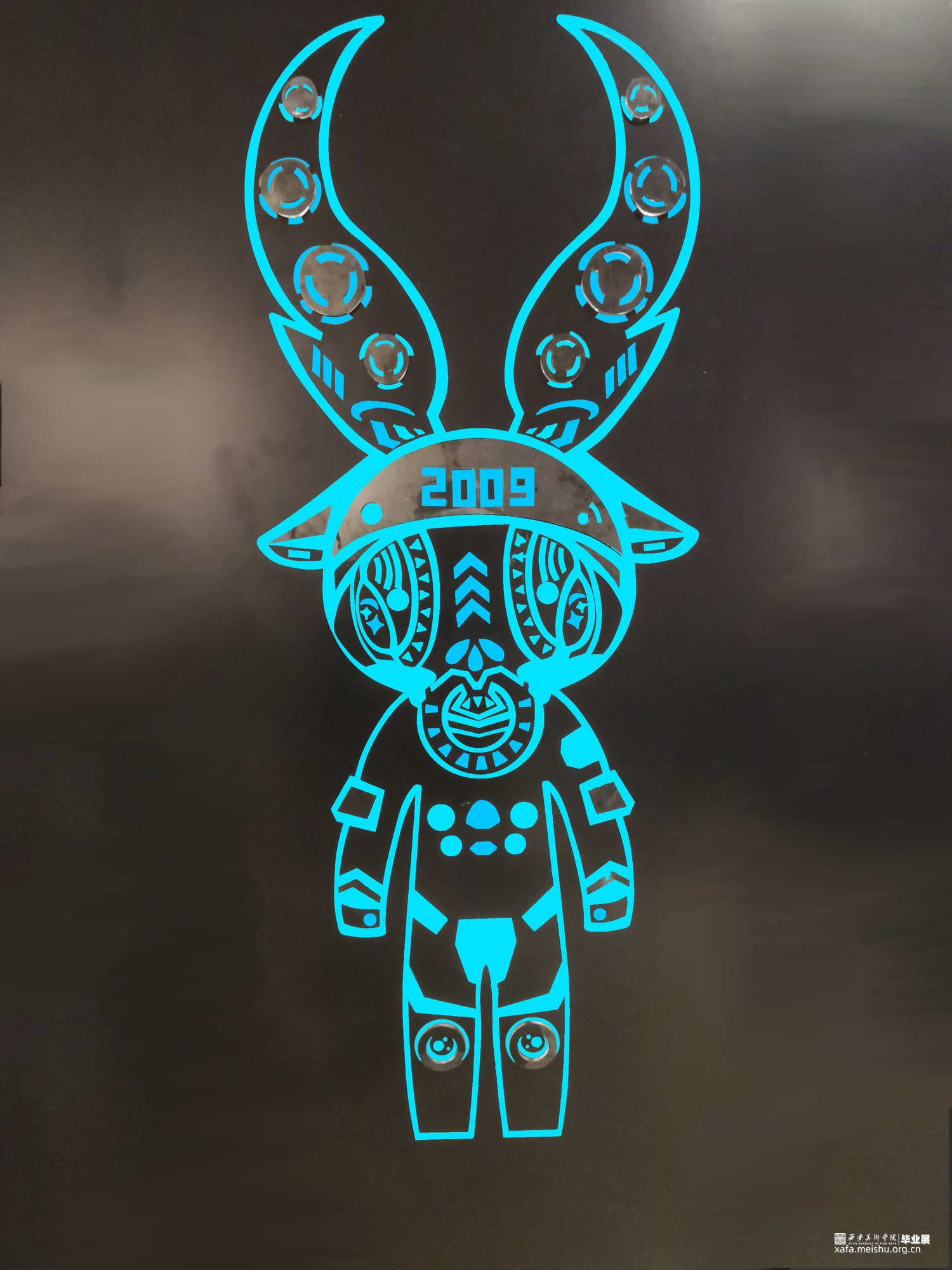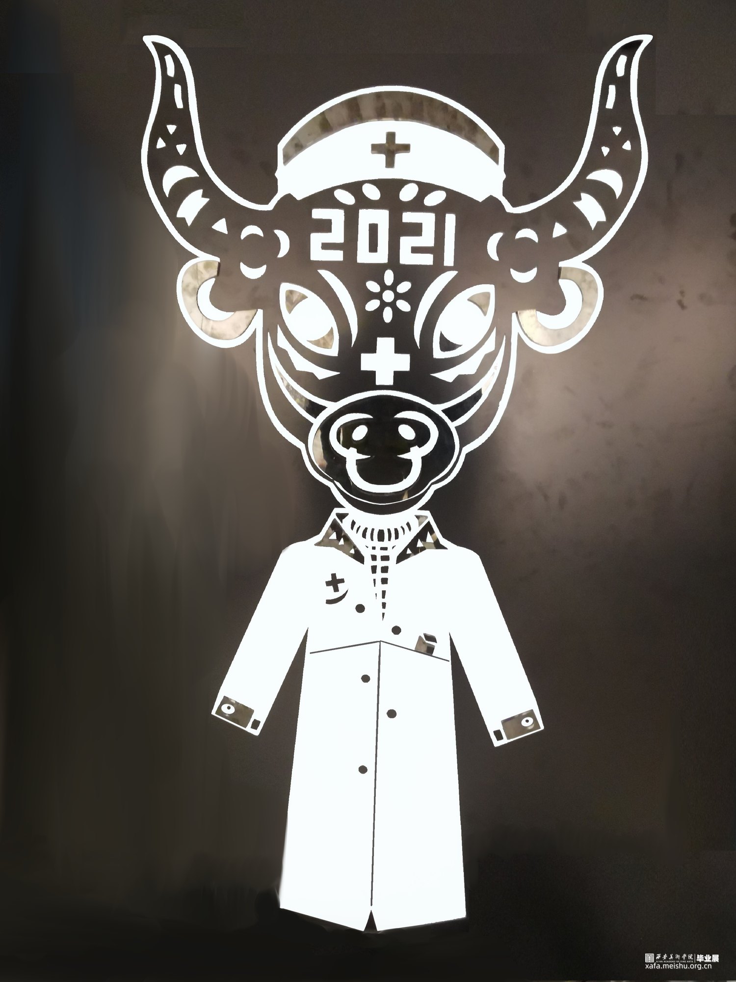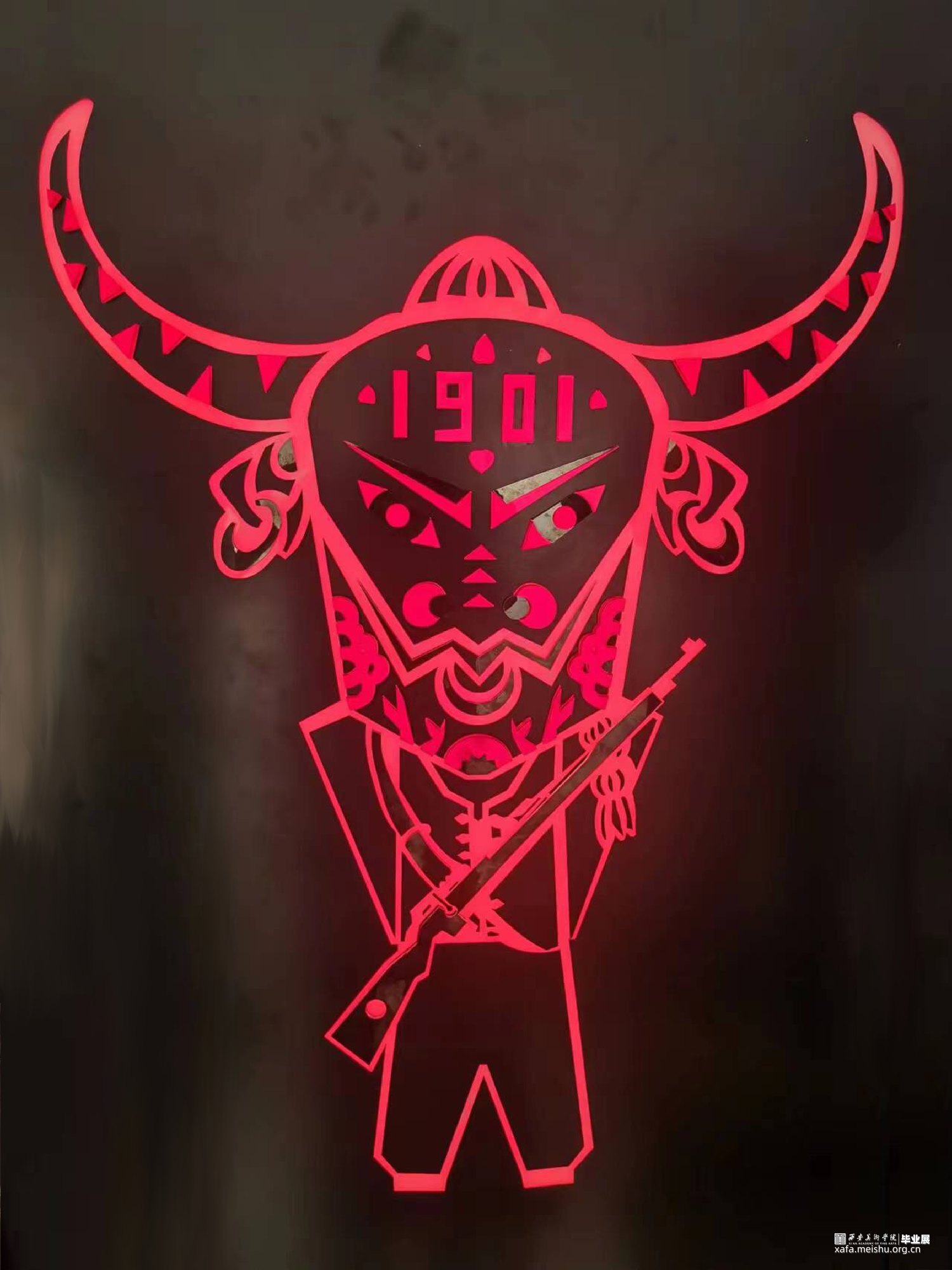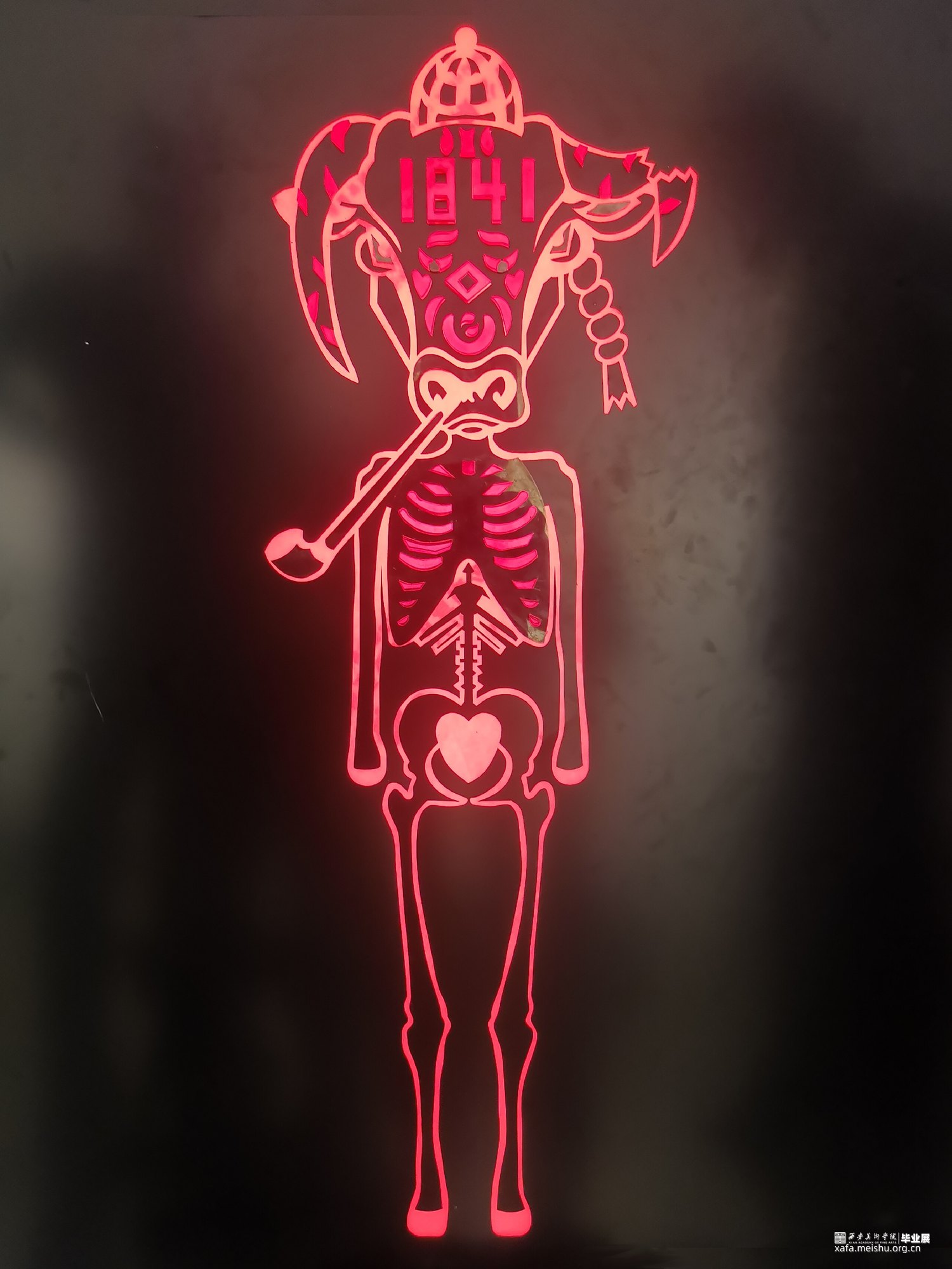1841年,鸦片战争正在清朝全面爆发,全国大多数人都受到了鸦片的侵害,不仅人们瘦骨嶙峋,国家也萎靡不振。所以我以“牛”为主体,加以骨架子和烟斗的形象来装饰。