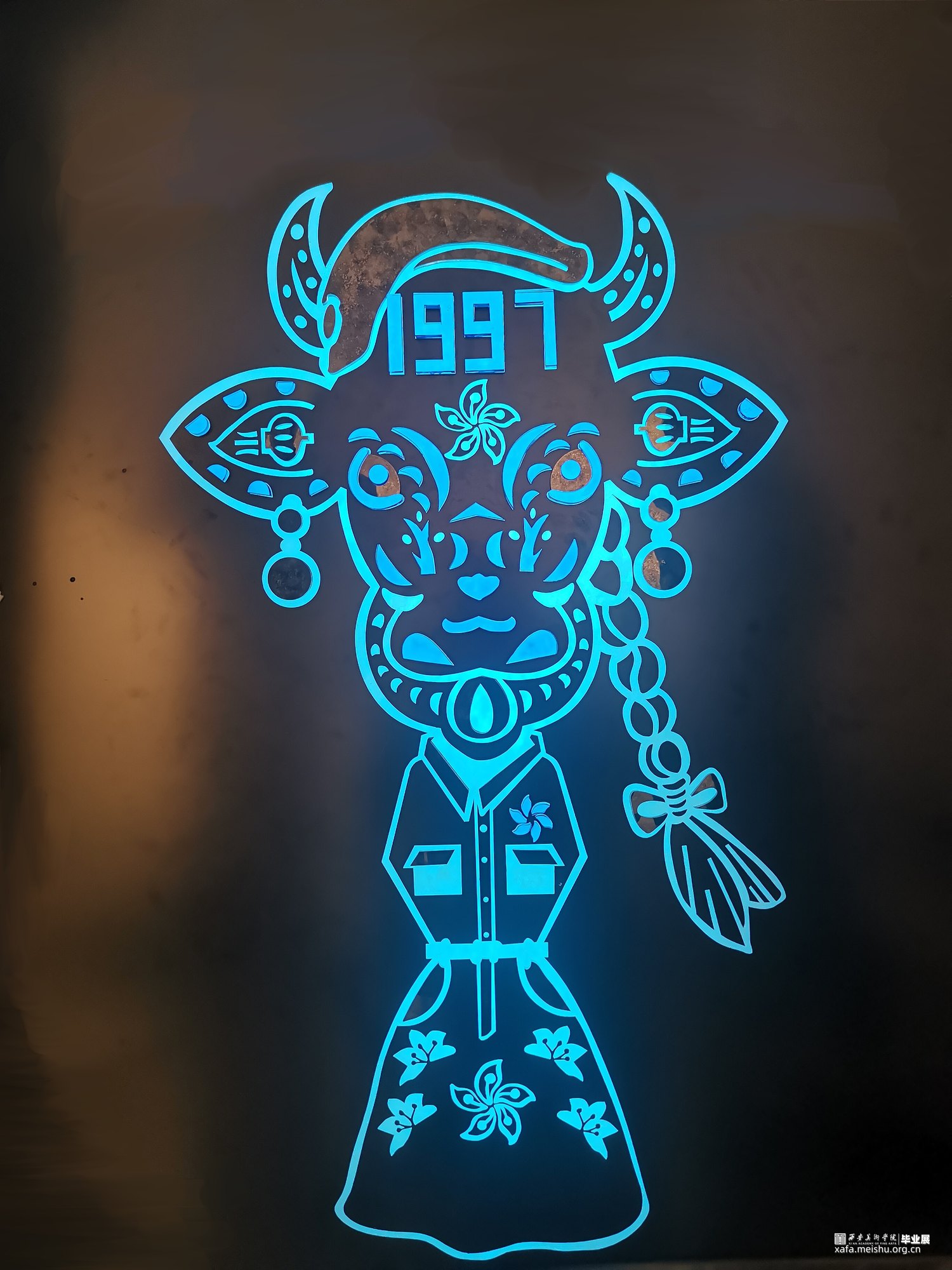 1997年,香港回归,是中国历史上最有纪念意义之一,也极具代表性。我用牛为基本体,加以90年代香港的服饰特点以及最具代表性的紫荆花作为装饰来展现这一形象。