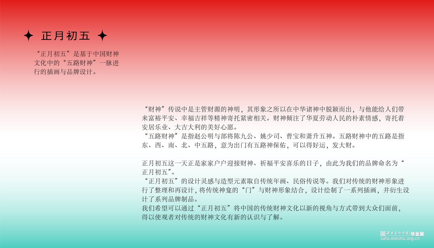 我们希望可以通过“正月初五”将中国的传统财神文化以新的视角与方式带到大众们面前,得以使观者对传统的财神文化有新的认识与了解。