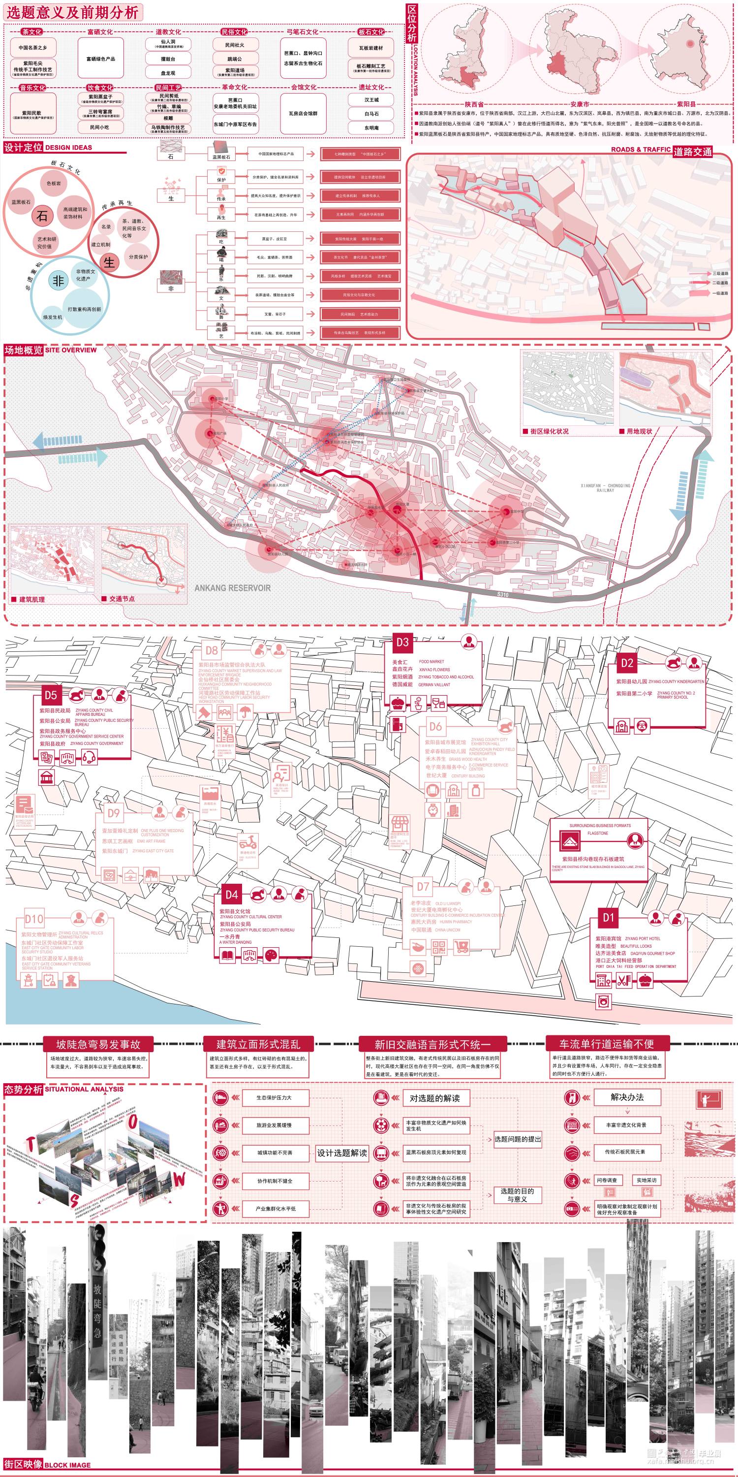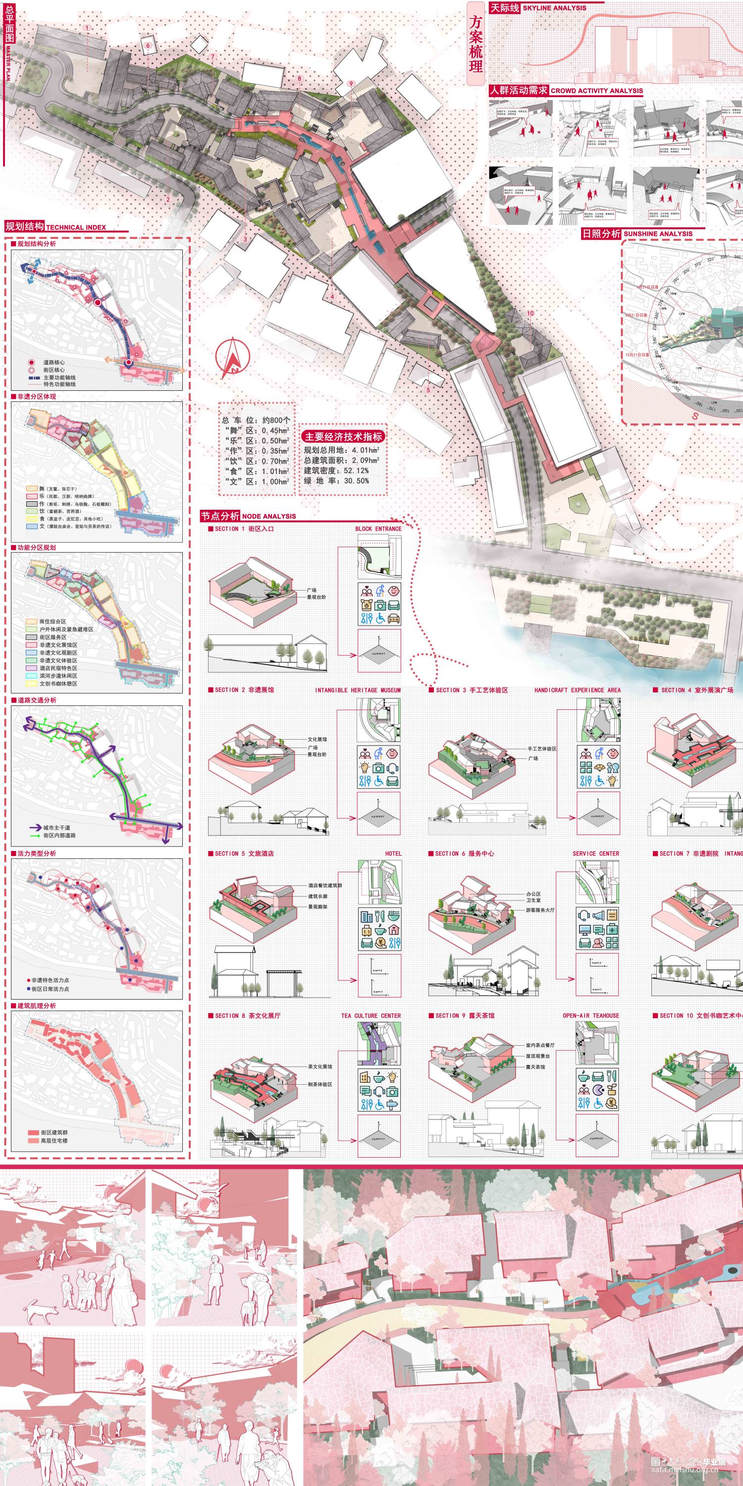本次设计希望将紫阳县山、水、石板交相辉映的风貌延续,在采用当地材料、保留当地特色的基础上,将紫阳县非遗文化与传统民居的蓝黑板石屋顶结合来设计文化街区。通过保护历史文化记忆、改善生态人居环境、完善公共服务配套和增强景观交互体验这四项举措,将非物质文化遗产与传统石板房民居进行良好结合以及激发空间活力,传承与保护传统民居形式和非物质文化遗产,展现紫阳县的城市魅力与地域特色。