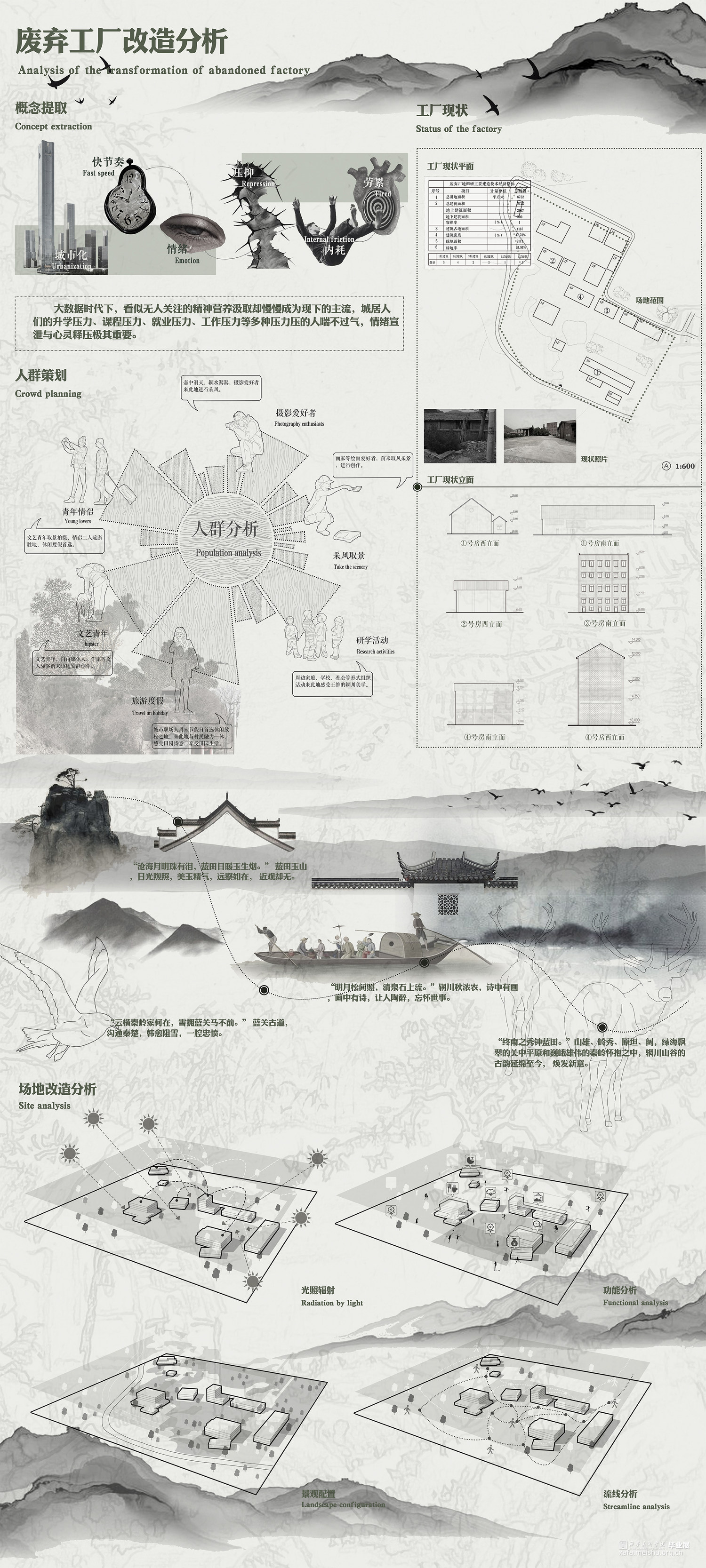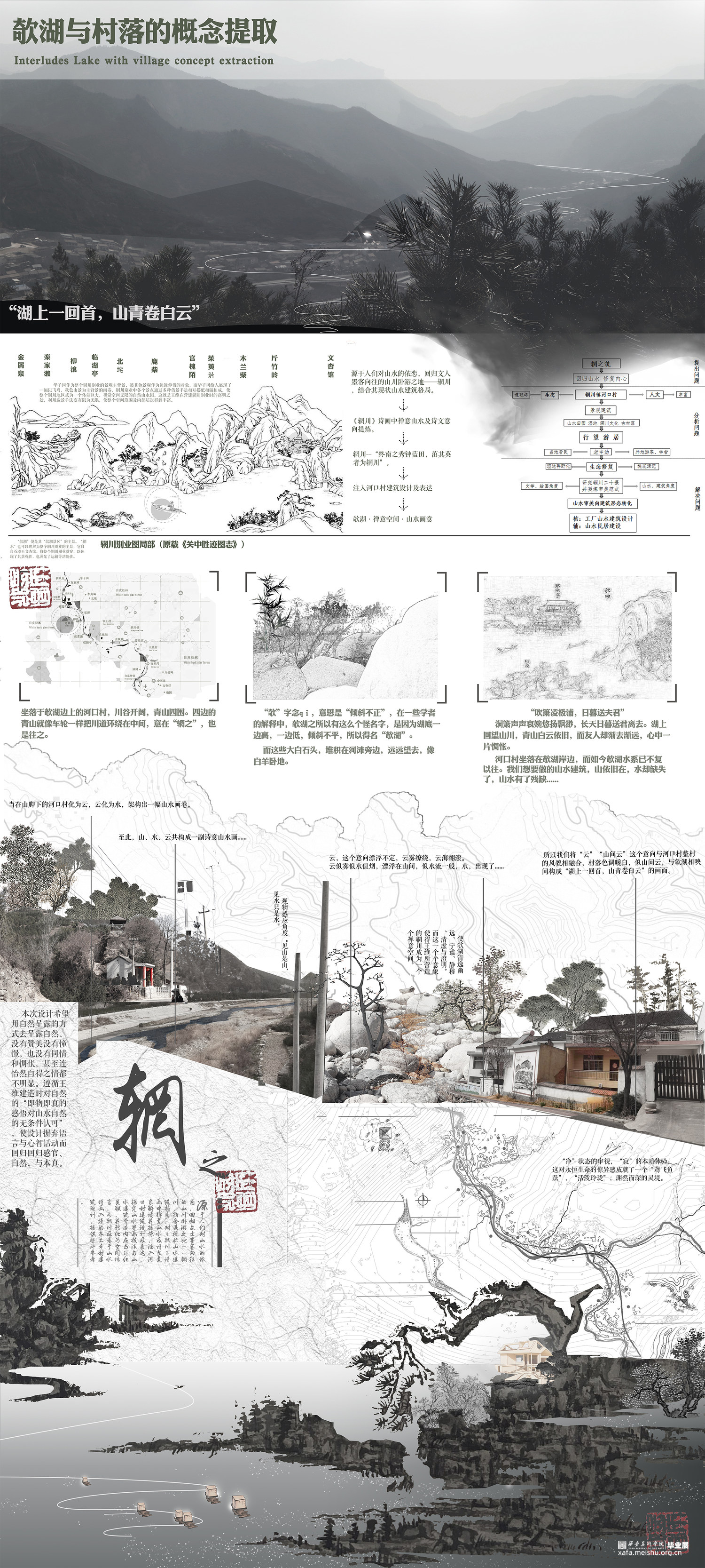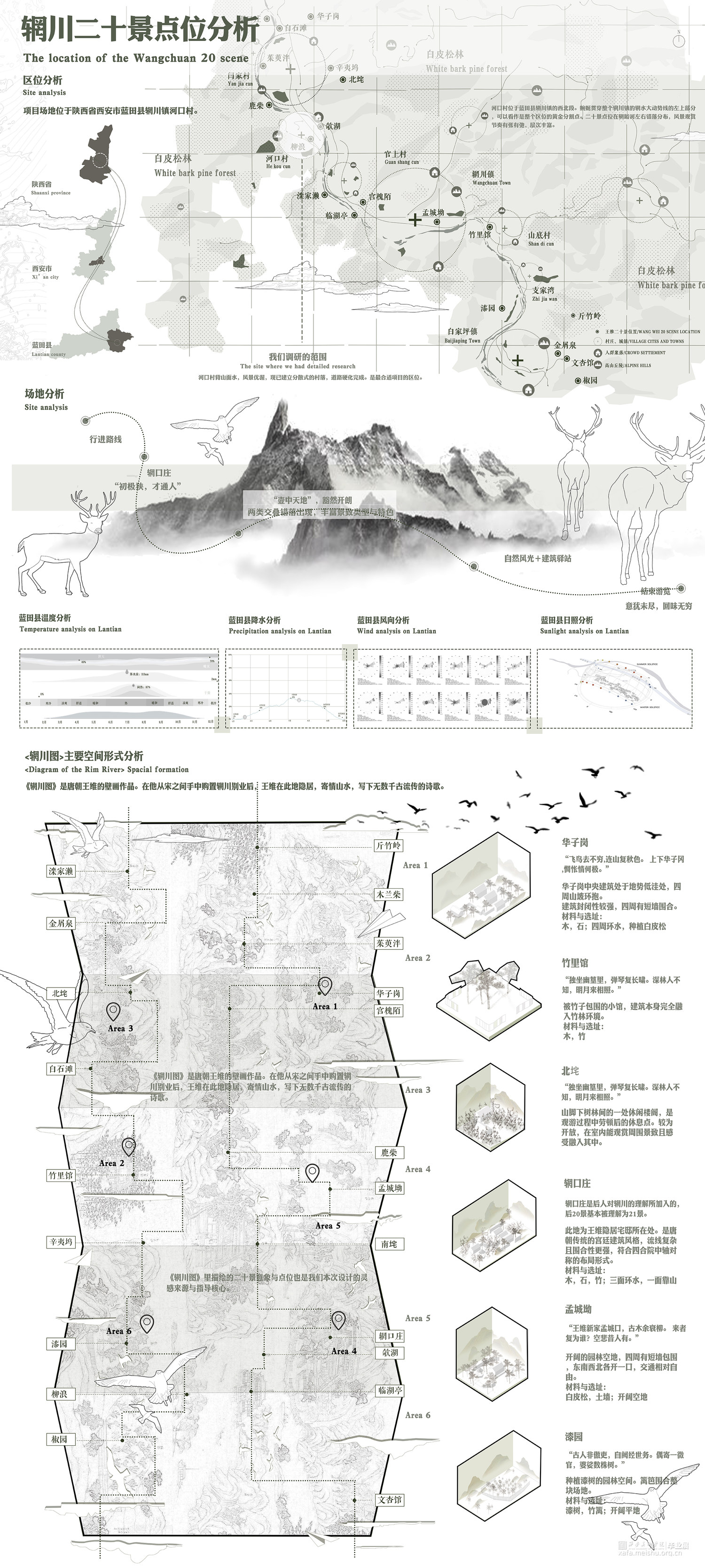 辋川--“终南之秀钟蓝田,茁其英者为辋川”。其位于陕西省西安市蓝田县西南的辋峪,自古即是秦岭北麓一条自然秀美、人文钟灵的川道,因王维《辋川图》、《辋川集》、辋川别业,被历代文人墨客所向往。源于人们对山水的依恋,回归山水,以研究辋川园林审美范式为出发点,深掘辋川视野中的传统山水,探讨风景园林视野中的现当代人与山水关系的变化。根据他所处的地势地貌特点,凝练不同的人文风情,让山水之境融入建筑之美,重构辋川建筑群落。解构与重构、传承与创新,找寻迷失在现代的山水之美,建筑之美,构筑一座存放“诗意 ”的栖居地。