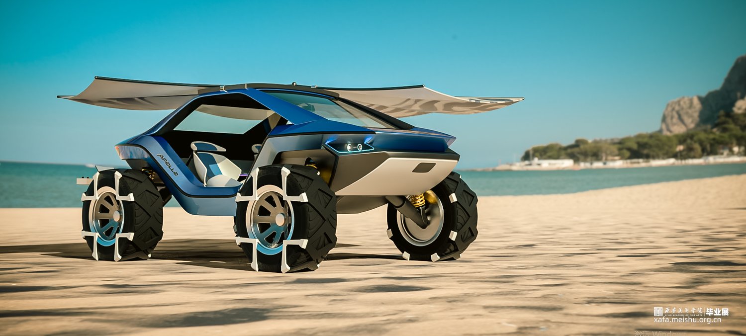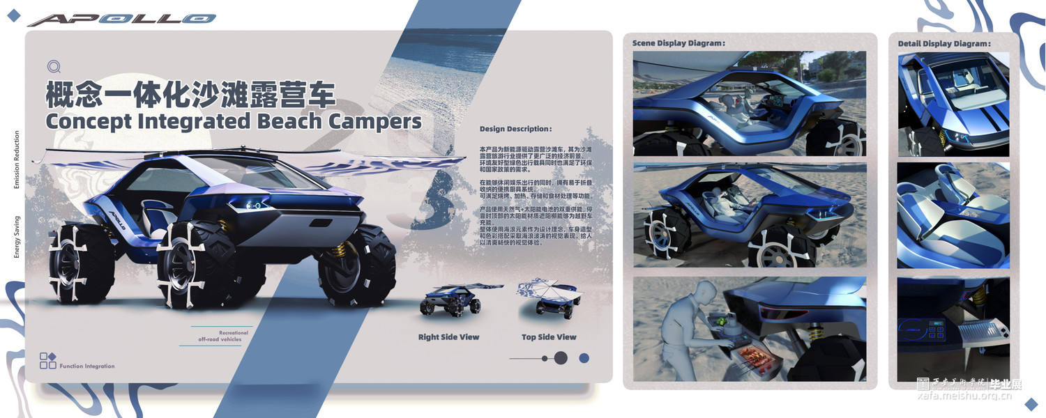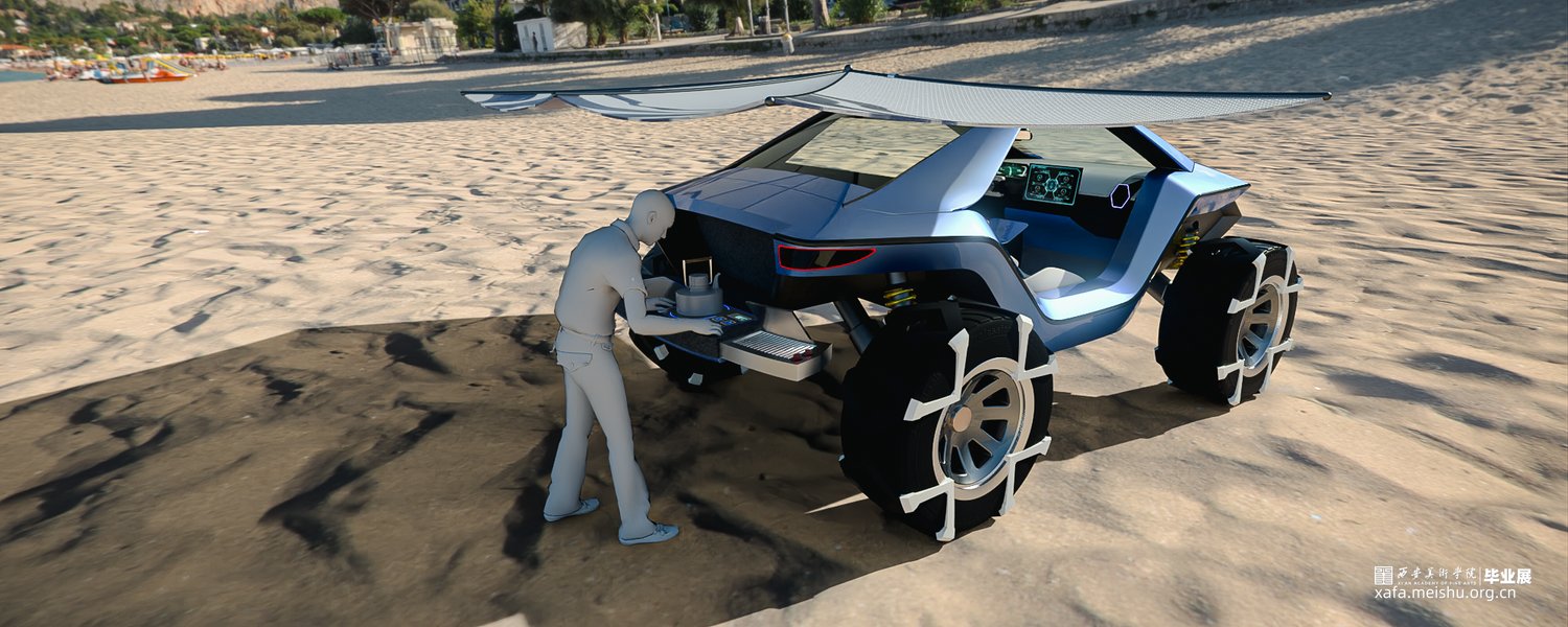产品使用天然气+太阳能电池的双重供能,停靠时顶部的太阳能材质遮阳棚能够为越野车充能。整体使用海浪元素作为设计理念,车身造型和色彩搭配采取海浪波涛的视觉表现。给人以清爽畅快的视觉体验。