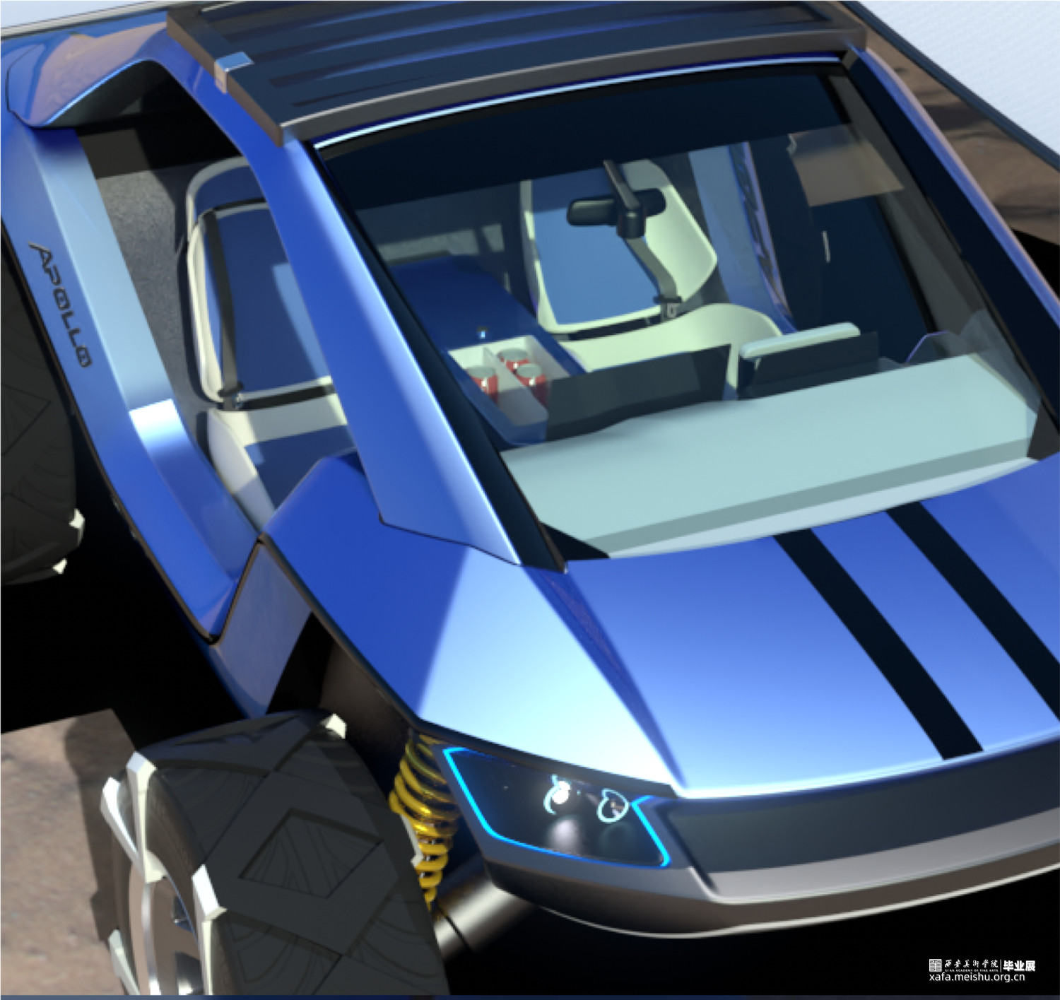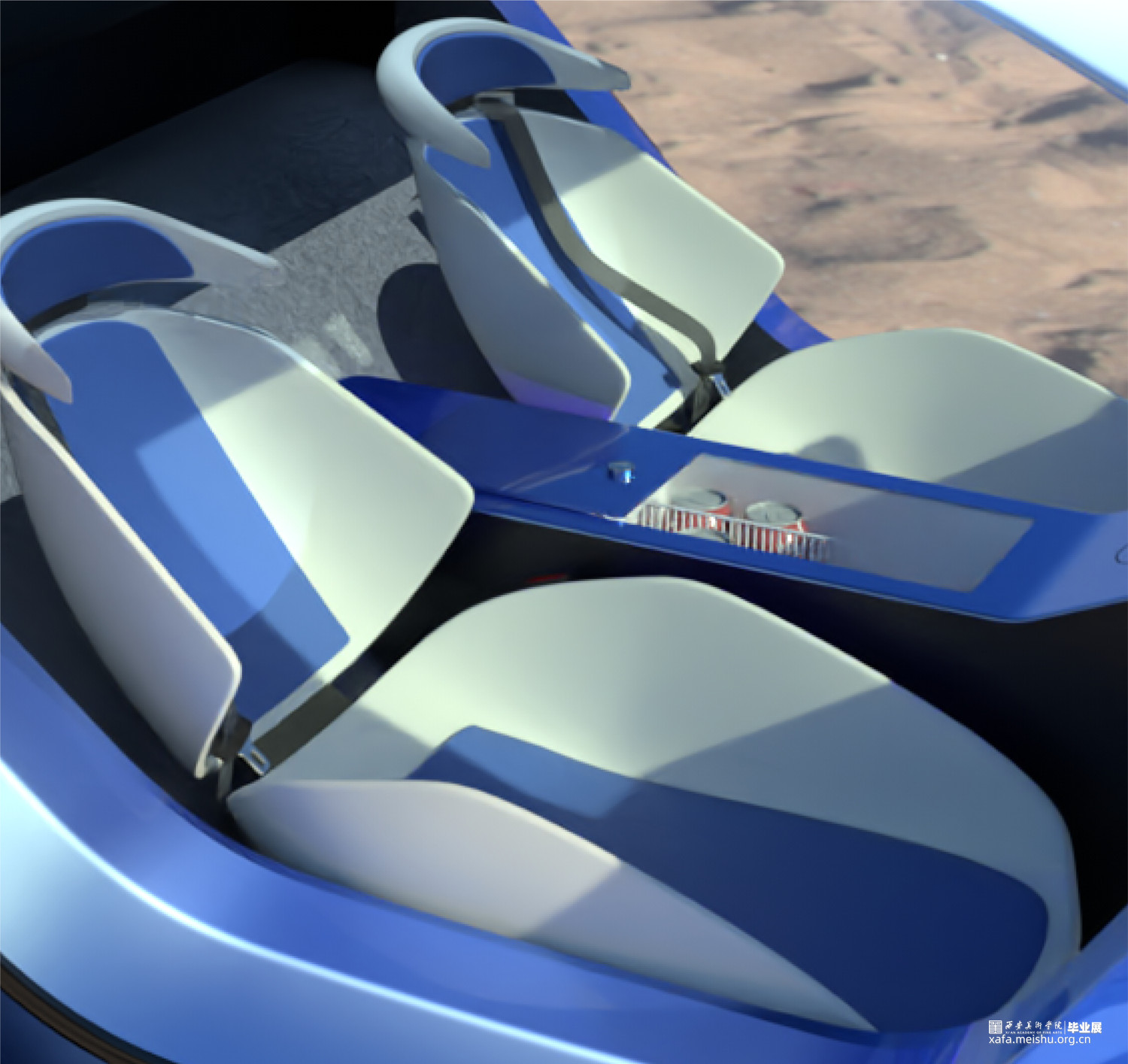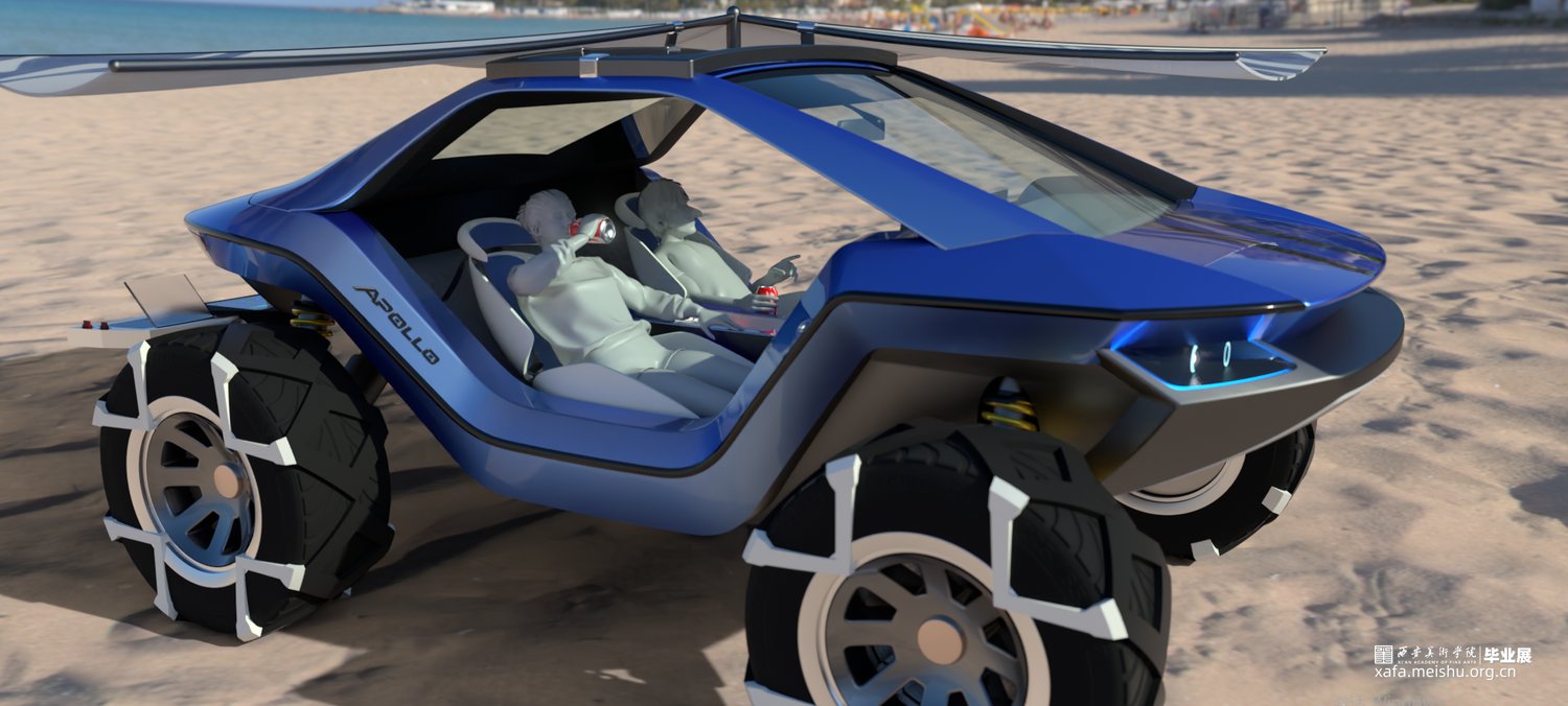 产品使用天然气+太阳能电池的双重供能,停靠时顶部的太阳能材质遮阳棚能够为越野车充能。整体使用海浪元素作为设计理念,车身造型和色彩搭配采取海浪波涛的视觉表现。给人以清爽畅快的视觉体验。
