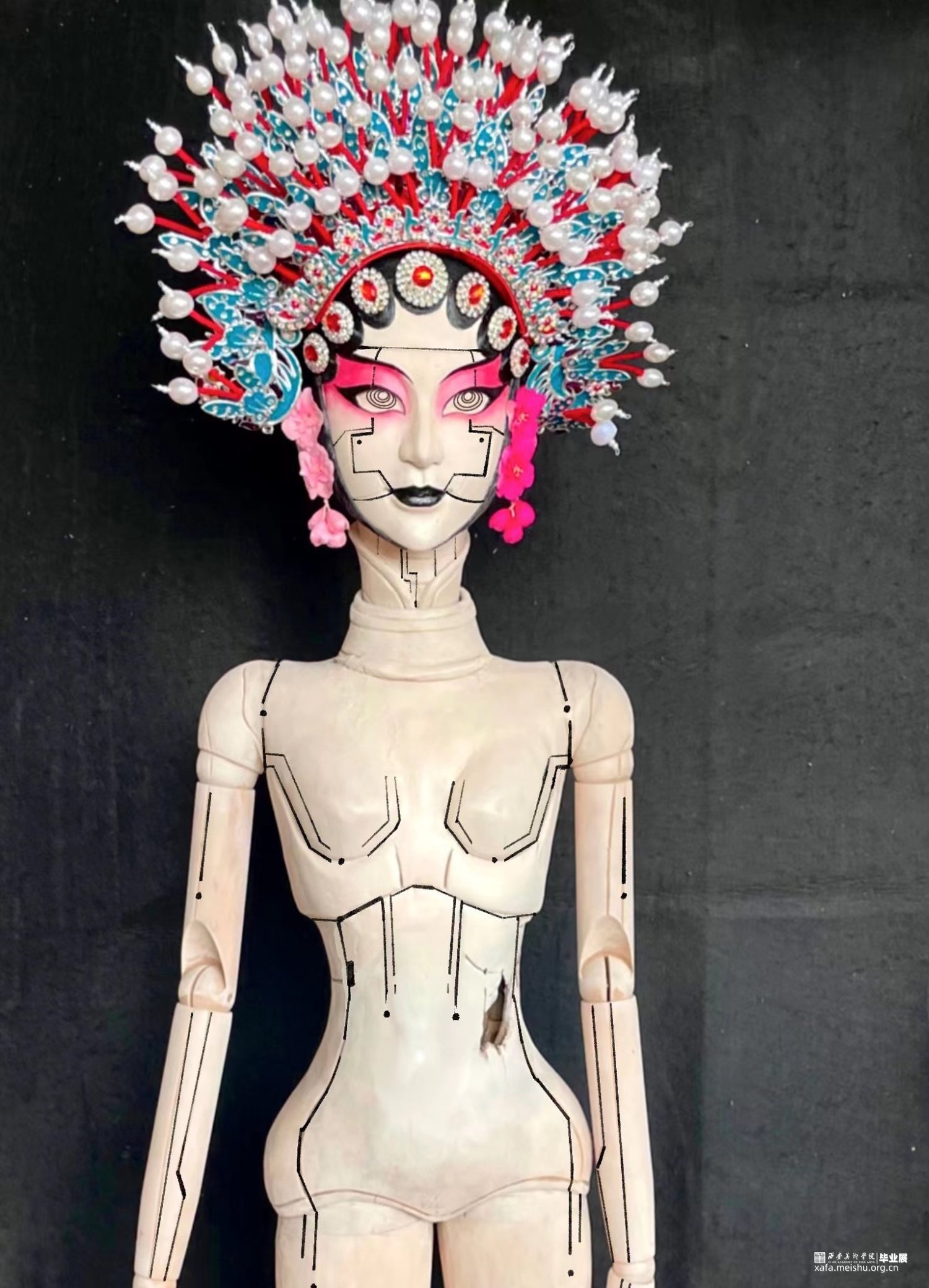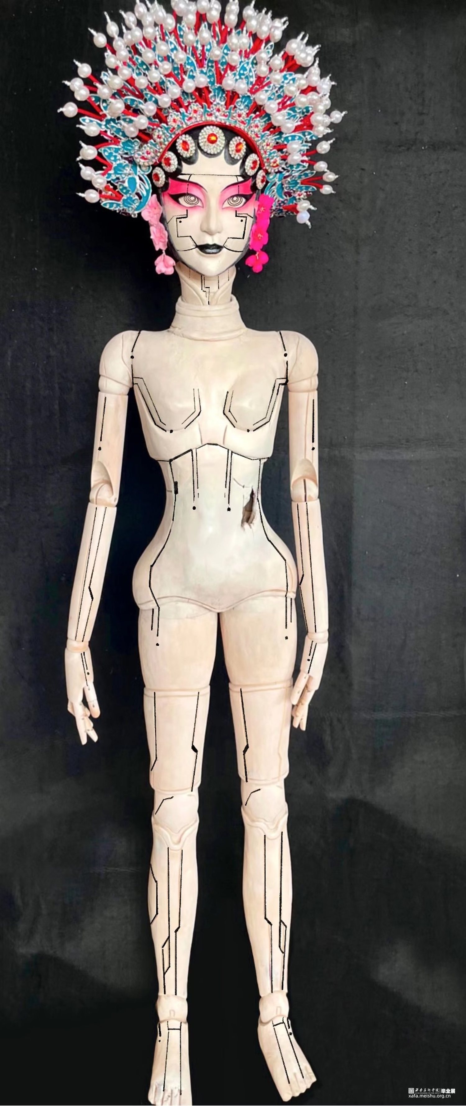 一块普通的木头遇到匠人的打磨雕刻后,就会成为人们驻足观赏的艺术品。本作品以婺剧和赛博朋克为元素,用木头雕刻成新型人偶的形象。婺剧属于浙江戏种之一,所代表的是传统文化;而赛博朋克是“控制论”与“朋克”的合成词汇,是代表未来、创新的一种视觉美学风格,该作品因传统文化与现代科技文化所碰撞而产生,在提倡文化自信,复兴传统文化的今天,将传统文化与当代文化相结合创新,使之焕发出新的光彩是本次创作尝试的重要意义。