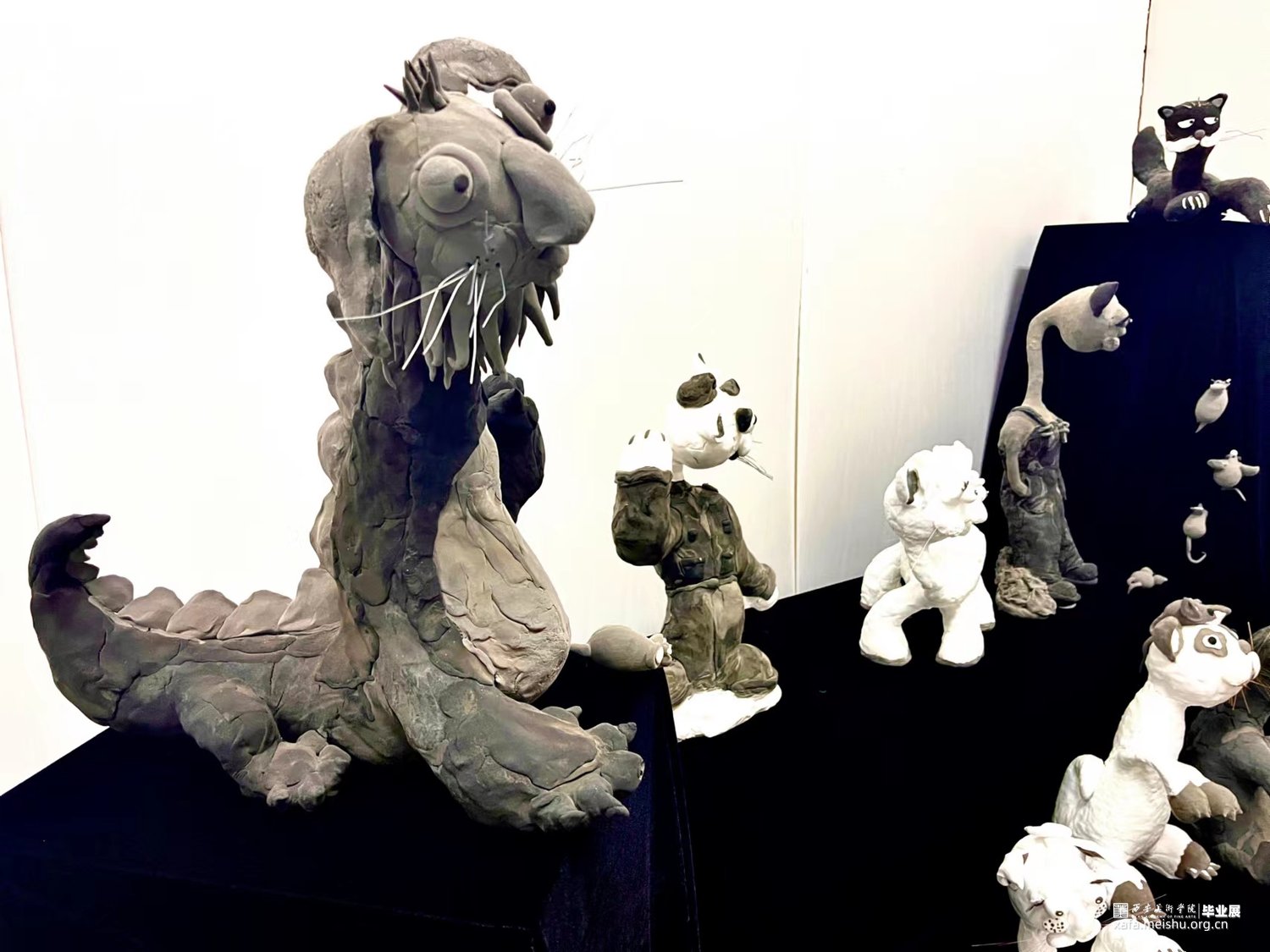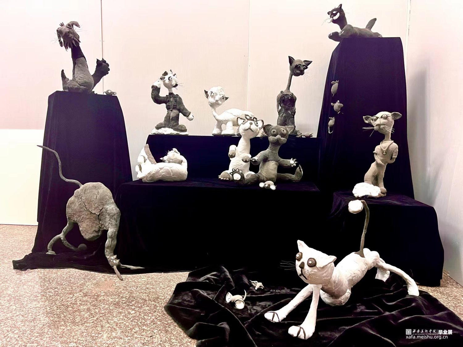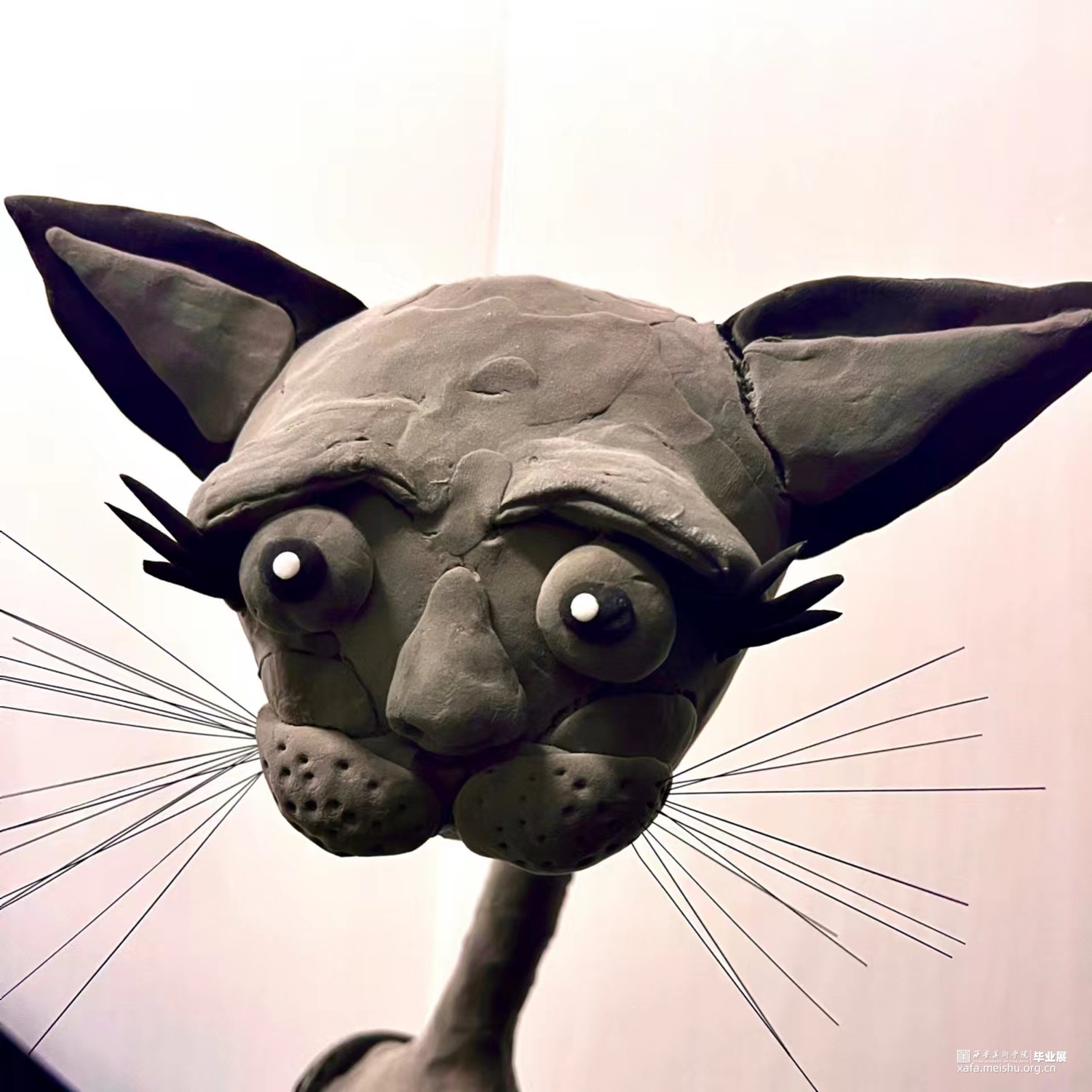 作品选用超轻粘土这种孩子常用的材料,辅以黑、白、灰的色彩搭配形式,将儿童的自由天性与成人的沉稳成熟结合进行创作。黑、白、灰的色彩对于儿童来说常常联想到“酷”和“帅气”,利用以上三种颜色能够打破猫咪在我们心中可爱 、柔软的形象让人眼前一亮,同时也向外界传递着以“孩子的眼光看待世界,才能看到事物最本真的样子。”