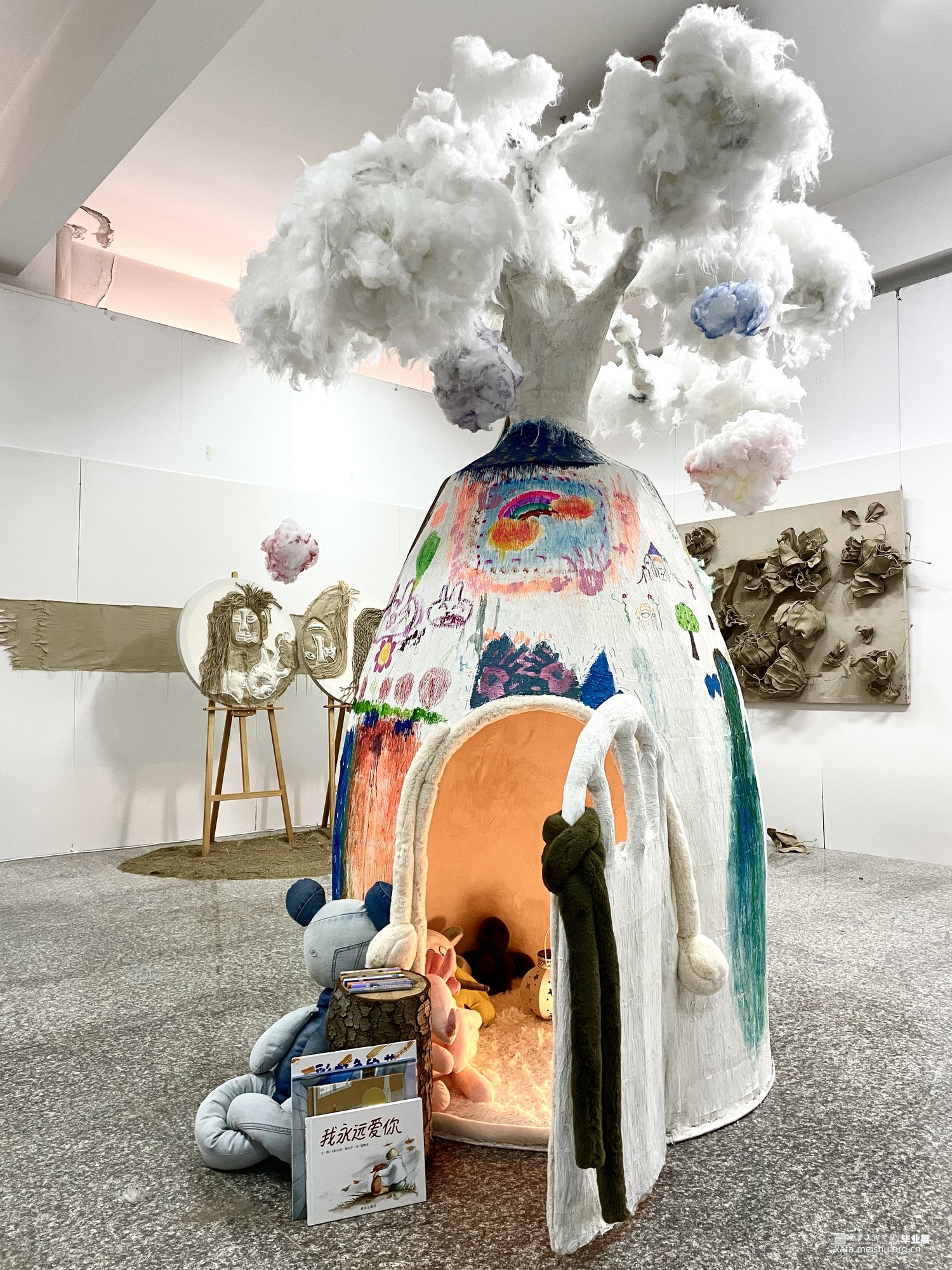 使用钢筋、废旧报纸、纸、铝丝、铁丝、白乳胶、棉花、长绒布料等材料制作而成。采用环保主义理念,树干由钢筋、铁丝、铝丝搭建而成,树身由废旧报纸粘贴而成,树里粘贴柔软布料,四周坚挺,为孩子们提供一个安全又舒适的温暖环境。孩子们在逐渐成长,树也在逐渐变化,孩子们用画笔表达自己的情绪,在树洞里开心,在树洞里难过,让猴面包树治愈自己的情绪。让猴面包树成为孩子们在爱中的守护。