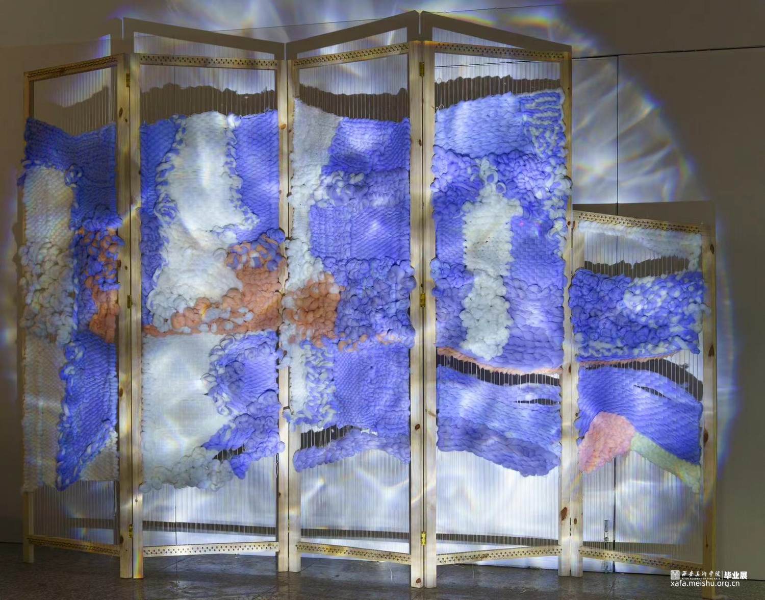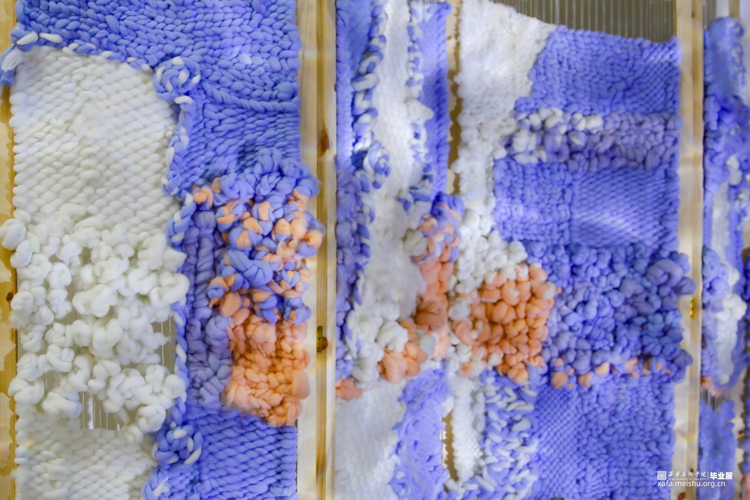 作品《童生晓梦》以实木为架,通过不同毛线的变化编织出不同肌理呈现,通过光影的流动表现时间抑或梦境的虚空,搭配蓝白主色描绘的抽象图案,让观者可看、可触、可感。庄生一梦,杜鹃啼血,毛线或粗或细,心似双丝网,中有千千结。