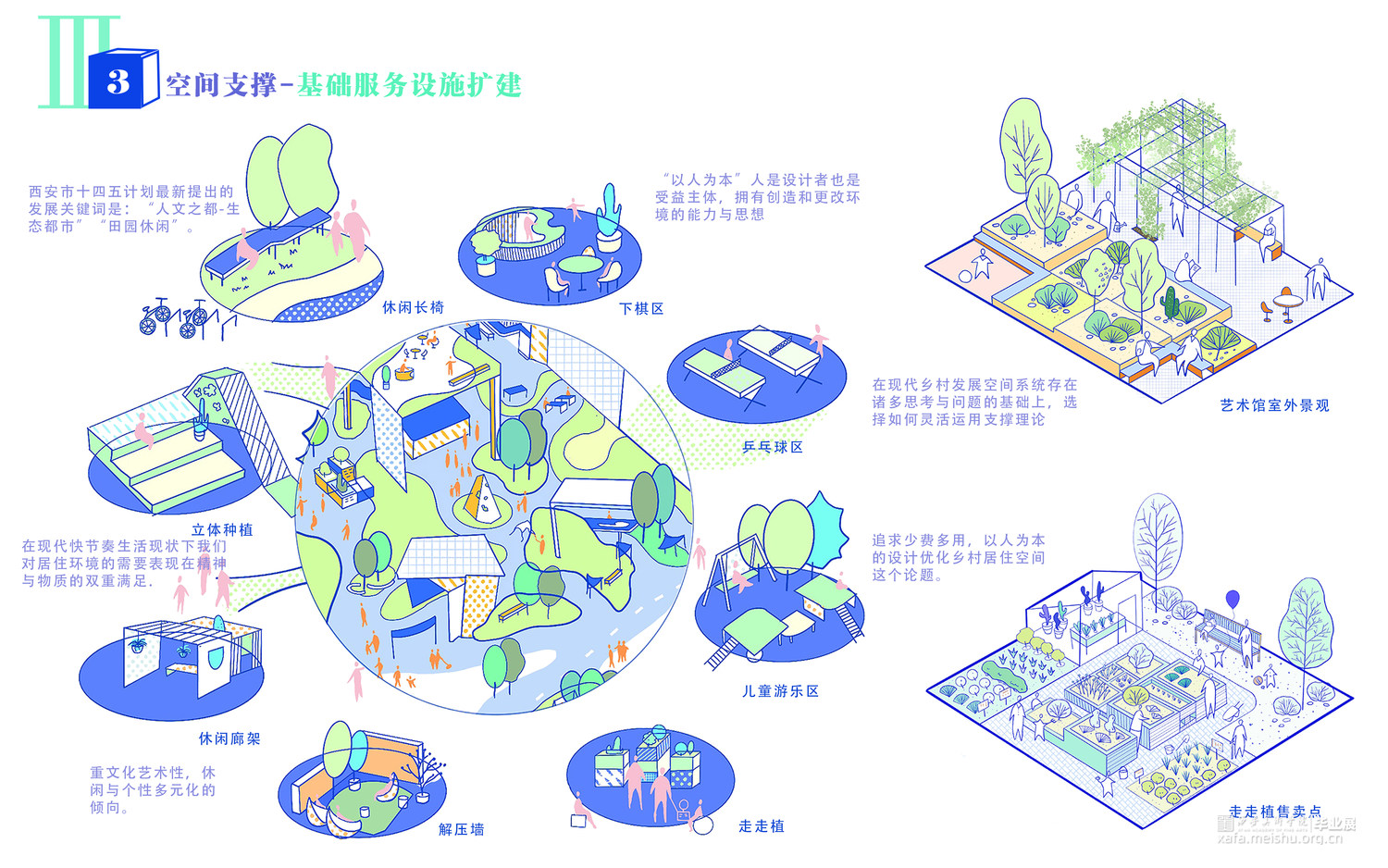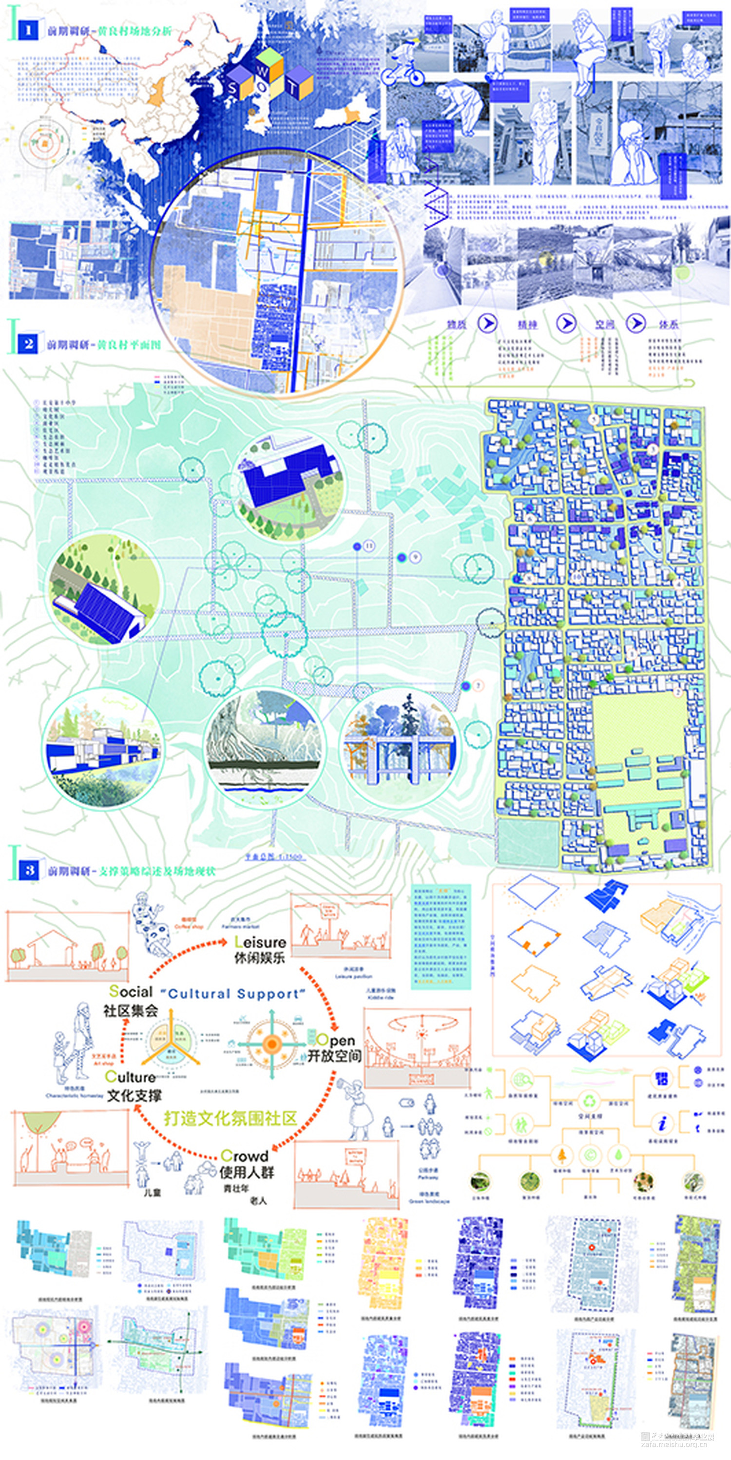 “我们认为“以人为本”人是设计者也是受益主体,拥有创造和更改环境的能力与思想,在现代快节奏生活现状下我们对居住环境的需要表现在精神与物质的双重满足,重文化艺术性,休闲与个性多元化的倾向。在文化艺术乡村创新与应用研究中以“支撑设计”为核心设计概念主题,以黄良村为例;利用场地地理优势,打造文化艺术乡村,实现“安支若素,人之荣融”的理想环境设计改造。本次设计主要围绕“支撑”展开设计,包括(1.物质支持:废旧房屋改造与基础设施建设 2.精神支撑:绿色环境景观与文化创新街区设计 3.体系支撑:社区公共活动空间与乡村街道路网设计 4.空间设计:农田规范与改造,商业街整改与历史文化遗址的保留)以上四个主要设计方向。