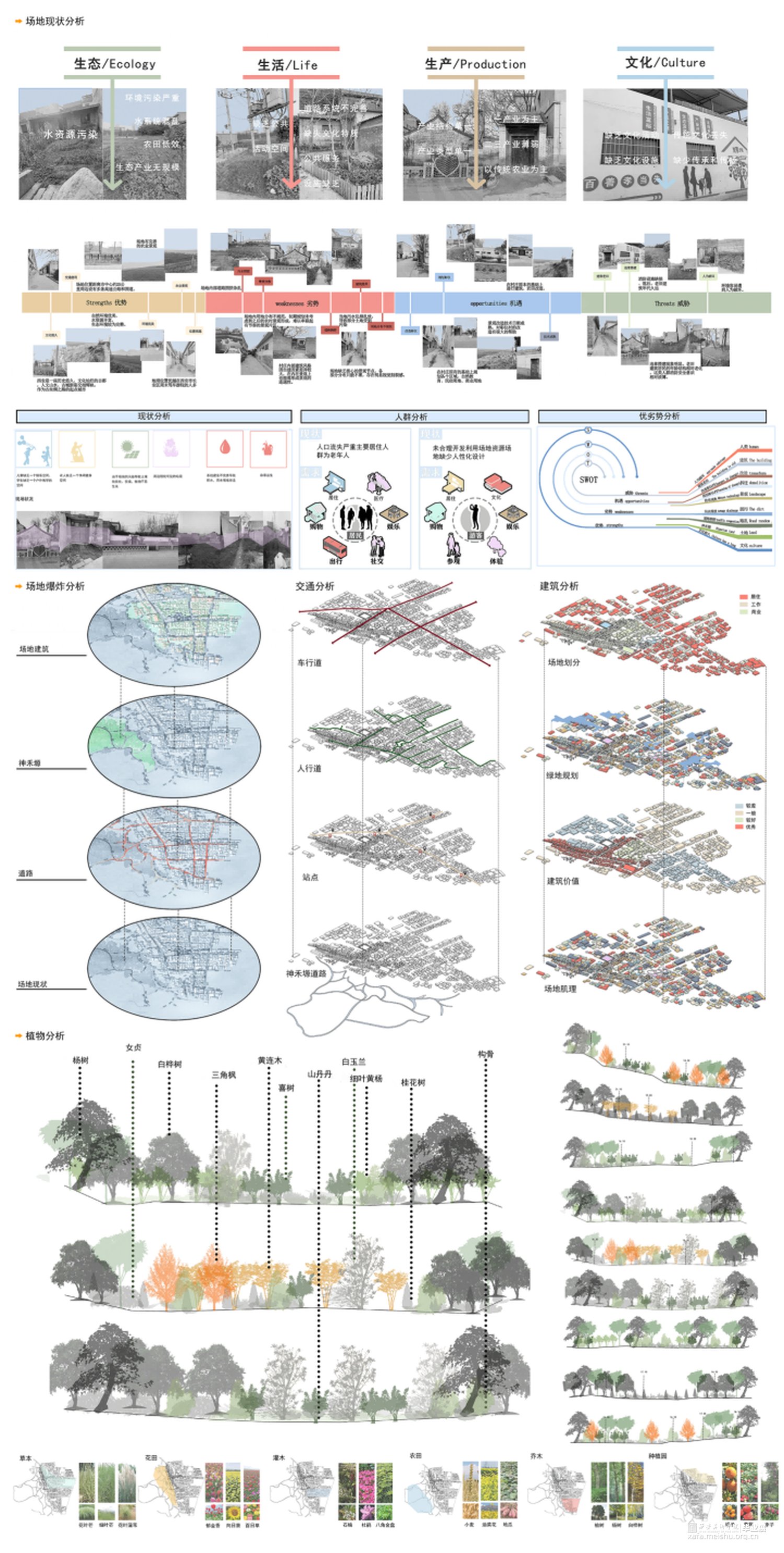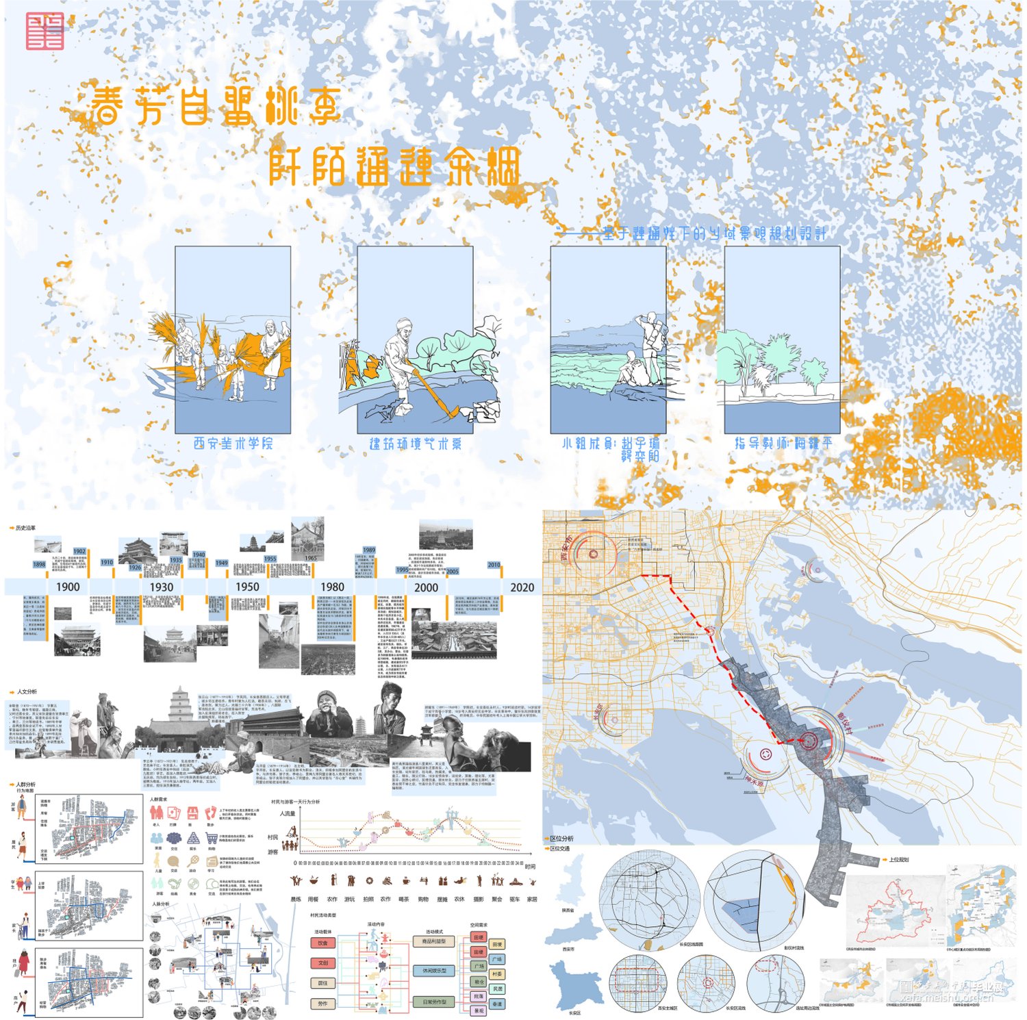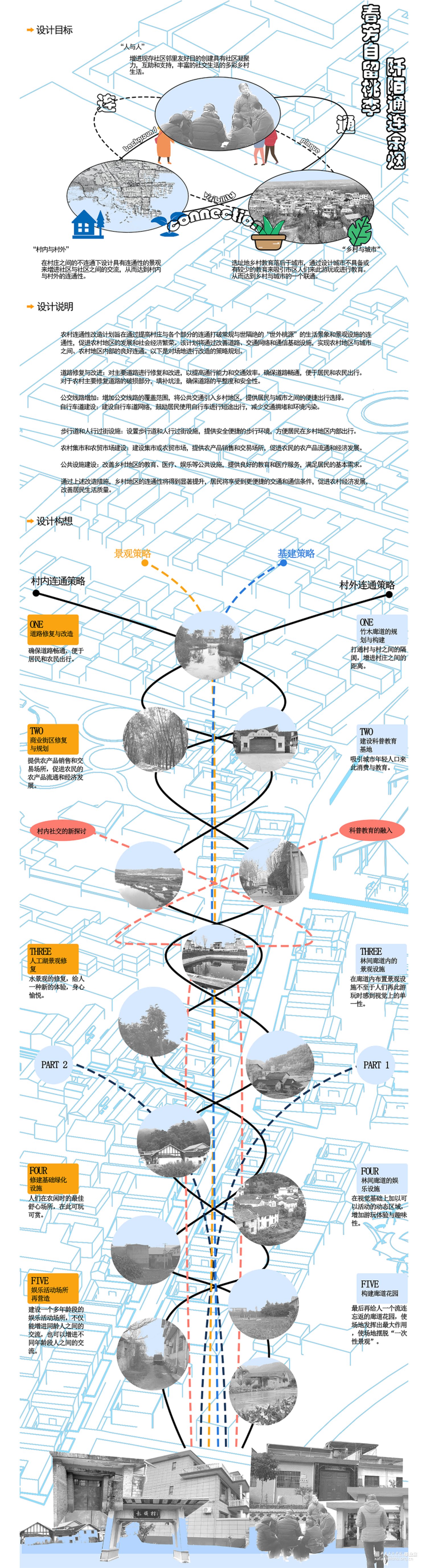 作品名称:春芳自留桃李,阡陌通连余烟——基于连通性下的乡域景观规划设计,通过连通性与乡村的融合,不仅是景观也包括人与人、村内与村外、乡村与城市的连通。打造一个和谐、舒适、美好的自然乡村环境。