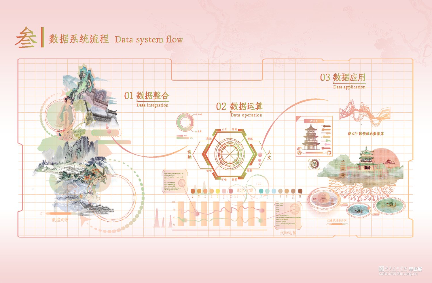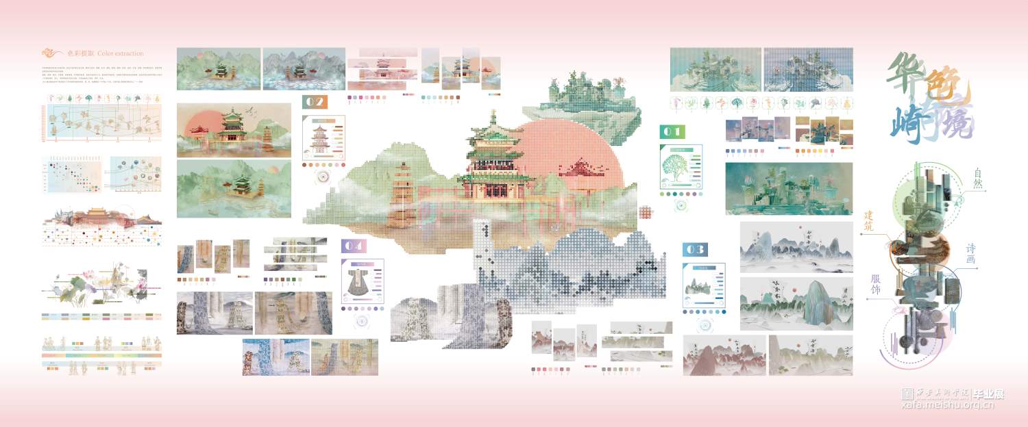 本次作品的设计思路可以概括为"传承传统,融合创新"。将中国传统色彩与数智化技术相结合,详细梳理传统色及不断发展的演进历史,阐释了色彩与历史、文学、民俗、艺术、生活等千丝万缕的关系。在传承中国传统色文化的基础上,将数智化和中国传统色文化结合起来应用,既可以保留中国传统色文化的独特魅力和文化内涵,又可以应用现代科技和设计理念,创造出具有创新性和现代感的作品,为设计师、艺术家、文化爱好者等提供丰富的色彩资源,为创新和创作提供更多的灵感和参考,推动中国传统文化的创新和发展。