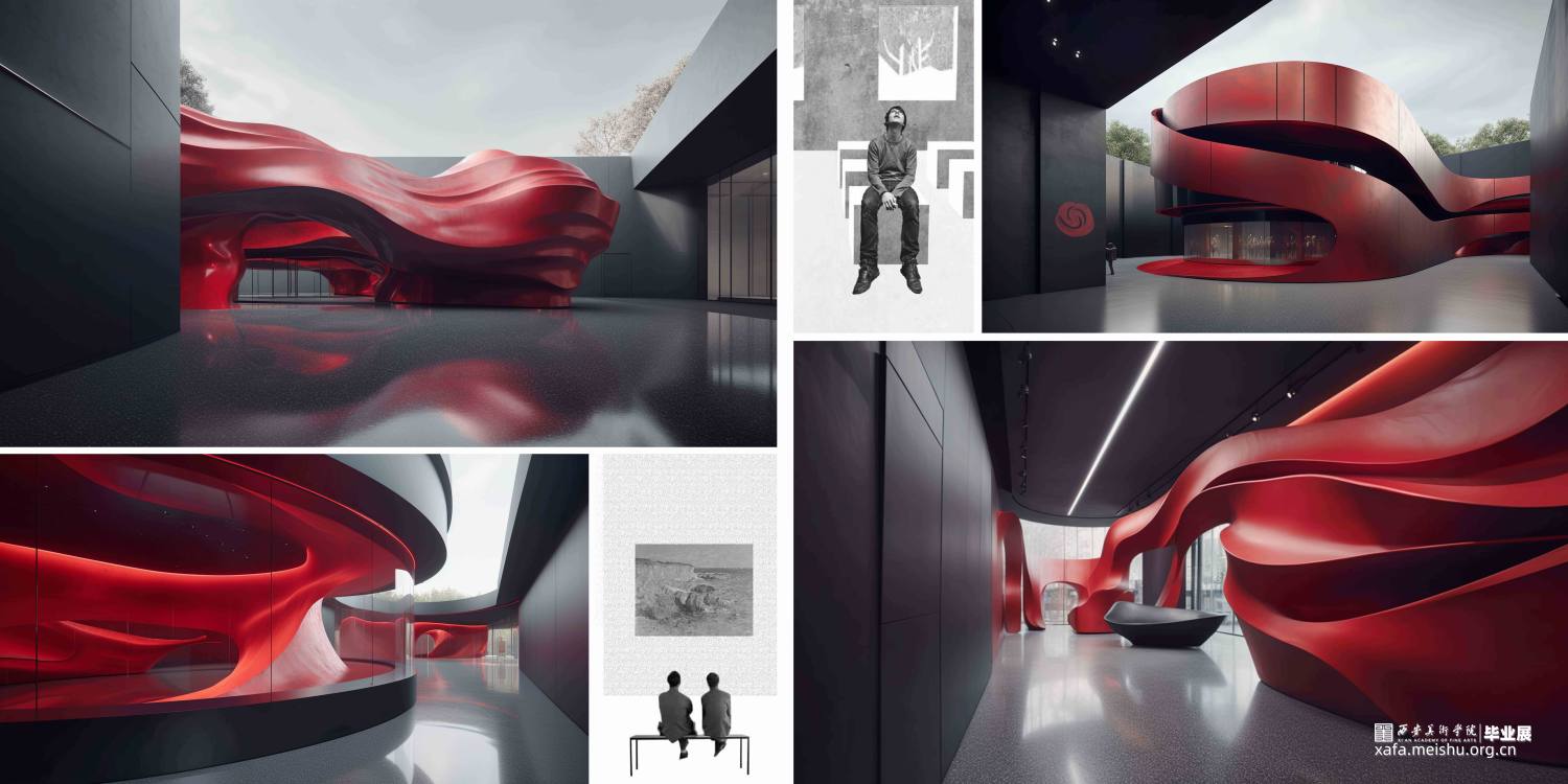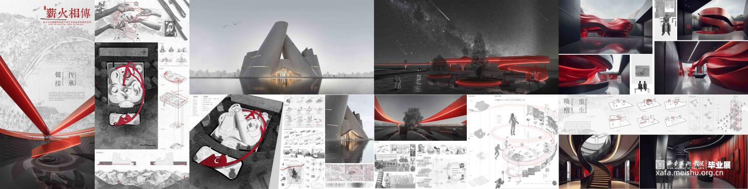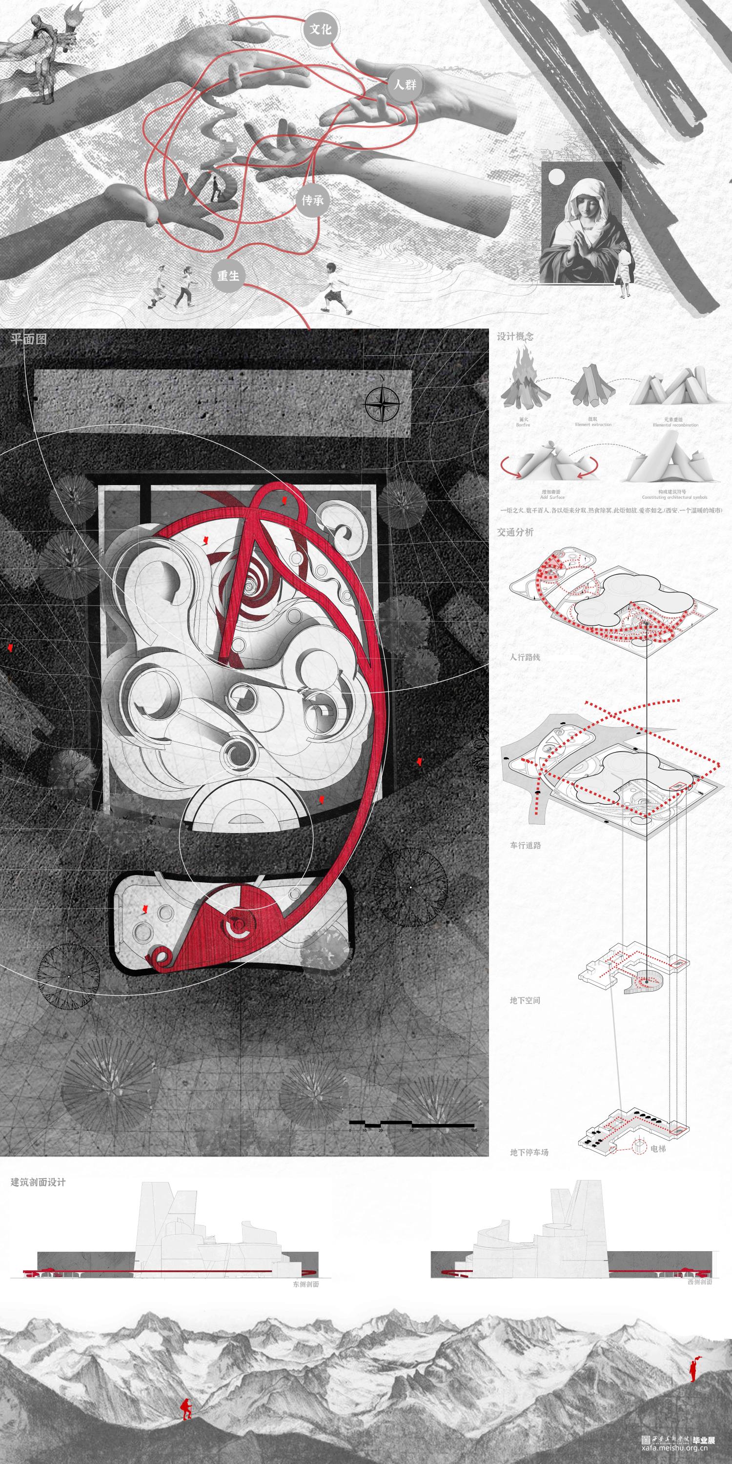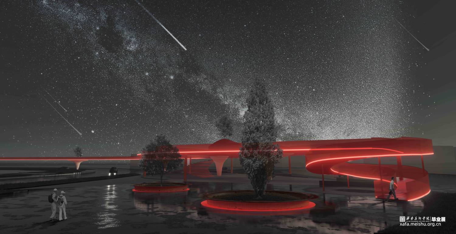 古有“鸭头新绿- 水,雁齿小红桥”,张说于红桥之上授人以歌。画家张择端绘制的《清明上河图》描绘了围绕着不同类型的桥发生的人们的市井生活氛围。“桥”围绕了紧密的商业和文化生活。本设计用红桥串联起建筑、景观、室内设计,象征着文化将得到一代又一代的传承。用同心圆延伸的形式体现出现代艺术家推陈出新的发展方向,走在前人铺垫的桥面上,持续将文化和艺术授之于人,同时又希望在此处能找回初心和属于自己的那份传承。