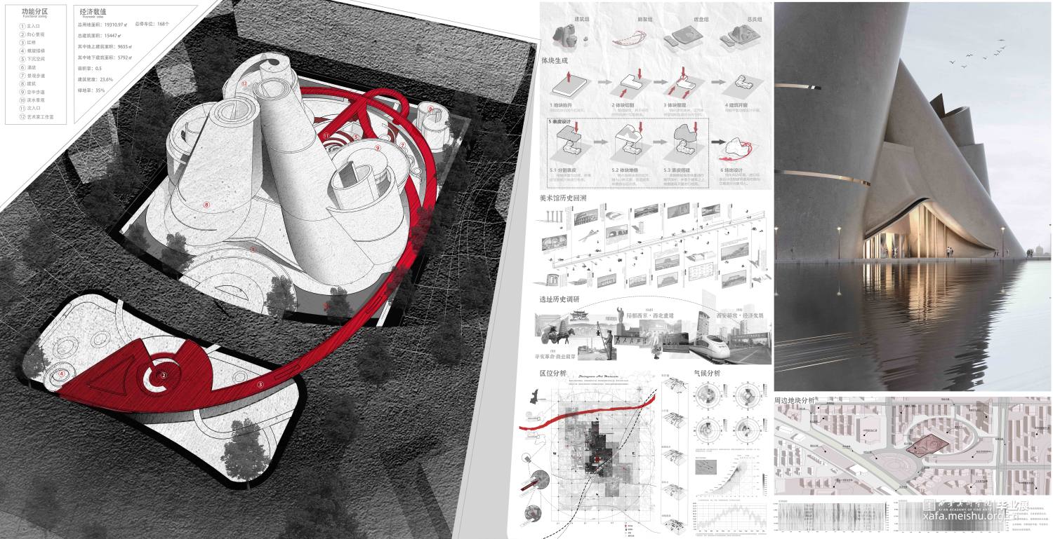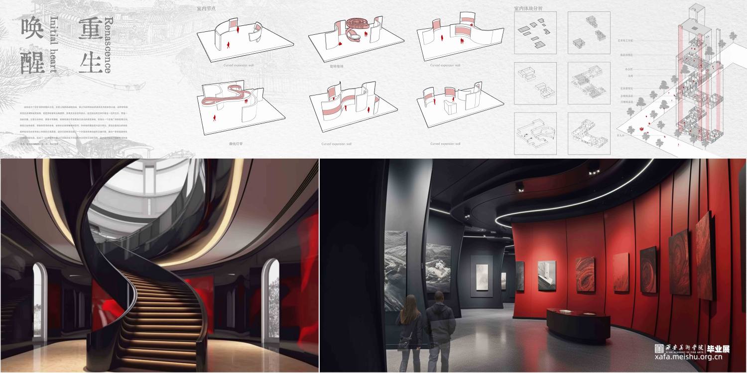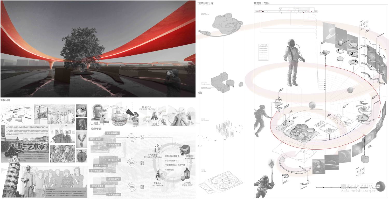 古有“鸭头新绿- 水,雁齿小红桥”,张说于红桥之上授人以歌。画家张择端绘制的《清明上河图》描绘了围绕着不同类型的桥发生的人们的市井生活氛围。“桥”围绕了紧密的商业和文化生活。本设计用红桥串联起建筑、景观、室内设计,象征着文化将得到一代又一代的传承。用同心圆延伸的形式体现出现代艺术家推陈出新的发展方向,走在前人铺垫的桥面上,持续将文化和艺术授之于人,同时又希望在此处能找回初心和属于自己的那份传承。