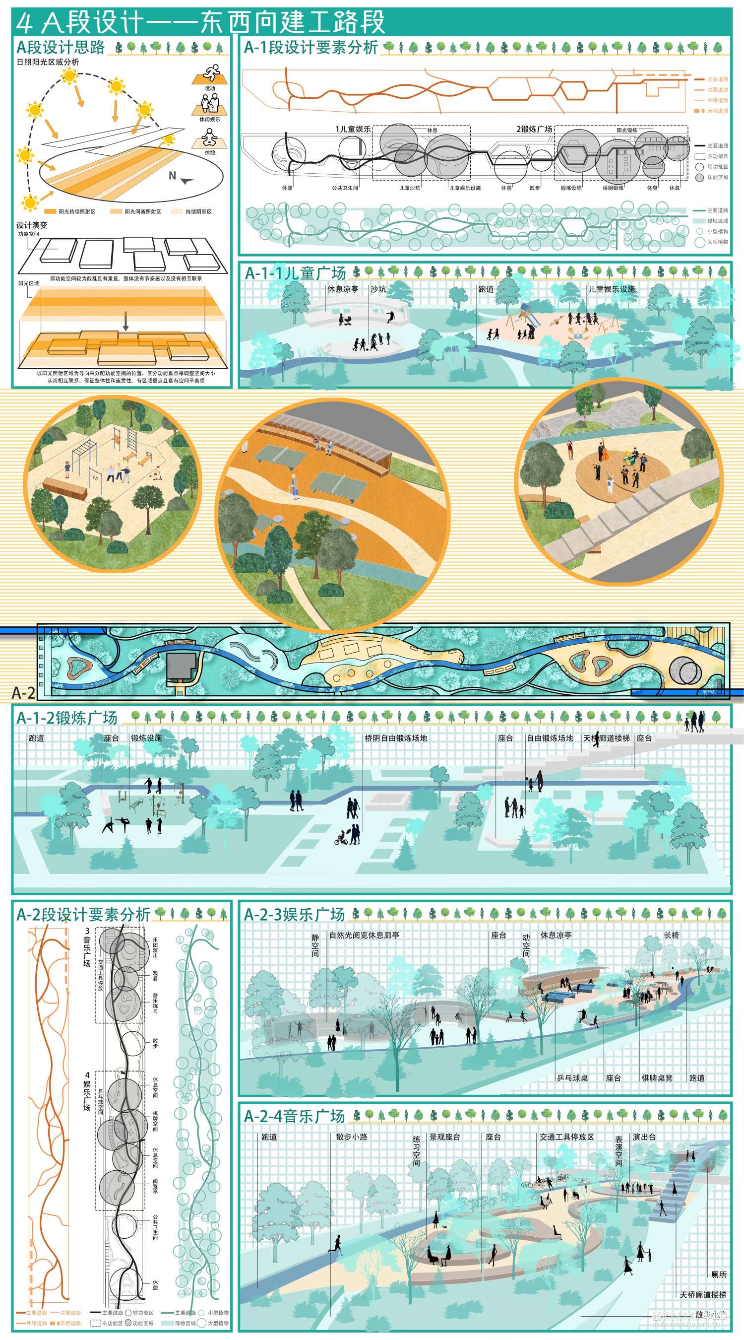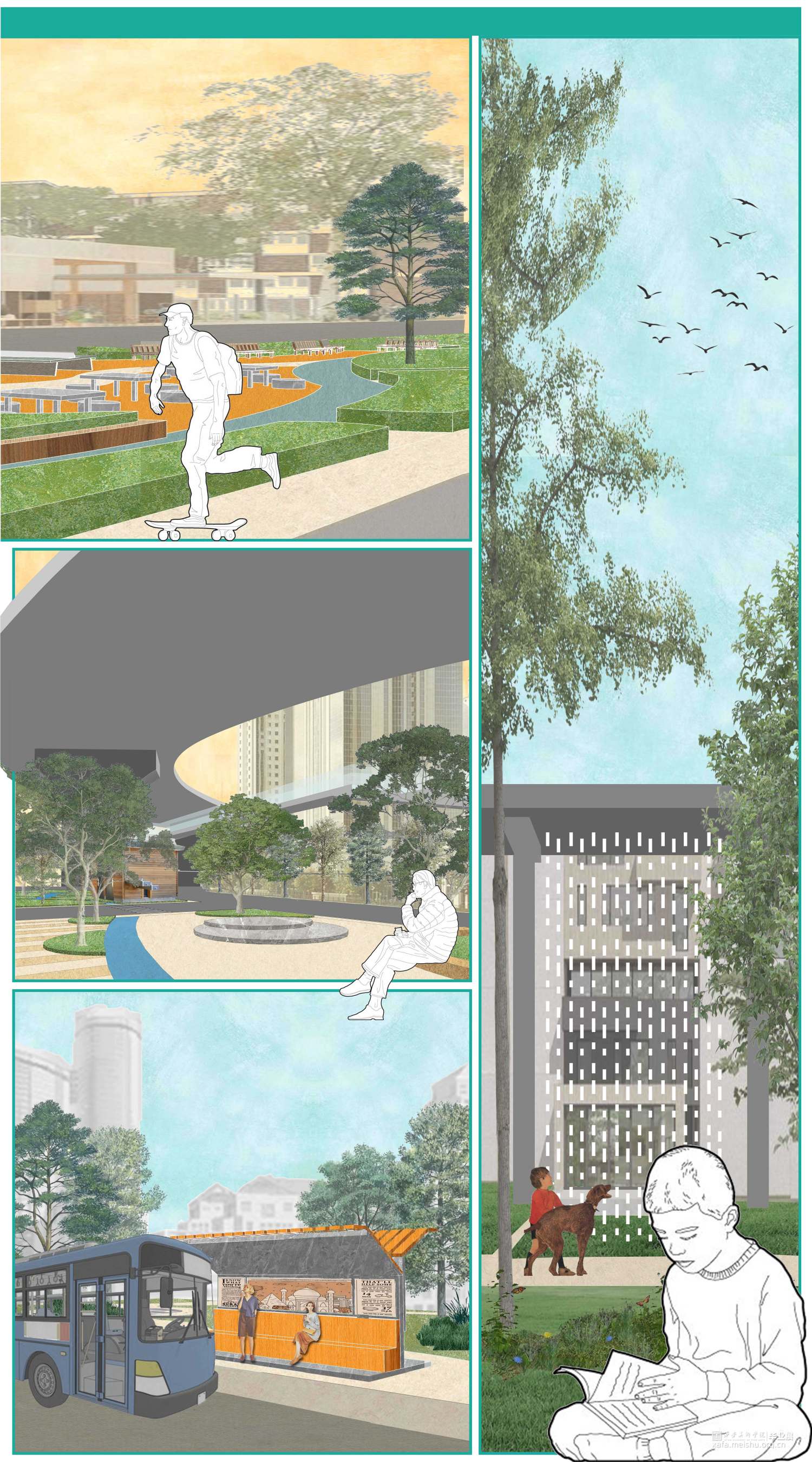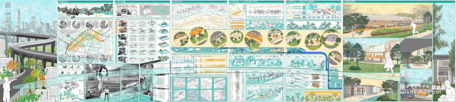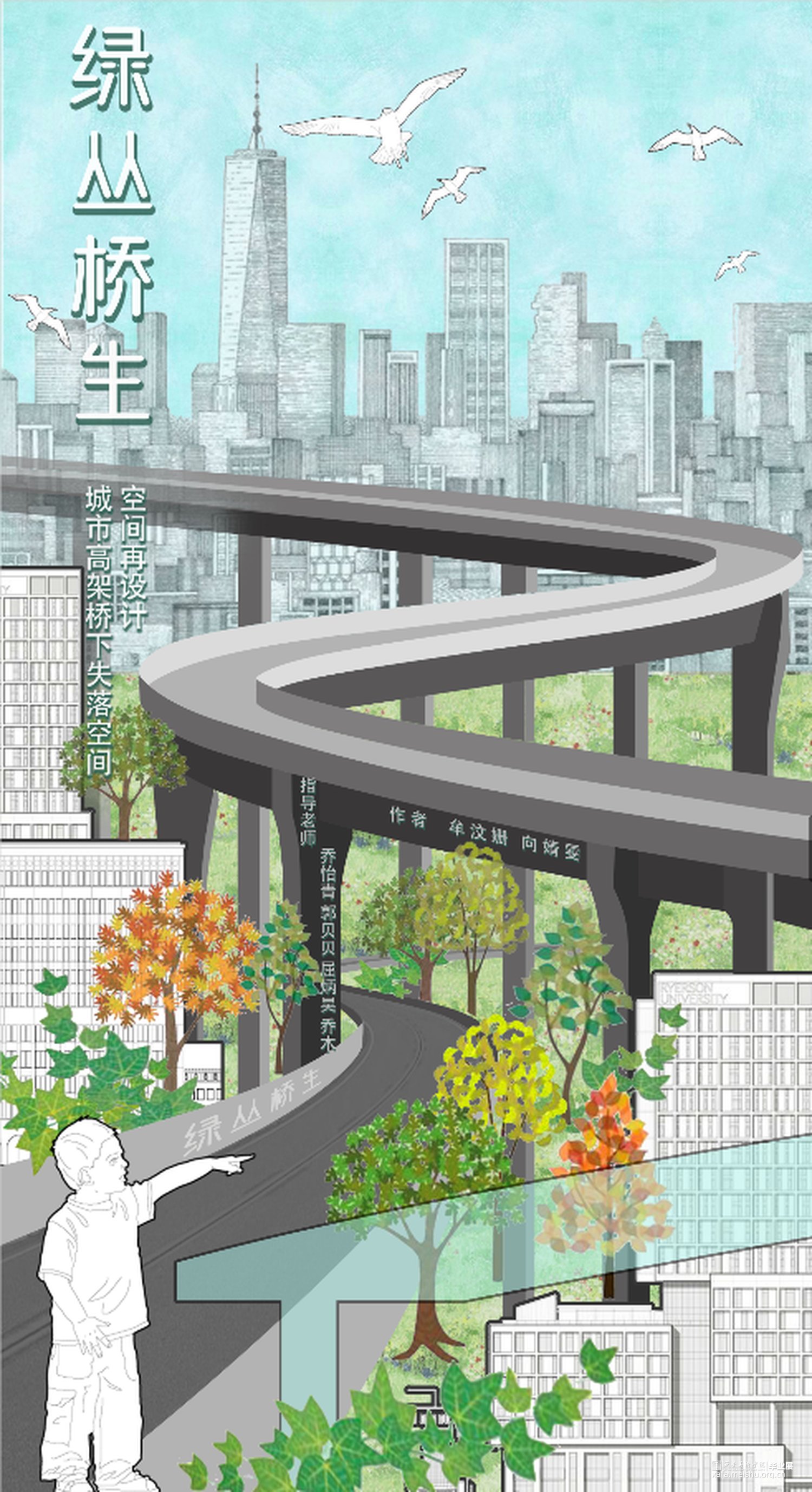 主要研究建工路、长鸣路高架桥桥下空间的设计提升,具体包括建工路高架桥下的绿带公园改造、长鸣路高架桥下空间设计、高架桥交汇处桥下空间的视觉景观设计。以“绿丛桥生”为主题,从生态绿与生活绿两方面进行改造和设计桥下空间,增加自然与人的生机与活力,使城市高架桥下的失落空间具有实用意义和精神价值。