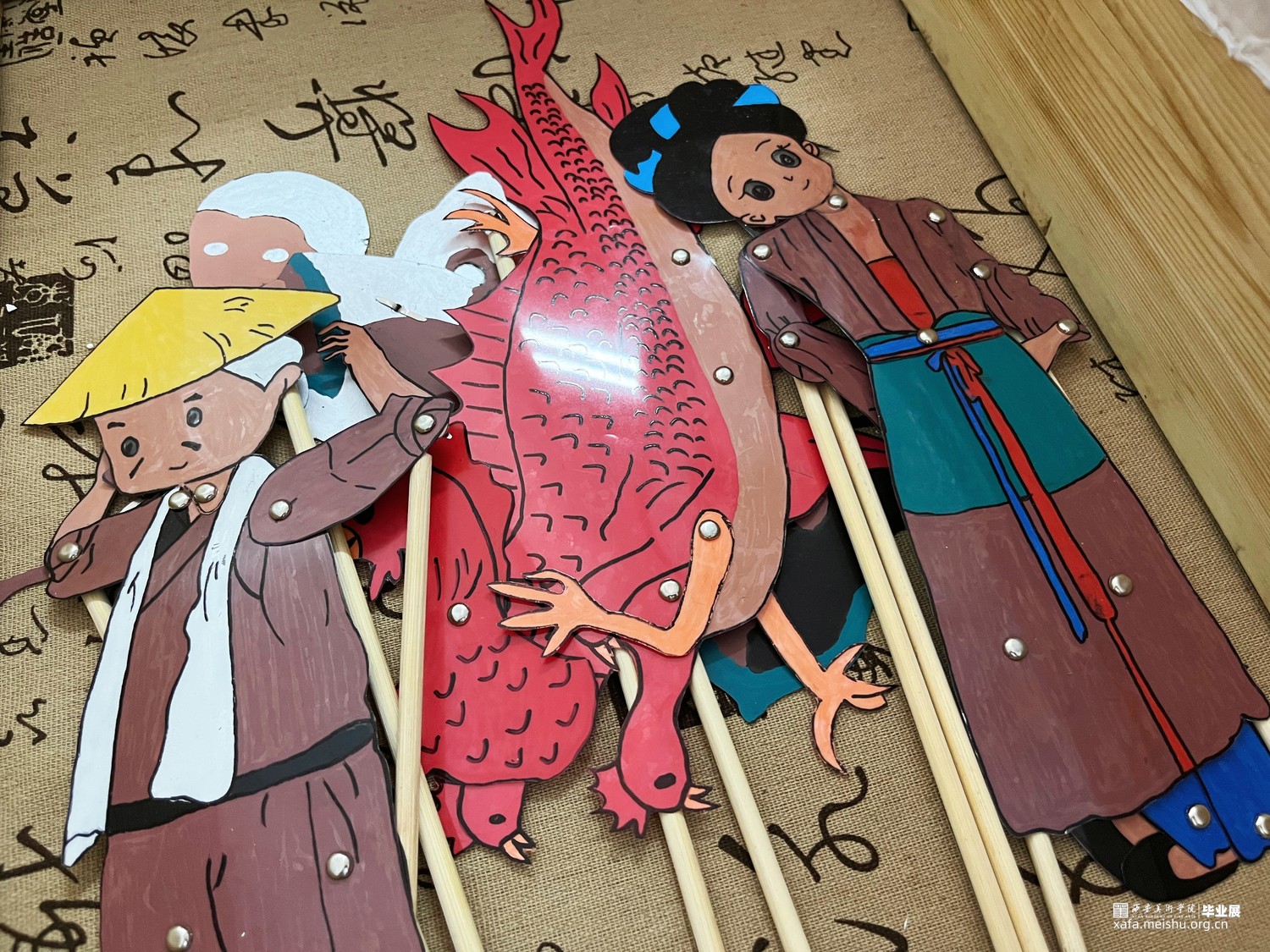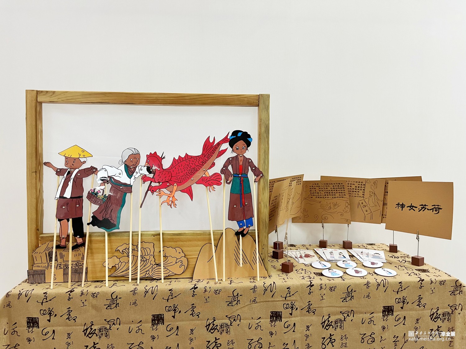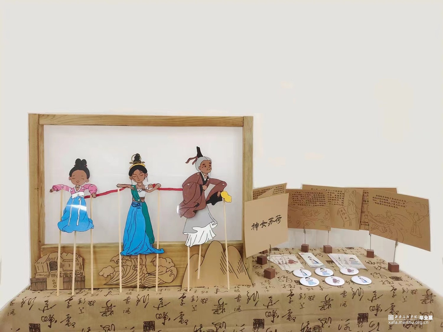 皮影戏是中国民间古老的传统艺术,通常是以兽皮或纸板做成人物剪影以表演故事。本次作品别出心裁,创作出全新故事《神女苏荷》,并用菲林片来制作皮影,丙烯马克笔进行上色,展现出不一样的皮影。同时,配上简洁的图画书,让儿童更容易了解故事从而演出生动的皮影戏。另外,作品加入了书签、钥匙扣、徽章等一系列文创,以实现传统和现代文化的交融。