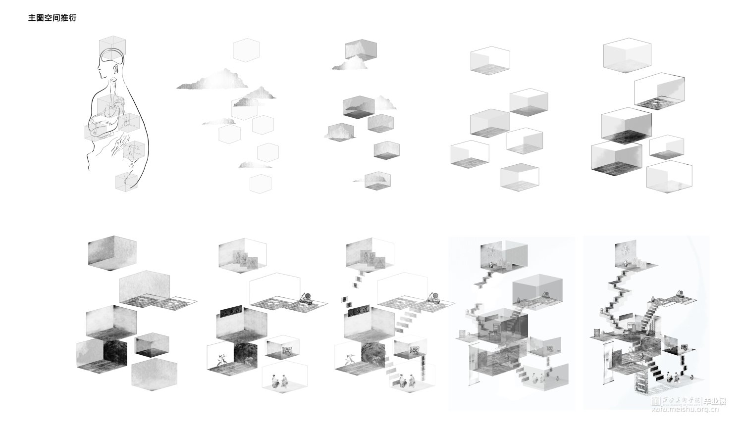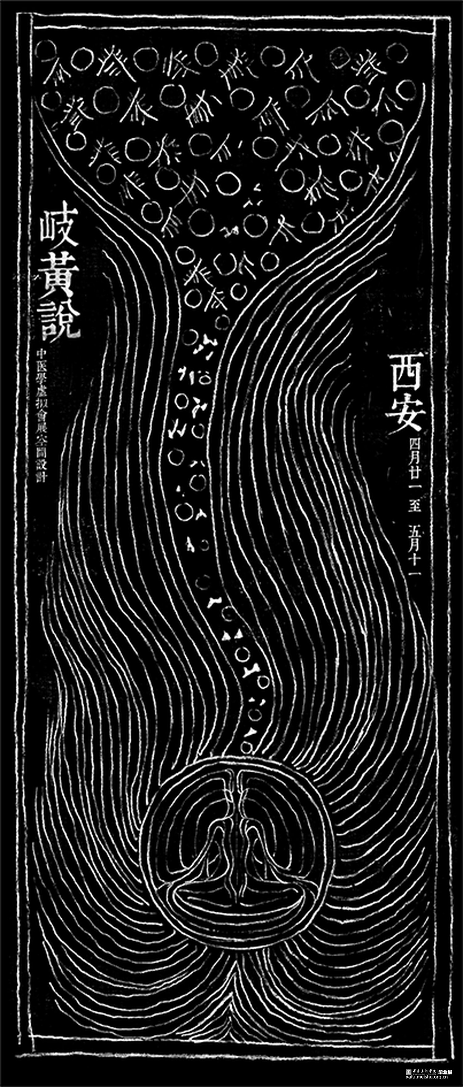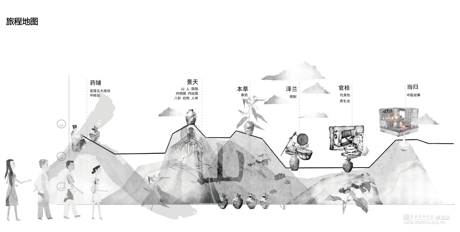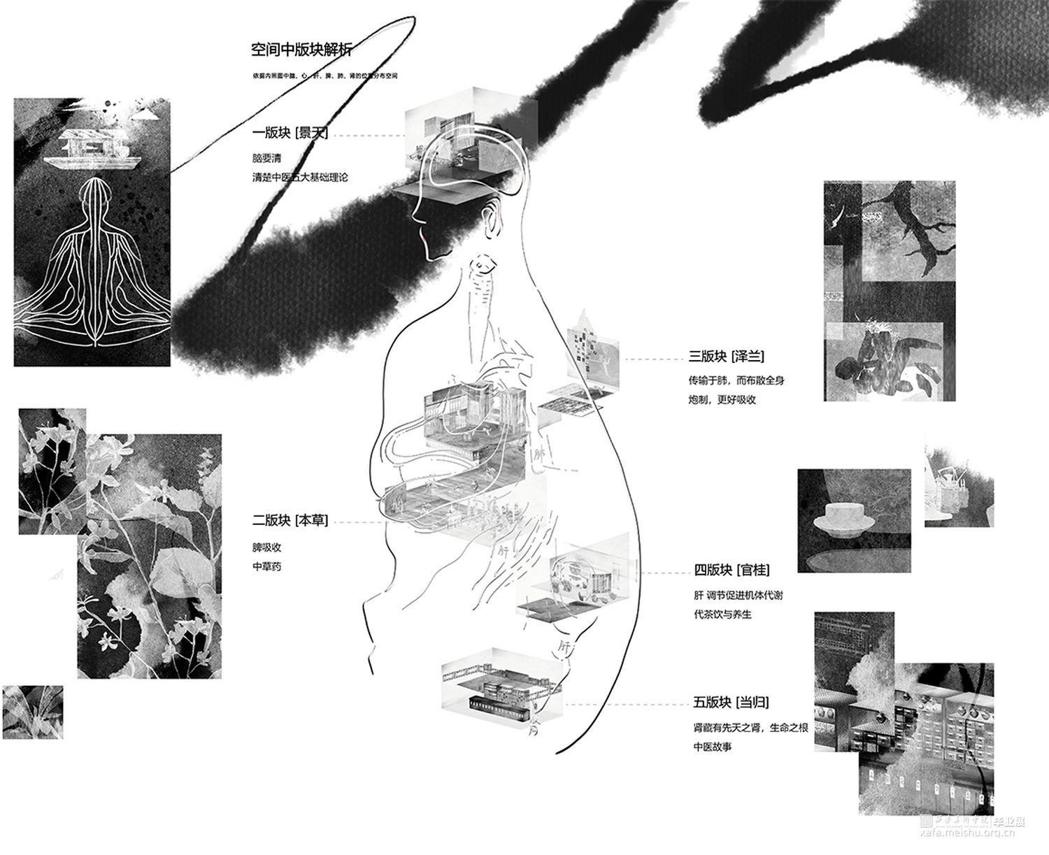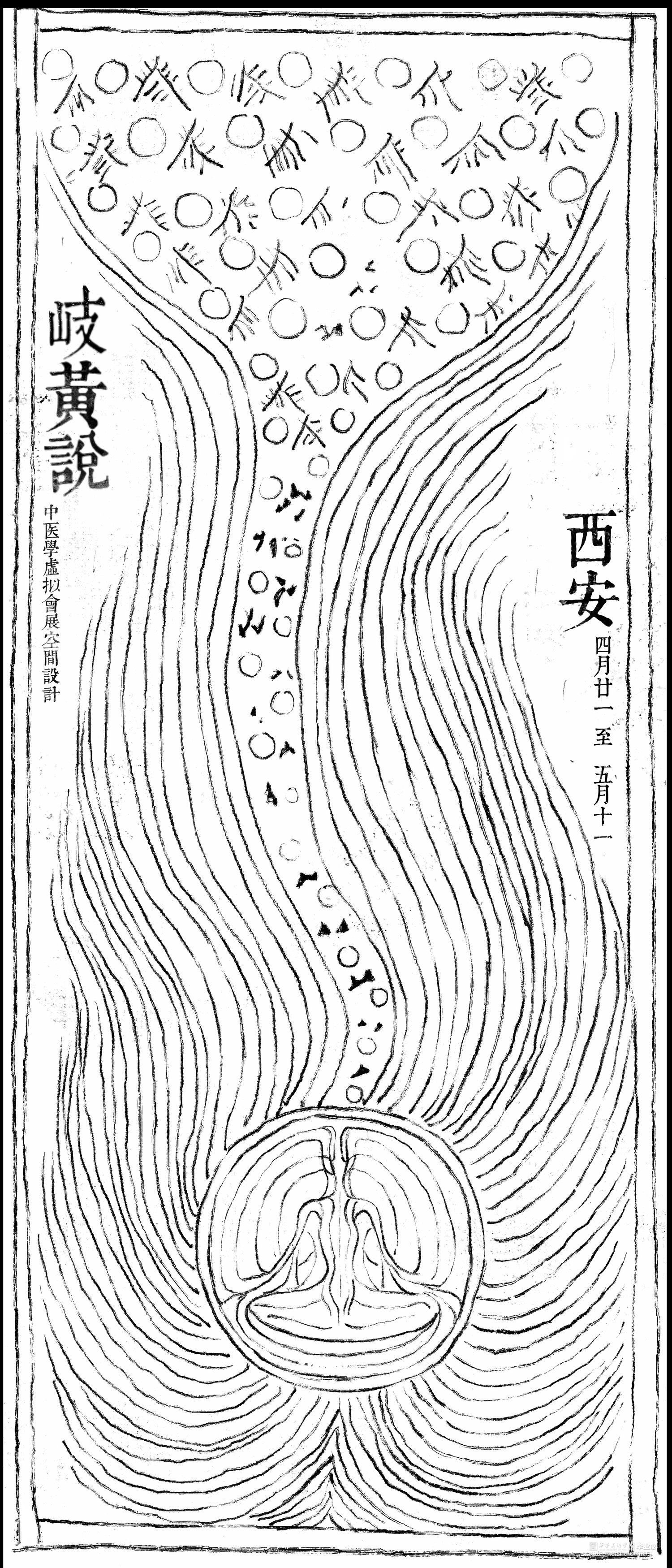以一版块为例:整体空间将五大学说意向化为两个场景,一场景:山、人、阴阳,体现经络学说、形神学说、阴阳学说、天人学说;二场景:内照图、内经图,体现藏象学说。