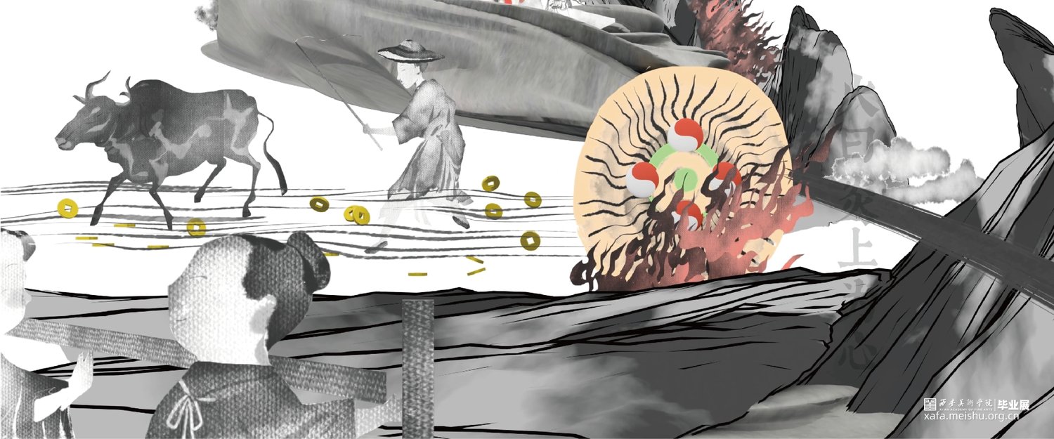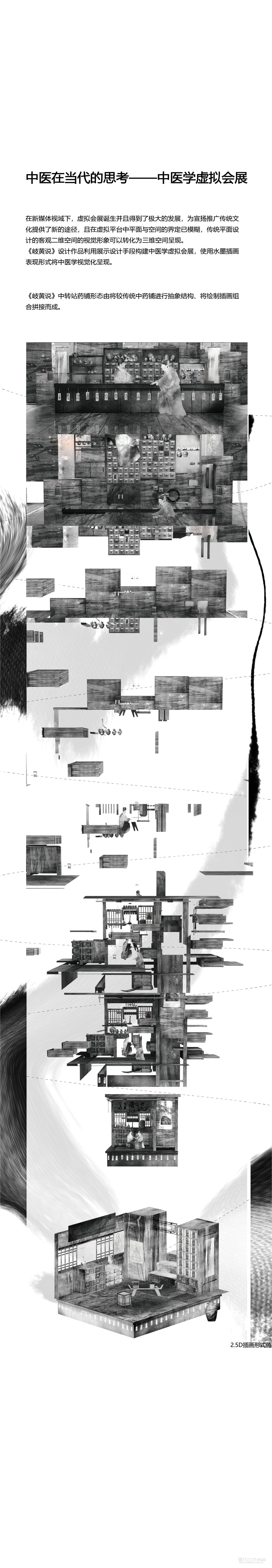 《岐黄说》是一个以2.5d插画形式做的中医学虚拟展示空间,利用网络平台将板绘平面插画与空间进行结合——水墨插画作为空间表现技法与呈现方式,实现由“静”到“动”,由平面插画到立体空间的转变,并通过动态影音展示手法展示医五大理论基础:阴阳学说、藏象学说、经络学说、形神学说、天人学说。意旨让人们了解中医理论基础,体现中医思想中天人合一的理念、人是整体的思想,从而呼吁、宣扬中医文化。