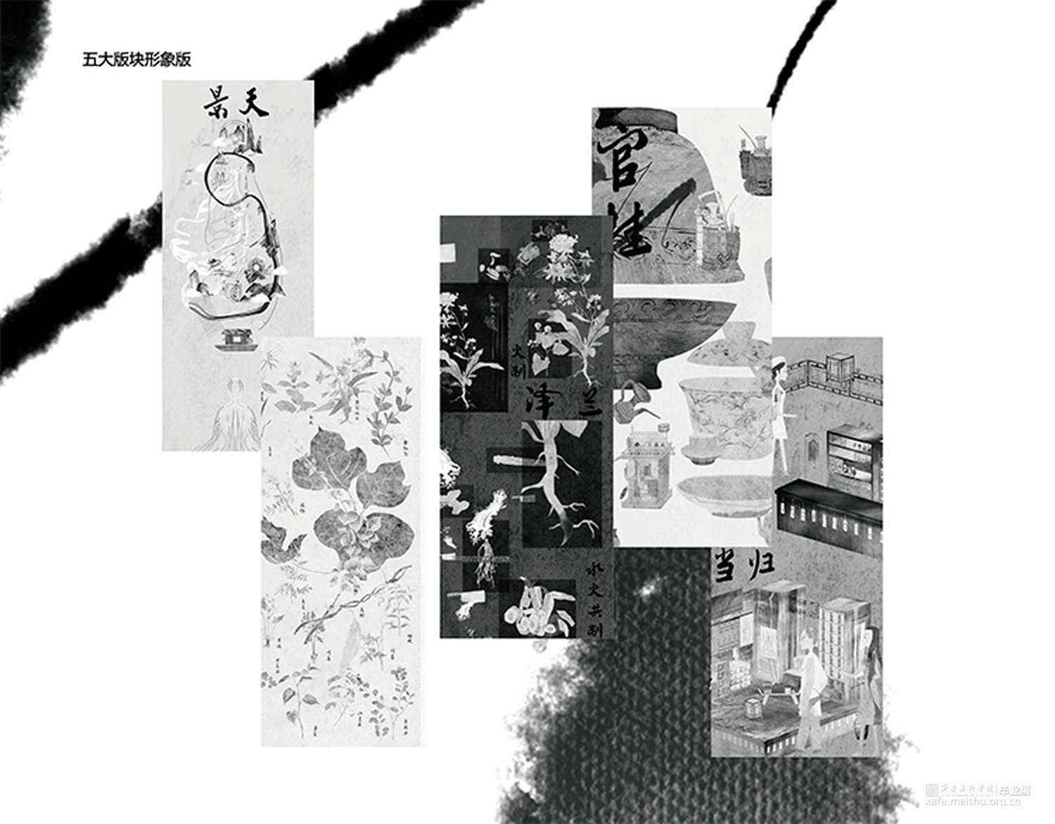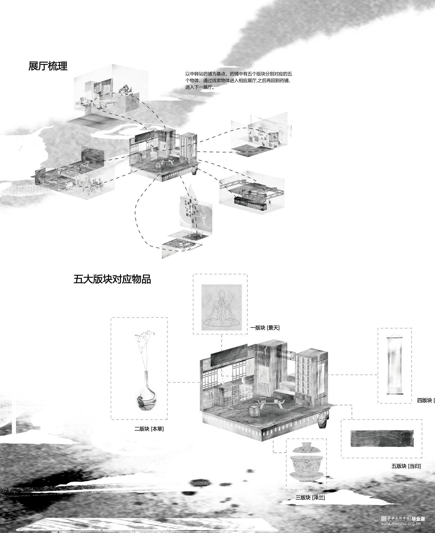 二三四五版块内容分别为:中草药的展示科普、中医炮制方式、中医与茶文化、中医在当代,版块内容制作为插画空间,并以视频形式进行展示与科普。