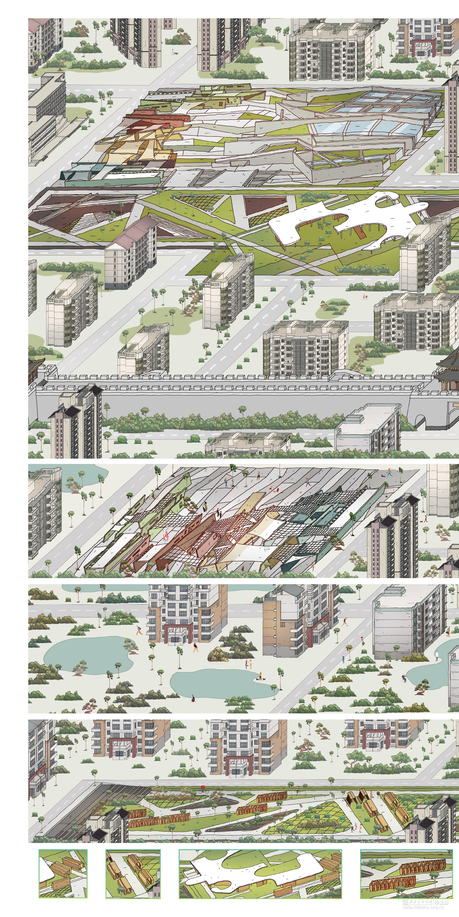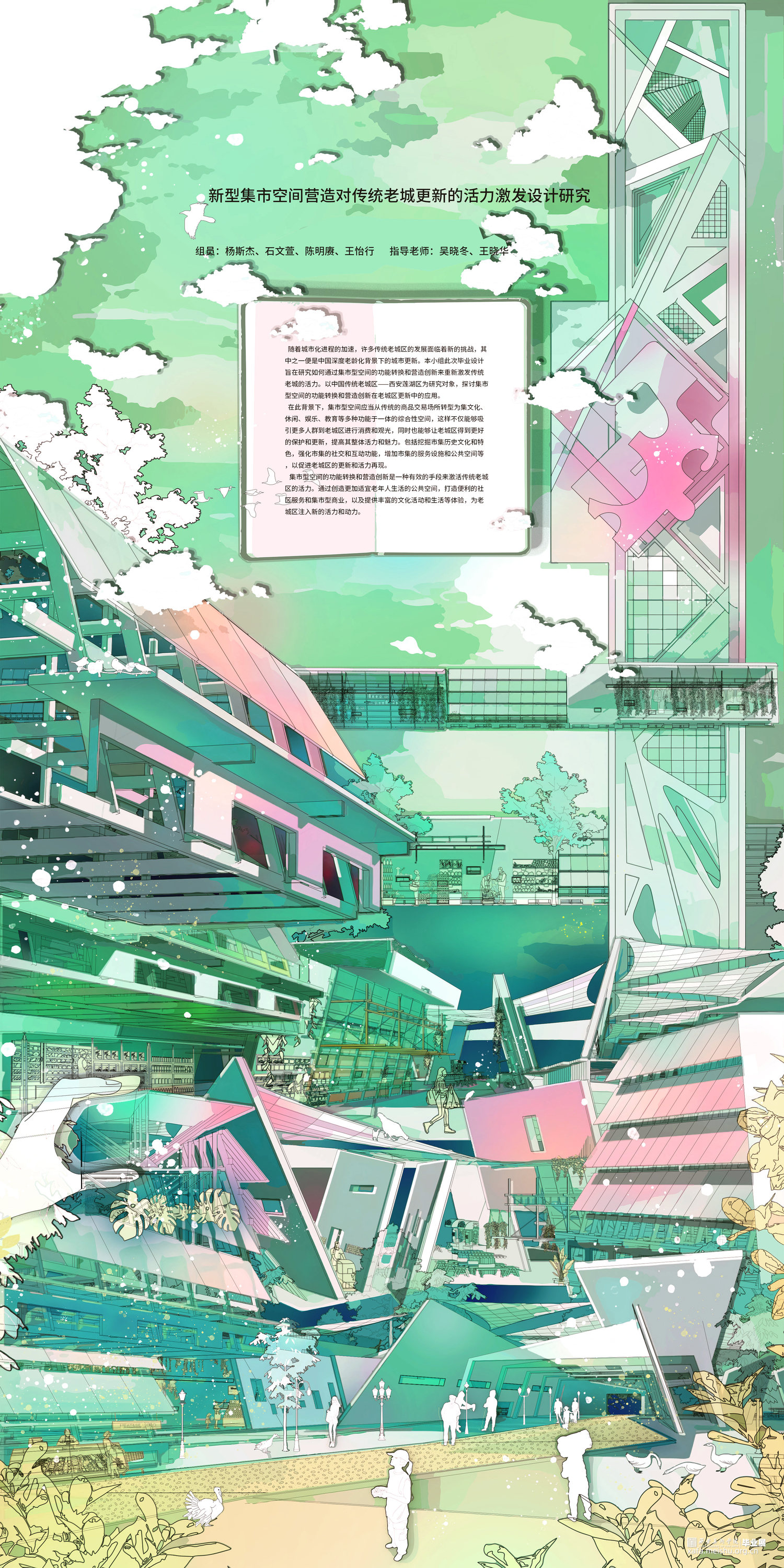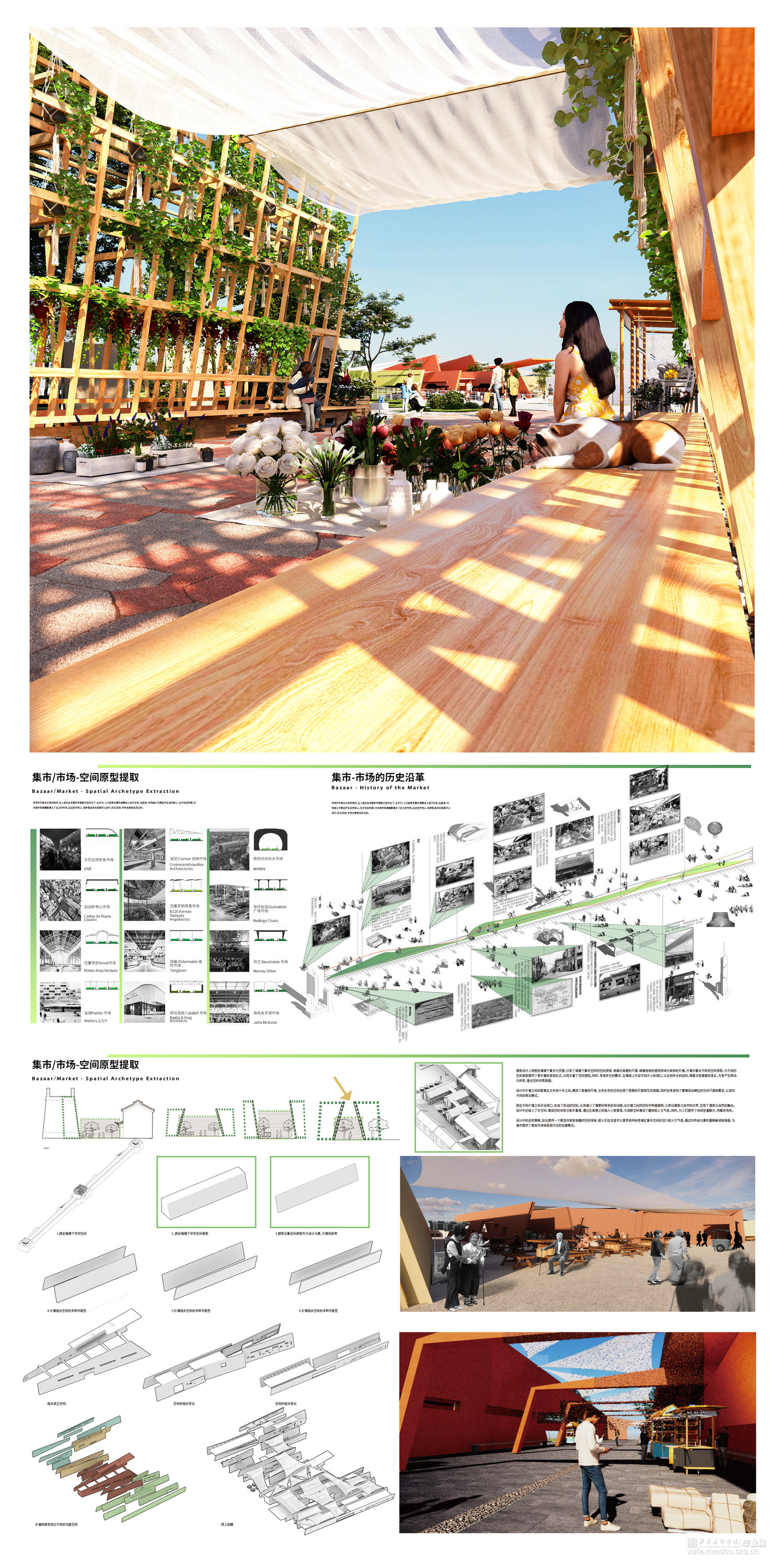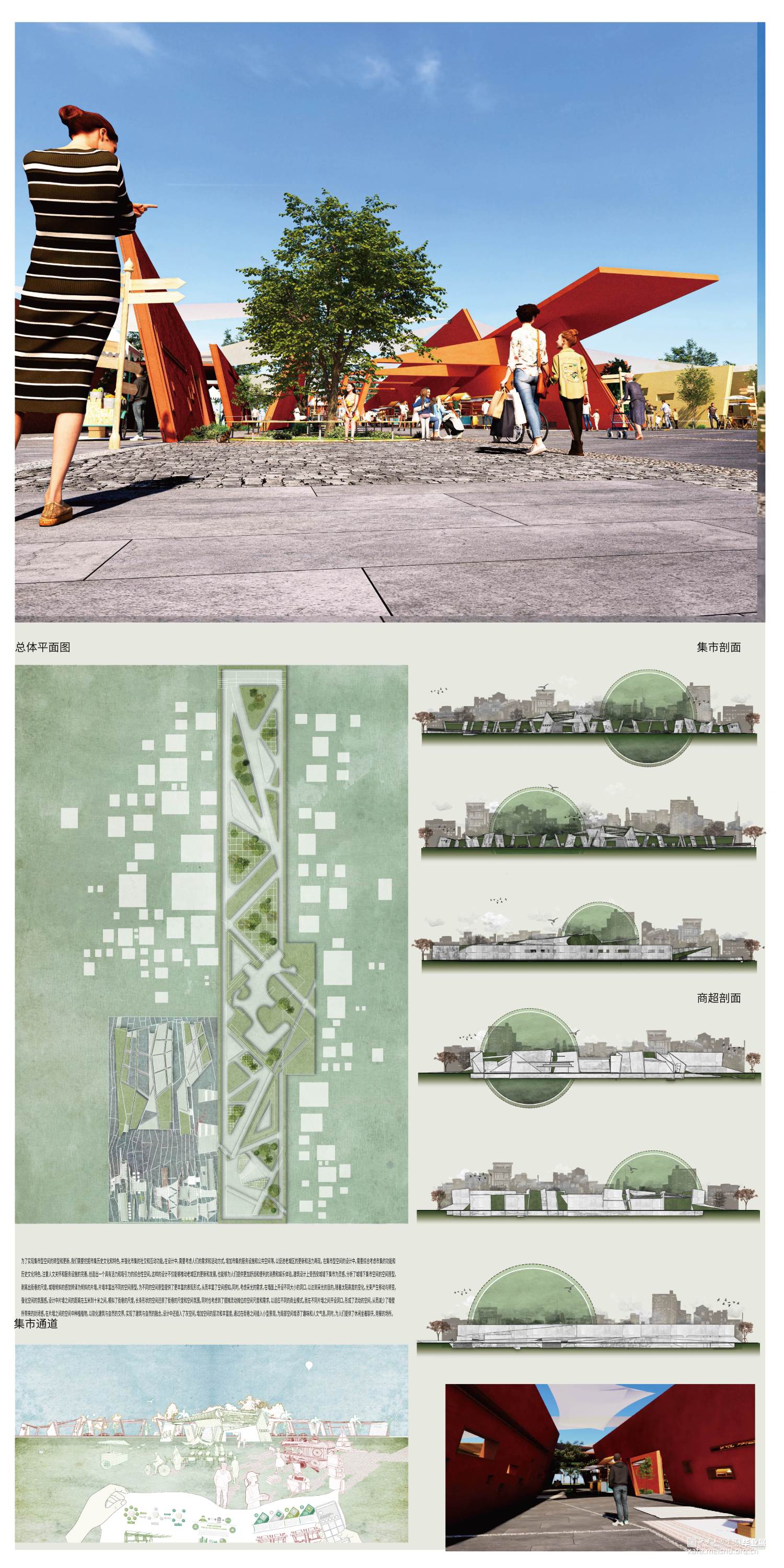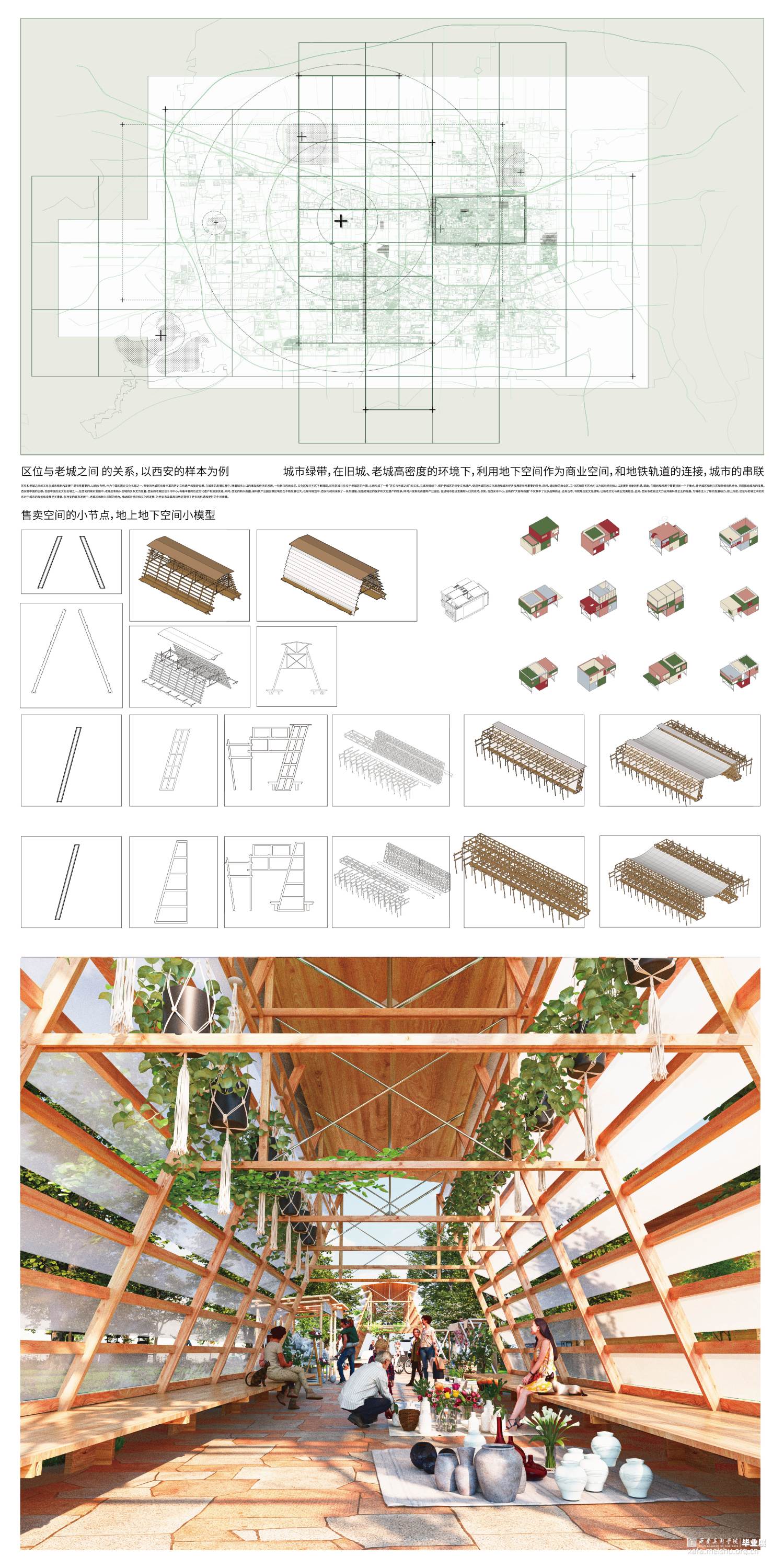 为了实现集市型空间的转型和更新,我们挖掘了市集历史文化和特色,并强化市集的社交和互动功能。在设计中,需要考虑人们的需求和活动方式,增加市集的服务设施和公共空间等,以促进老城区的更新和活力再现。 在集市型空间的设计中,需要综合考虑市集的功能和历史文化特色,注重人文关怀和服务设施的完善,创造出一个具有活力和吸引力的综合性空间。这样的设计不仅能够推动老城区的更新和发展,也能够为人们提供更加舒适和便利的消费和娱乐体验。建筑设计上受西安城墙下集市为灵感,分析了城墙下集市空间的空间原型,剥离出街巷的尺度,城墙倾斜的感