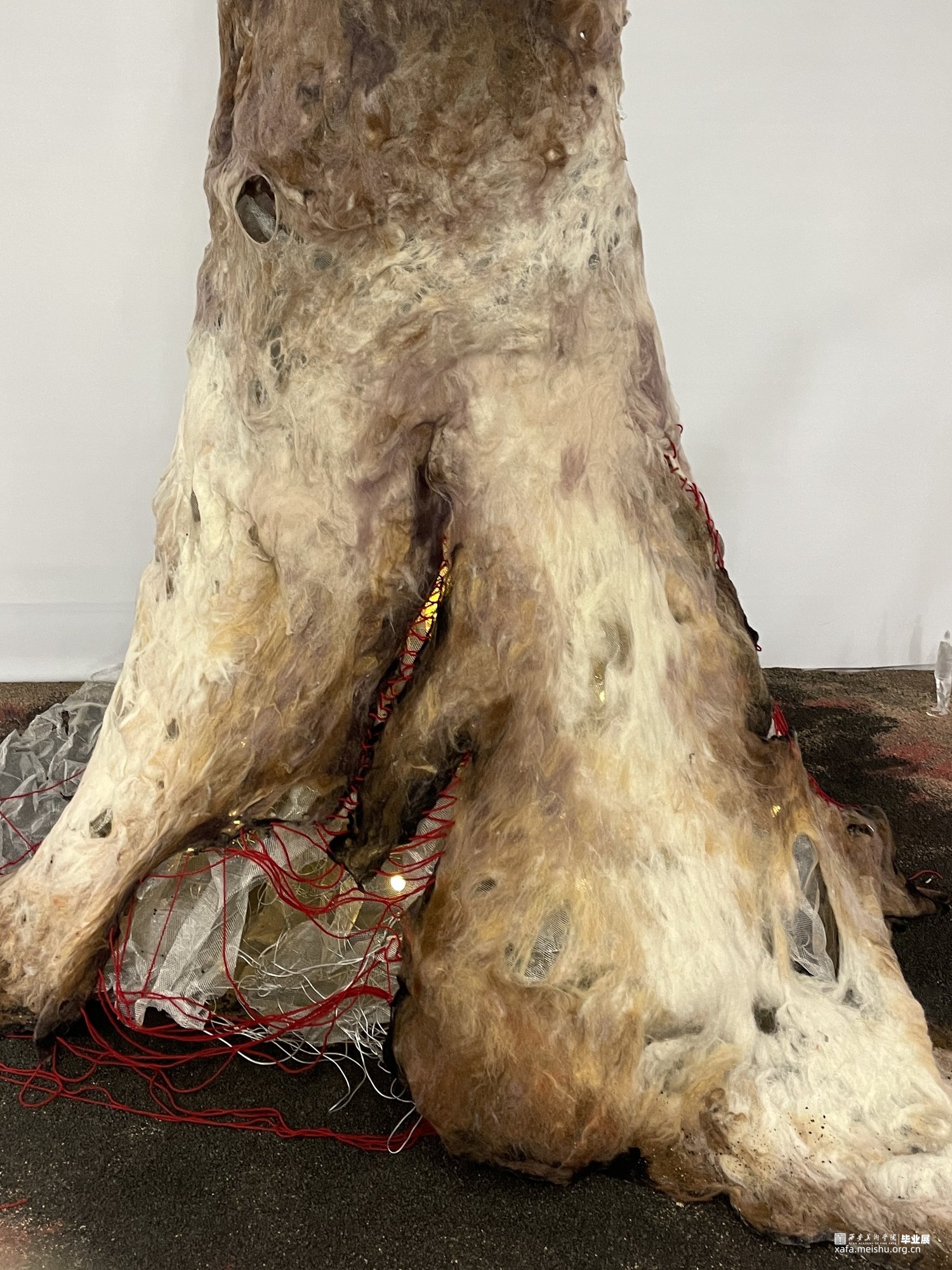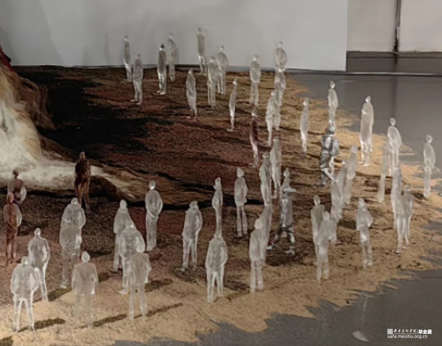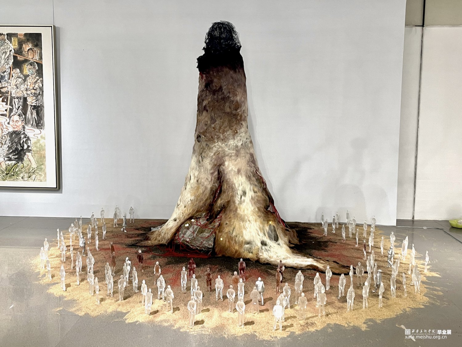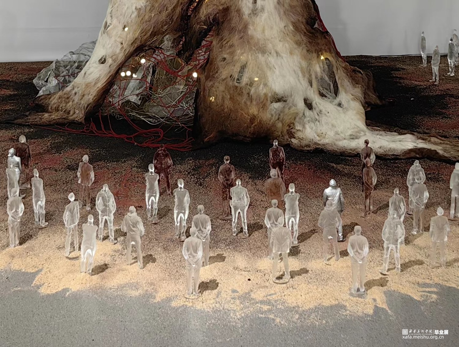 社会环境下每个人都有不同程度的焦虑,作品通过对当下社会中个体的焦虑创伤衍生到社会群体的焦虑创伤来构建的一件装置艺术作品。作品灵感来于巴别塔,主体呈塔型,灵感来源于残破的巴别塔,主体为人形,残破的正在燃烧的衣物代表着创伤,作品主色调采用深红色、深棕色渐变到藕色、米色,象征着燃烧着的生生不息的瞬间。他隐喻着欲望,破坏,合作,摧毁等等,但也可以是更丰富鲜活的个体。衍生到底下的人群共同构成塔体。群体人物一分为二,正面代表人们对于克服焦虑创伤,对美好未来的向往。背面代表人们对于社会的焦虑创伤的正确面对,适当的焦虑可以促进人们的进步。像人群中银色的小人直面困难与焦虑。呼吁人们正确看待焦虑对于个人成长与发展过程中存在的必要性与意义。
