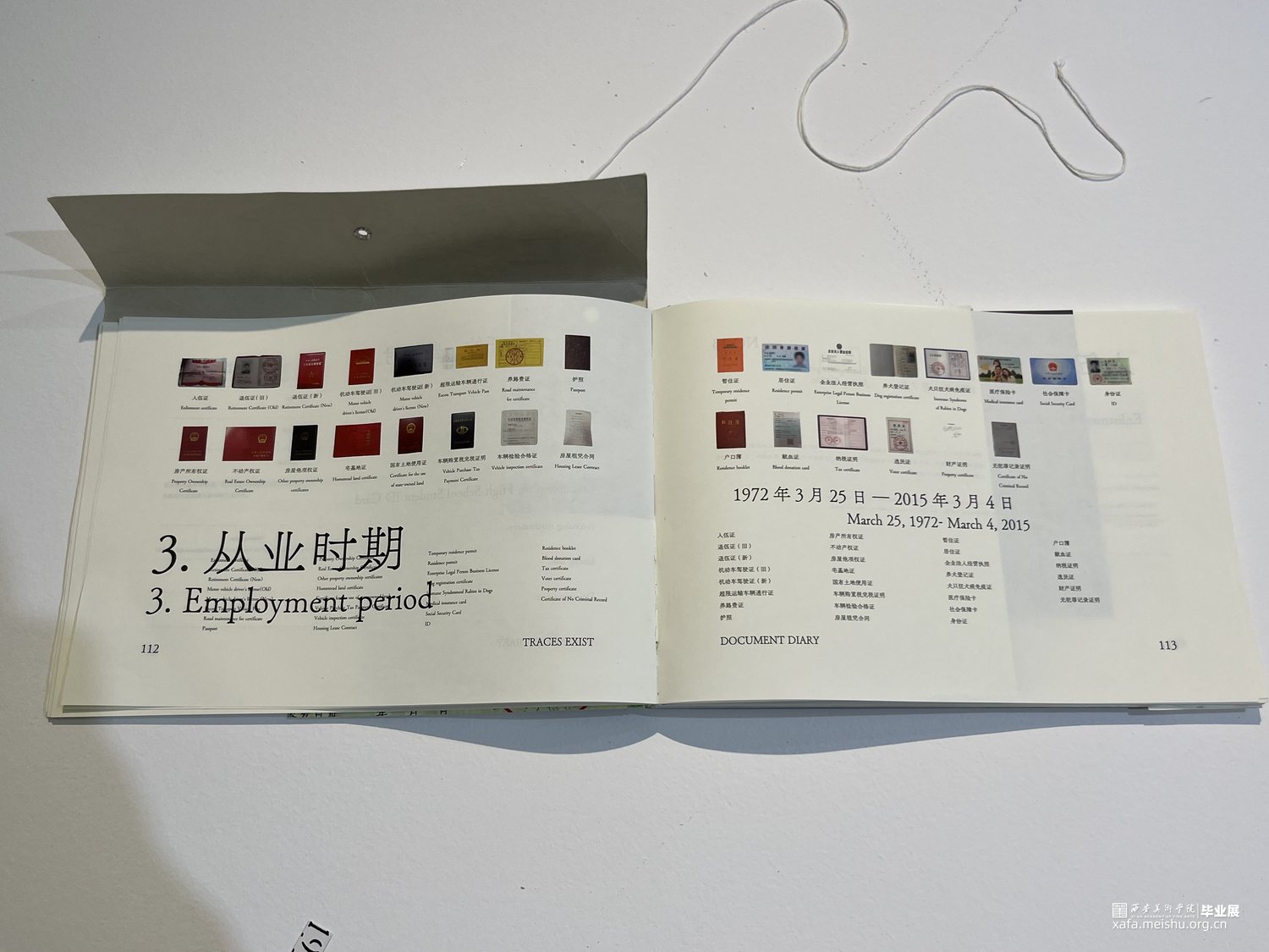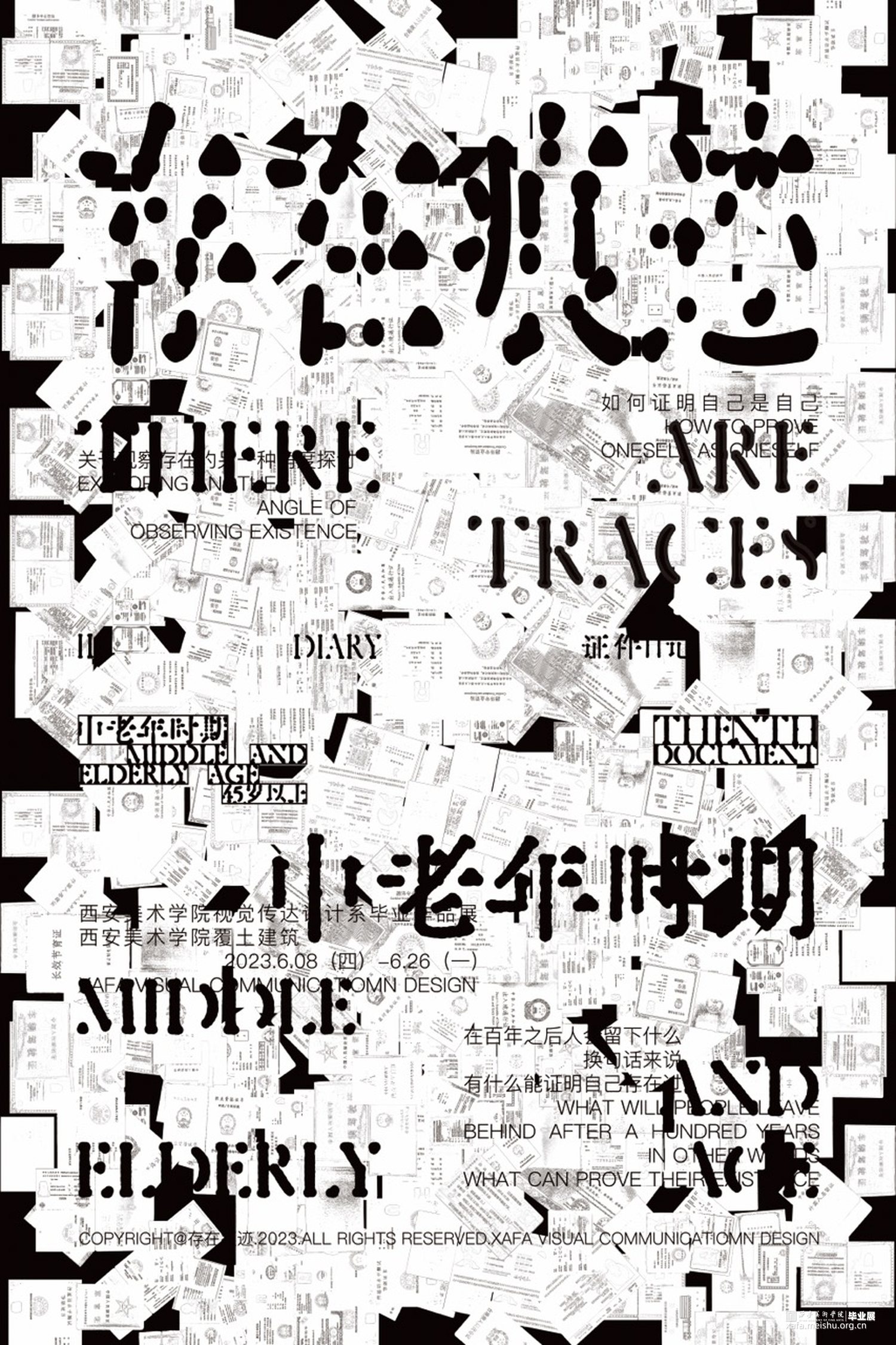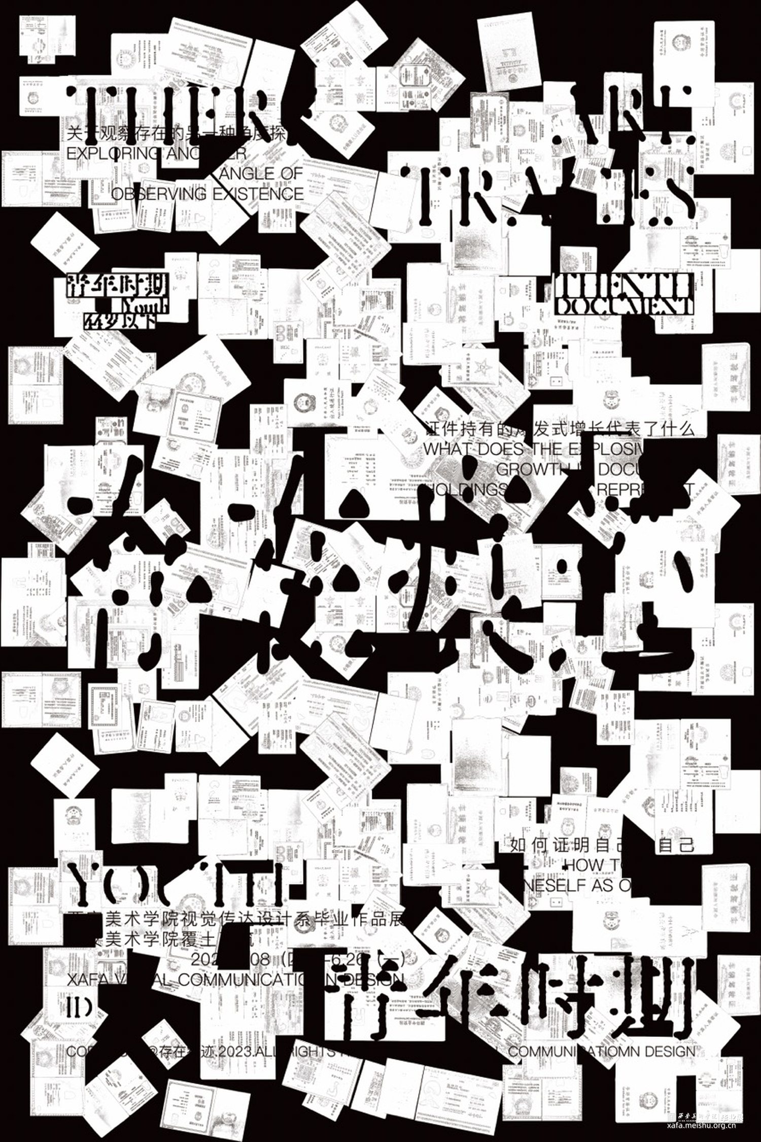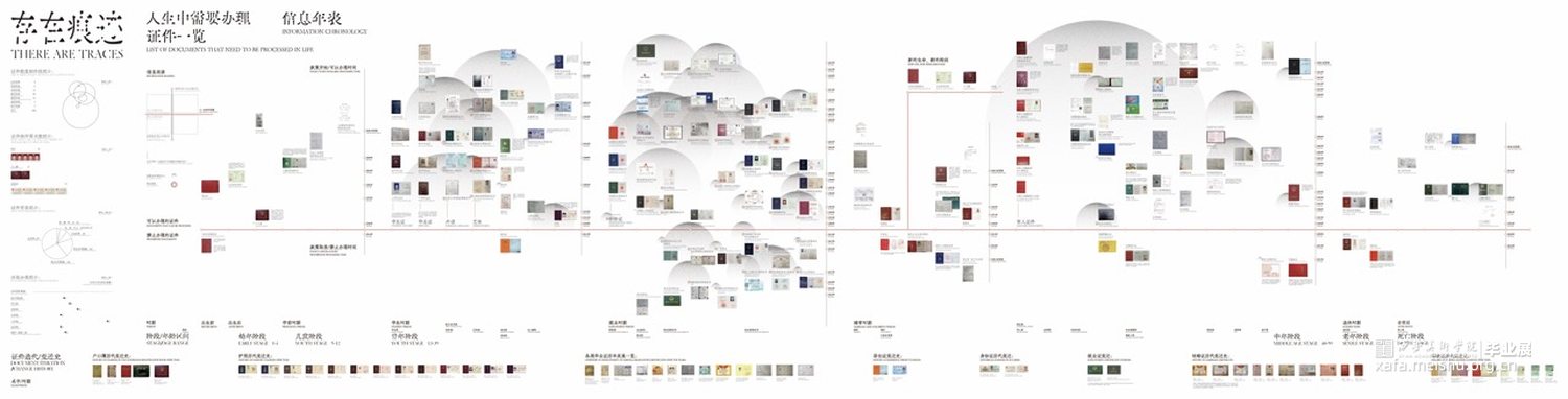 我们用书籍装帧、信息图表、动态视频以及海报等表现手法呈现,在书籍装帧设计中,为了更还原证件的实物感,我们将证件按原比例打印在书籍内,让其变成可以翻动的原比例证件页面,全书包含50个证件,内容上,我们使用虚拟人物“父亲”,以“我”为视角,讲述父亲的一生,并且还讲述了证件的一些故事。在信息图表上,我们将人生常办理的147个证件整合到了三米的长幅内,x轴为人的一生,y轴为可以办理的时间/取消办理的时间,其中还包含了很多信息。视频与海报等设计则是借助了证件,我们将一个证件作为一个“痕迹”单元,随着时期的更变,字体、“痕迹”单元都会随之变化。