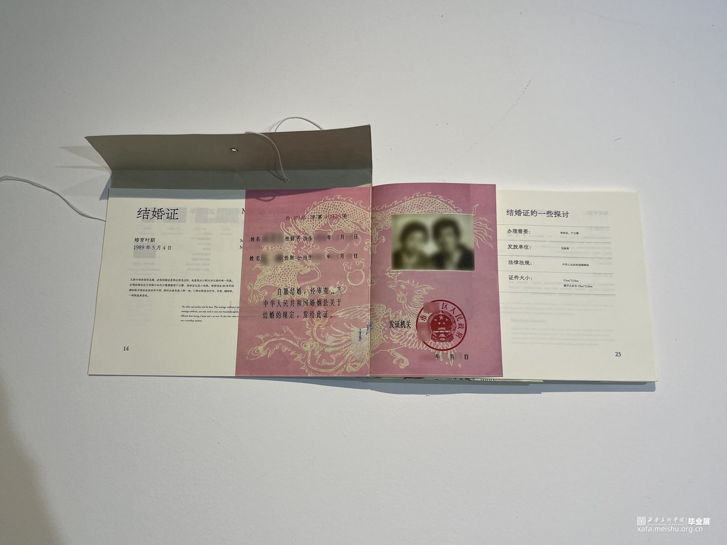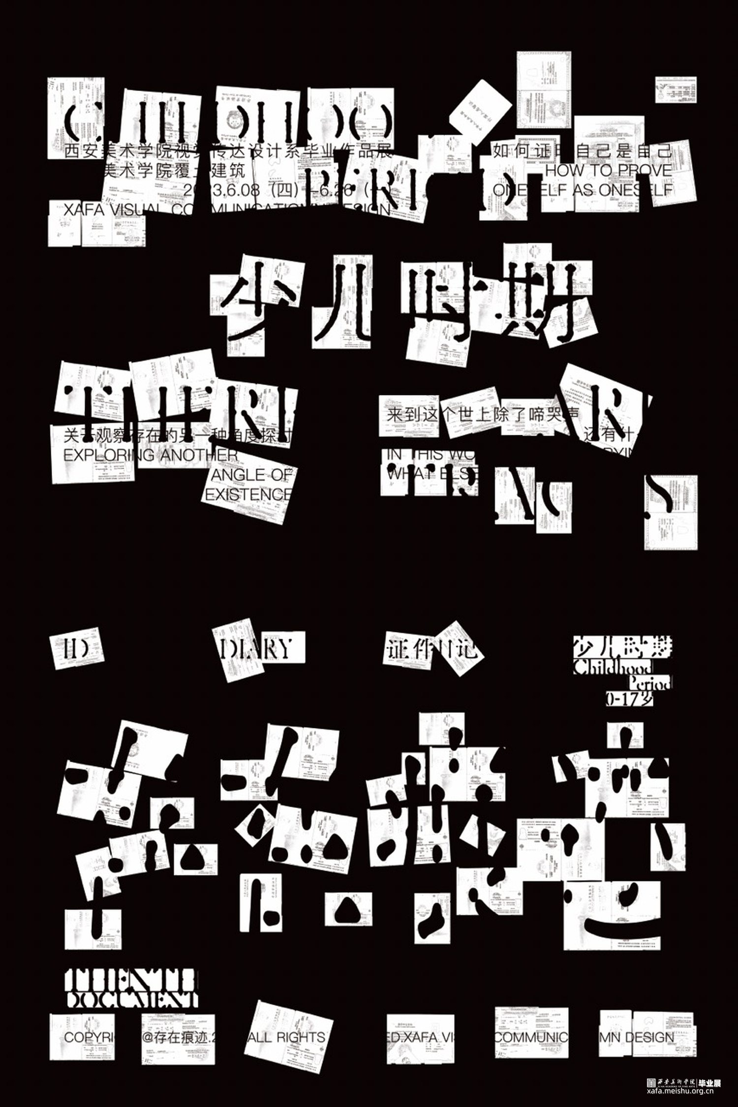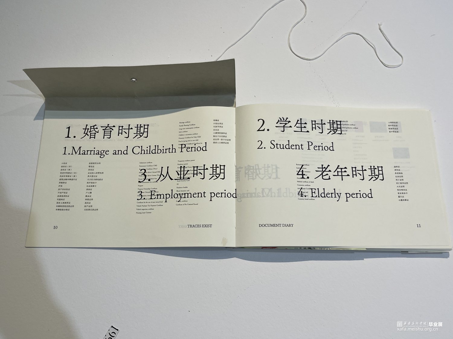 我们用书籍装帧、信息图表、动态视频以及海报等表现手法呈现,在书籍装帧设计中,为了更还原证件的实物感,我们将证件按原比例打印在书籍内,让其变成可以翻动的原比例证件页面,全书包含50个证件,内容上,我们使用虚拟人物“父亲”,以“我”为视角,讲述父亲的一生,并且还讲述了证件的一些故事。在信息图表上,我们将人生常办理的147个证件整合到了三米的长幅内,x轴为人的一生,y轴为可以办理的时间/取消办理的时间,其中还包含了很多信息。视频与海报等设计则是借助了证件,我们将一个证件作为一个“痕迹”单元,随着时期的更变,字体、“痕迹”单元都会随之变化。