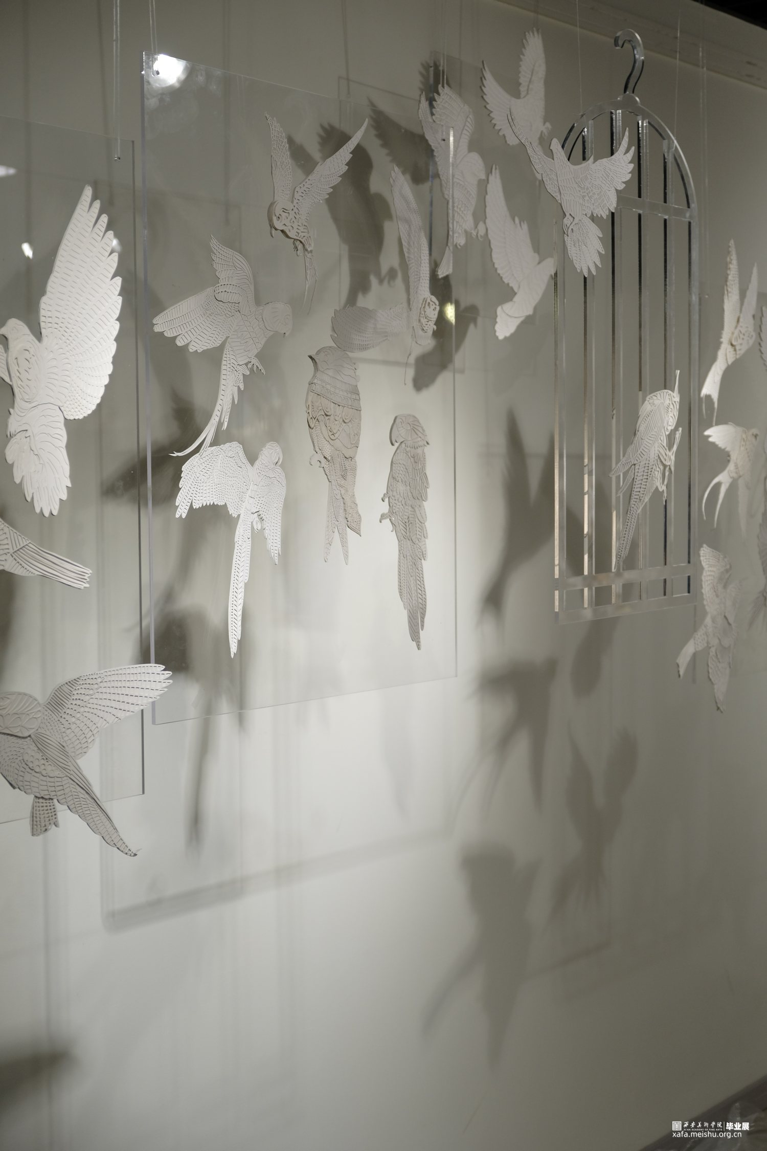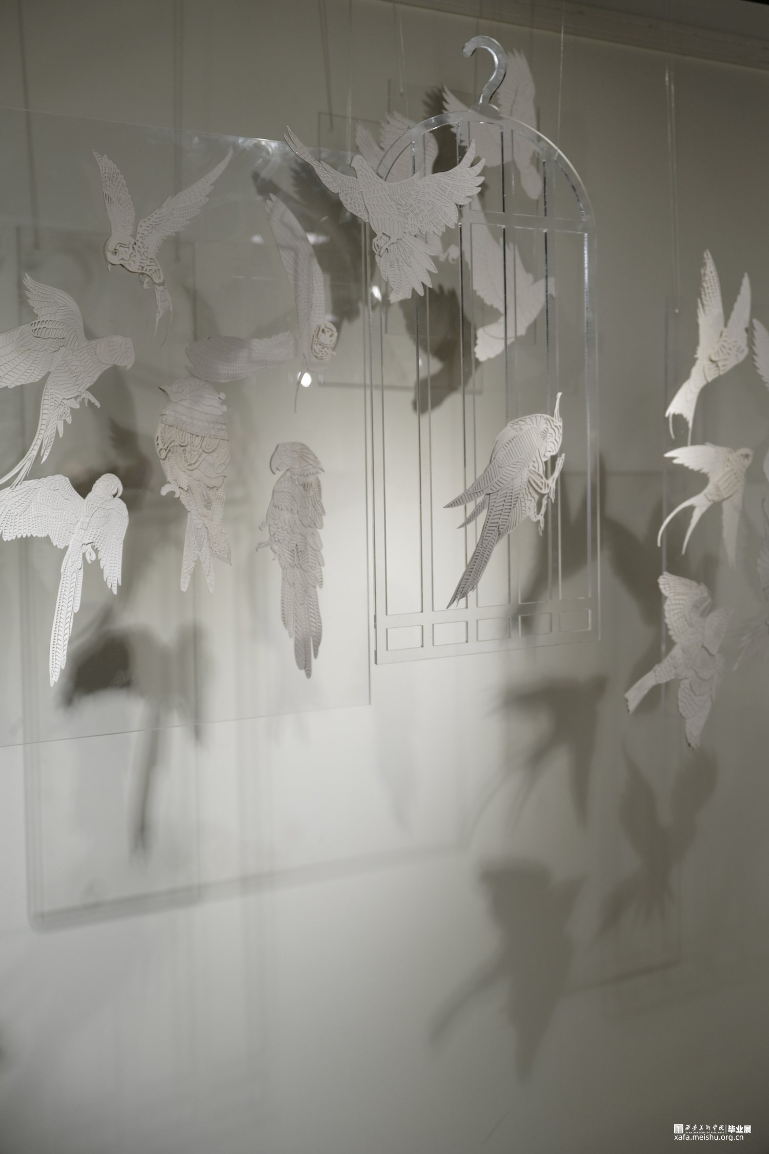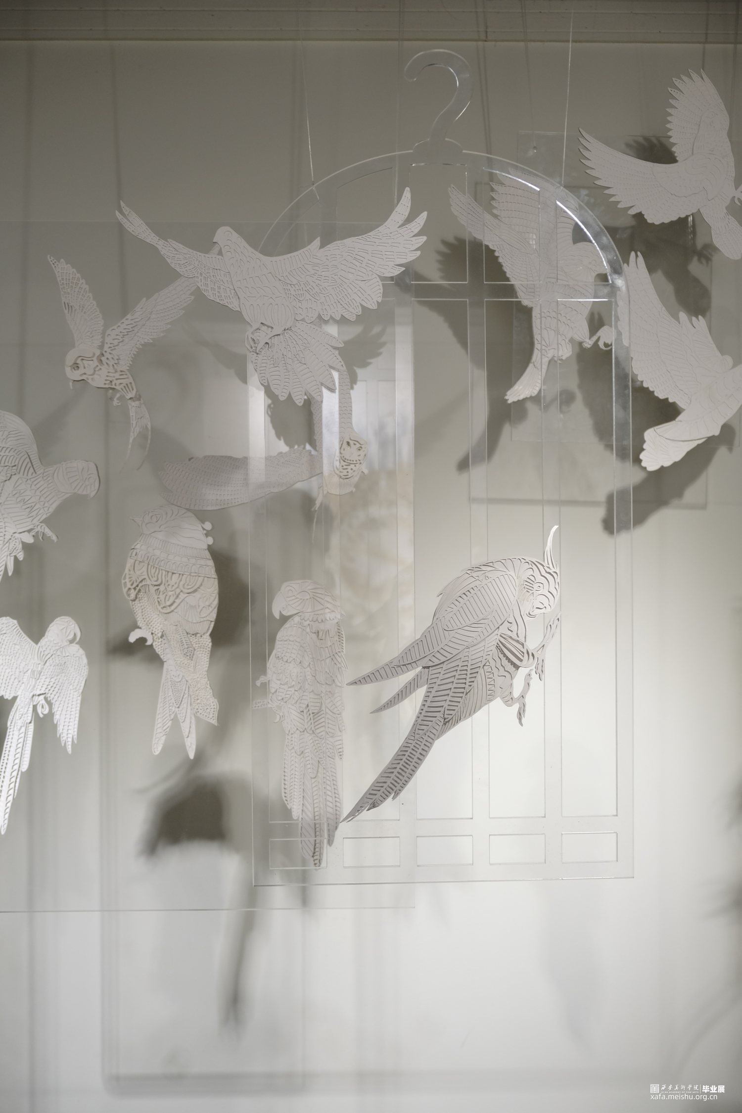 材料:卡纸 工艺:纸雕 设计说明:《肖申克的救赎》说:“有一种鸟儿是永远也关不住的,因为它们的每片羽毛都闪着自由的光辉。”本作品旨在表达不要被事物羁绊着我们的生命,我们要像鸟儿一样,不被定义,不再依赖。