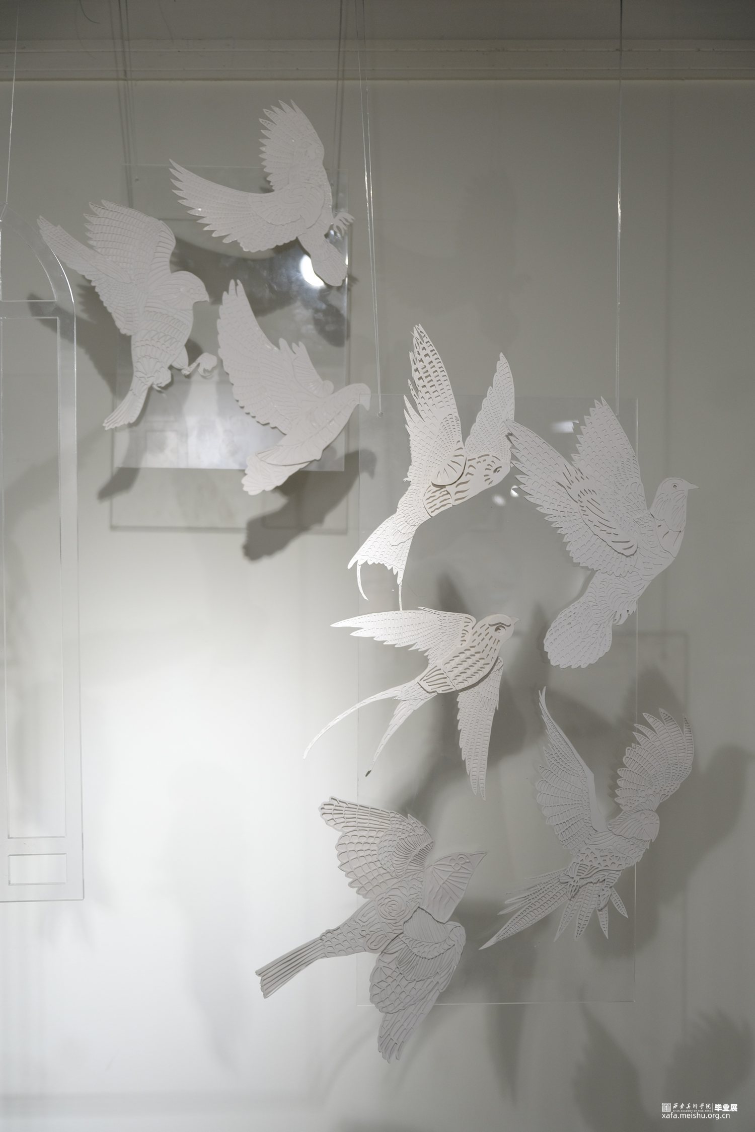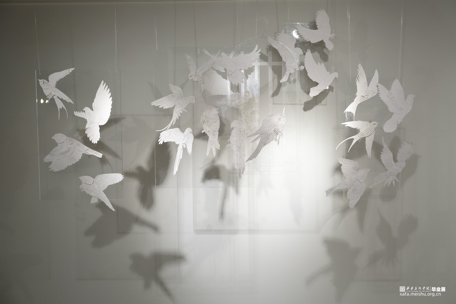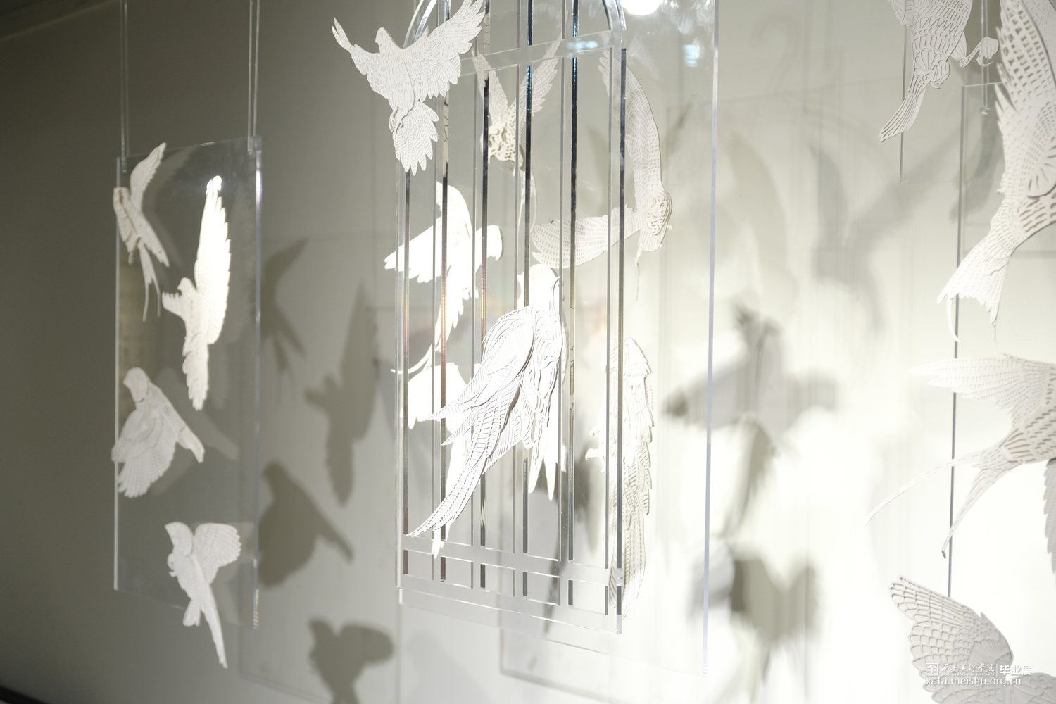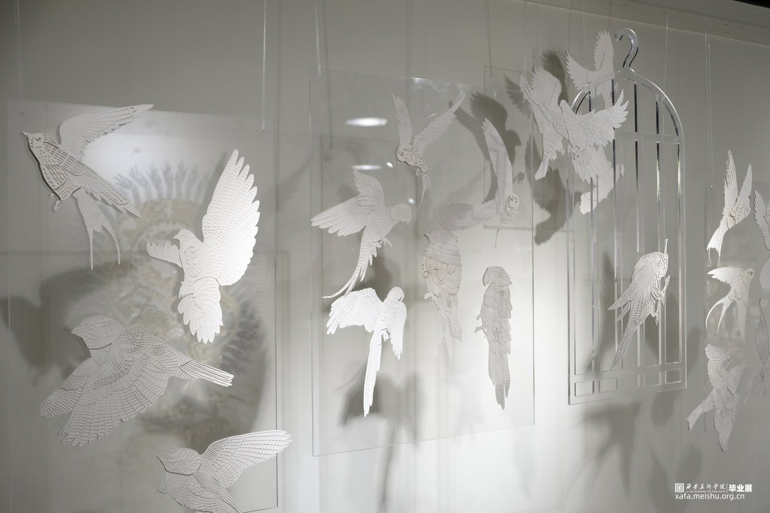 材料:卡纸 工艺:纸雕 设计说明:《肖申克的救赎》说:“有一种鸟儿是永远也关不住的,因为它们的每片羽毛都闪着自由的光辉。”本作品旨在表达不要被事物羁绊着我们的生命,我们要像鸟儿一样,不被定义,不再依赖。