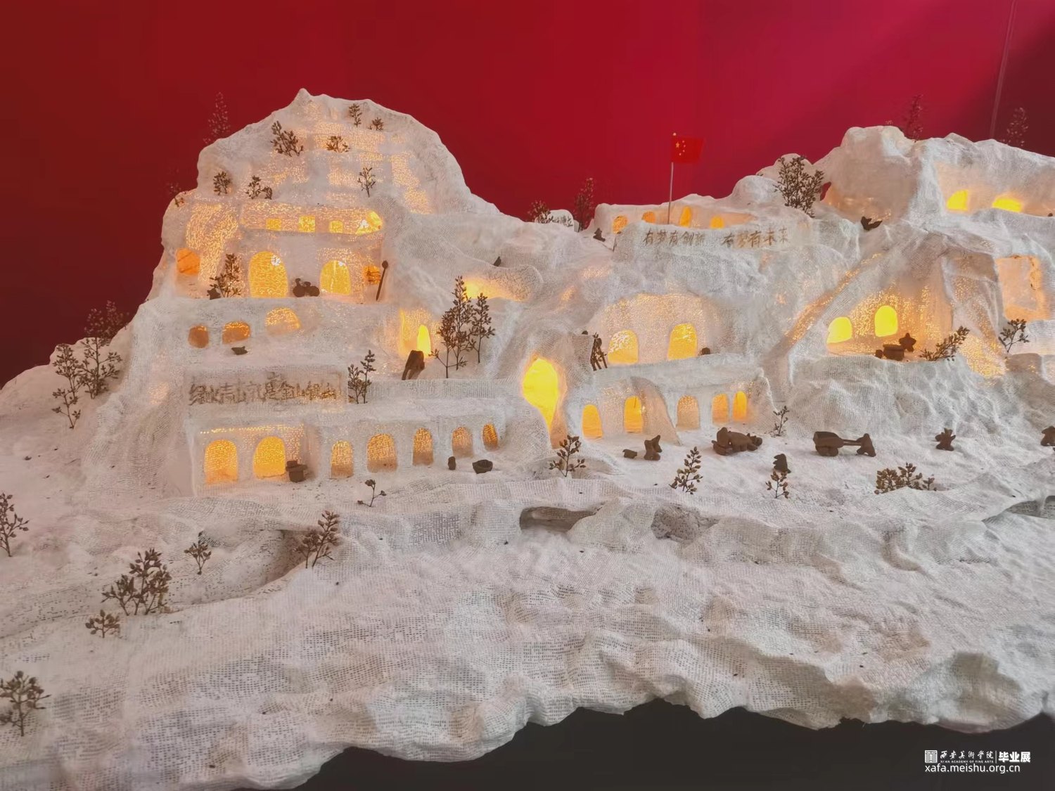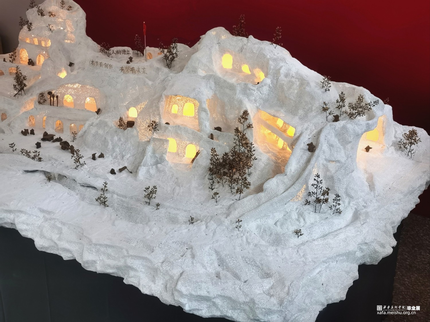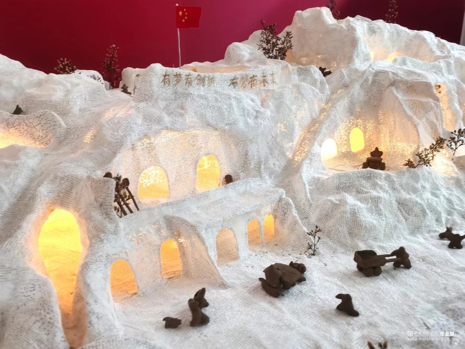 该作品利用海绵泡沫垫与不同规格铝丝构建整体框架,以超轻粘土为山体填充,以石膏布为整体呈现,细节上利用雕塑黄泥展示陕北地域风土人情。作品立体展现陕北窑洞面貌,将陕北的山,陕北的窑洞,陕北的河以及陕北的人融入其中,窑洞中微微暖光映衬出万家灯火。作品创作目的是为丰富学前儿童的认知,给予幼儿直观感受,深入体会陕北窑洞文化以及地域特色,激发学前儿童热爱家乡之情。