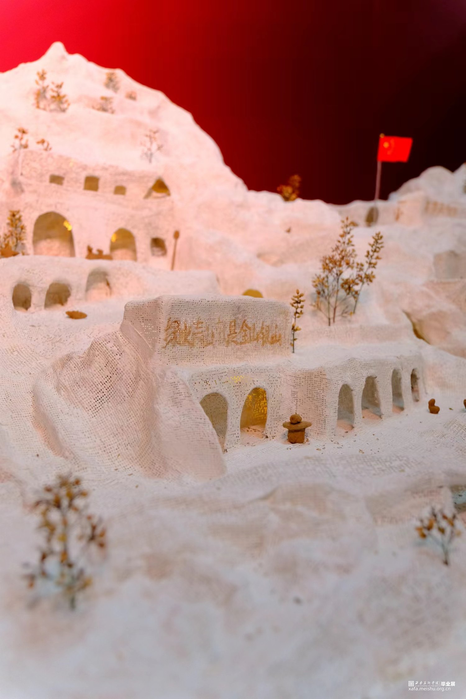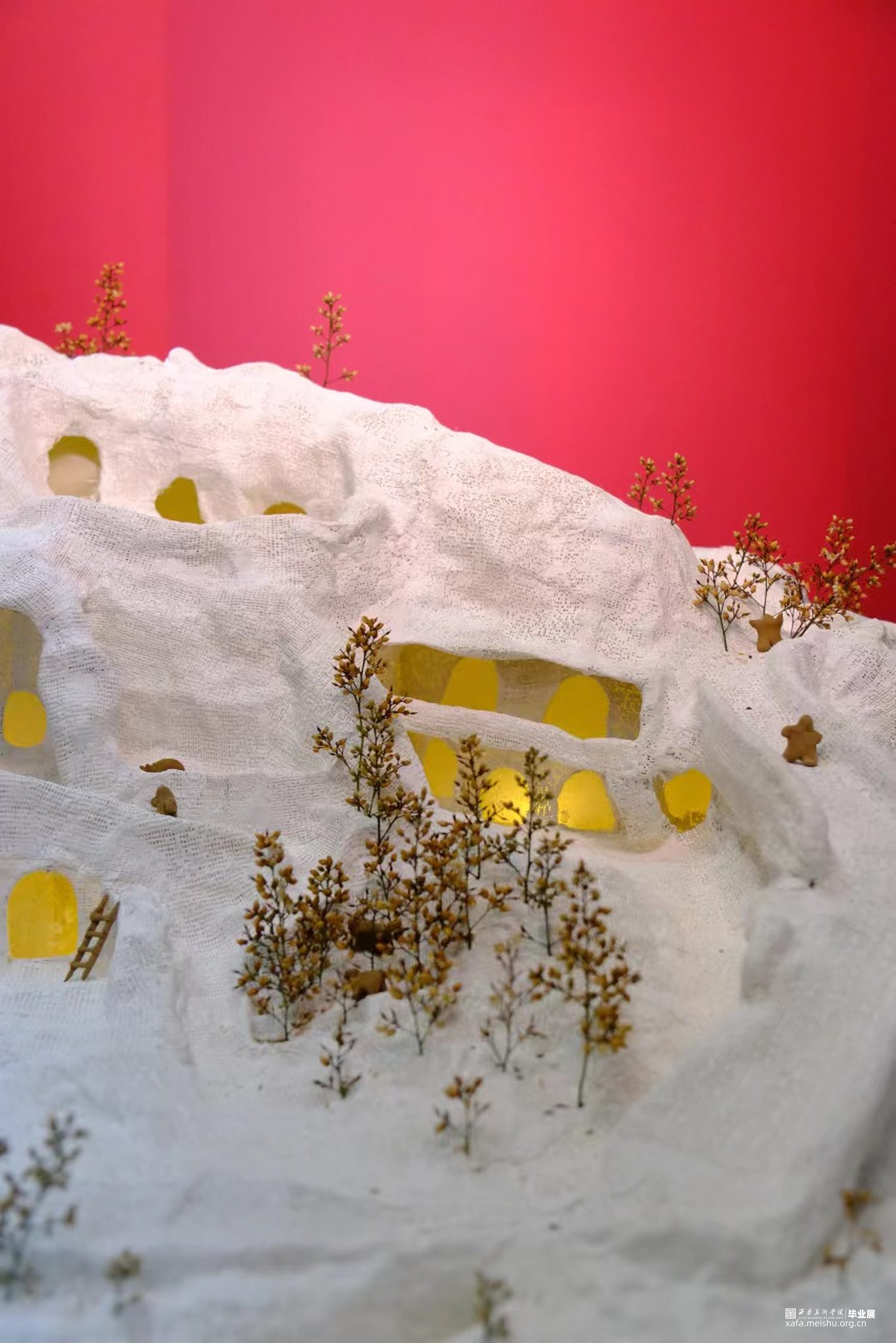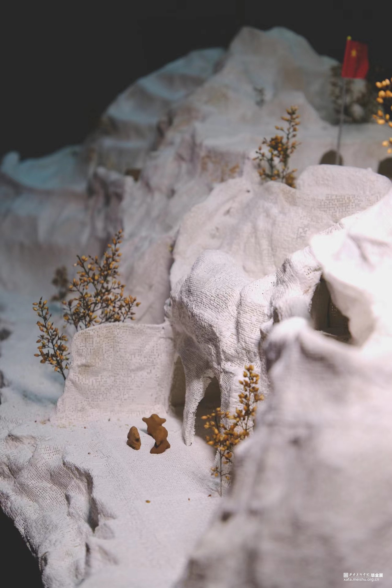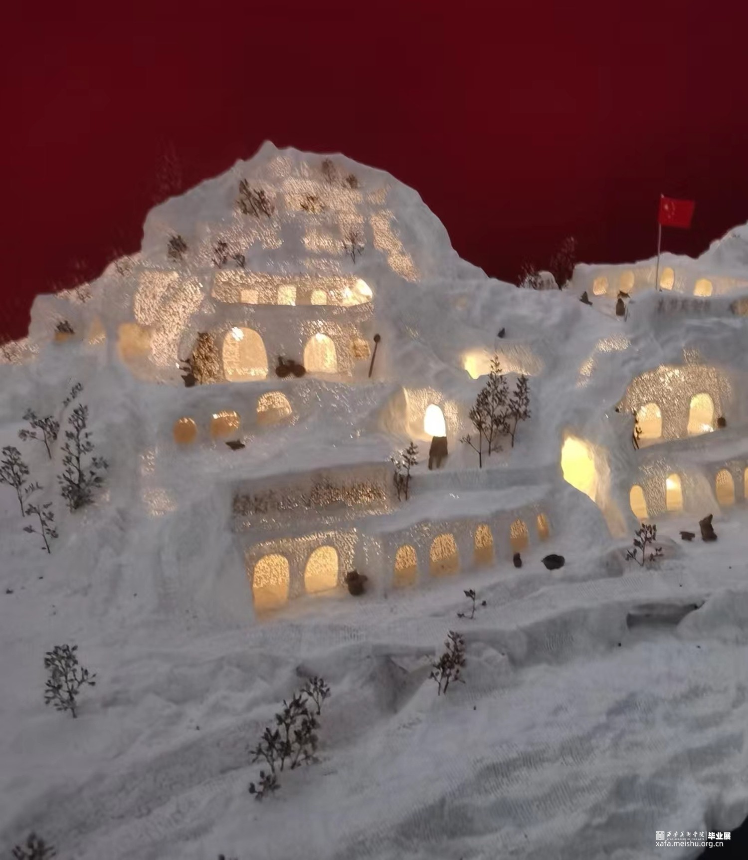 该作品利用海绵泡沫垫与不同规格铝丝构建整体框架,以超轻粘土为山体填充,以石膏布为整体呈现,细节上利用雕塑黄泥展示陕北地域风土人情。作品立体展现陕北窑洞面貌,将陕北的山,陕北的窑洞,陕北的河以及陕北的人融入其中,窑洞中微微暖光映衬出万家灯火。作品创作目的是为丰富学前儿童的认知,给予幼儿直观感受,深入体会陕北窑洞文化以及地域特色,激发学前儿童热爱家乡之情。