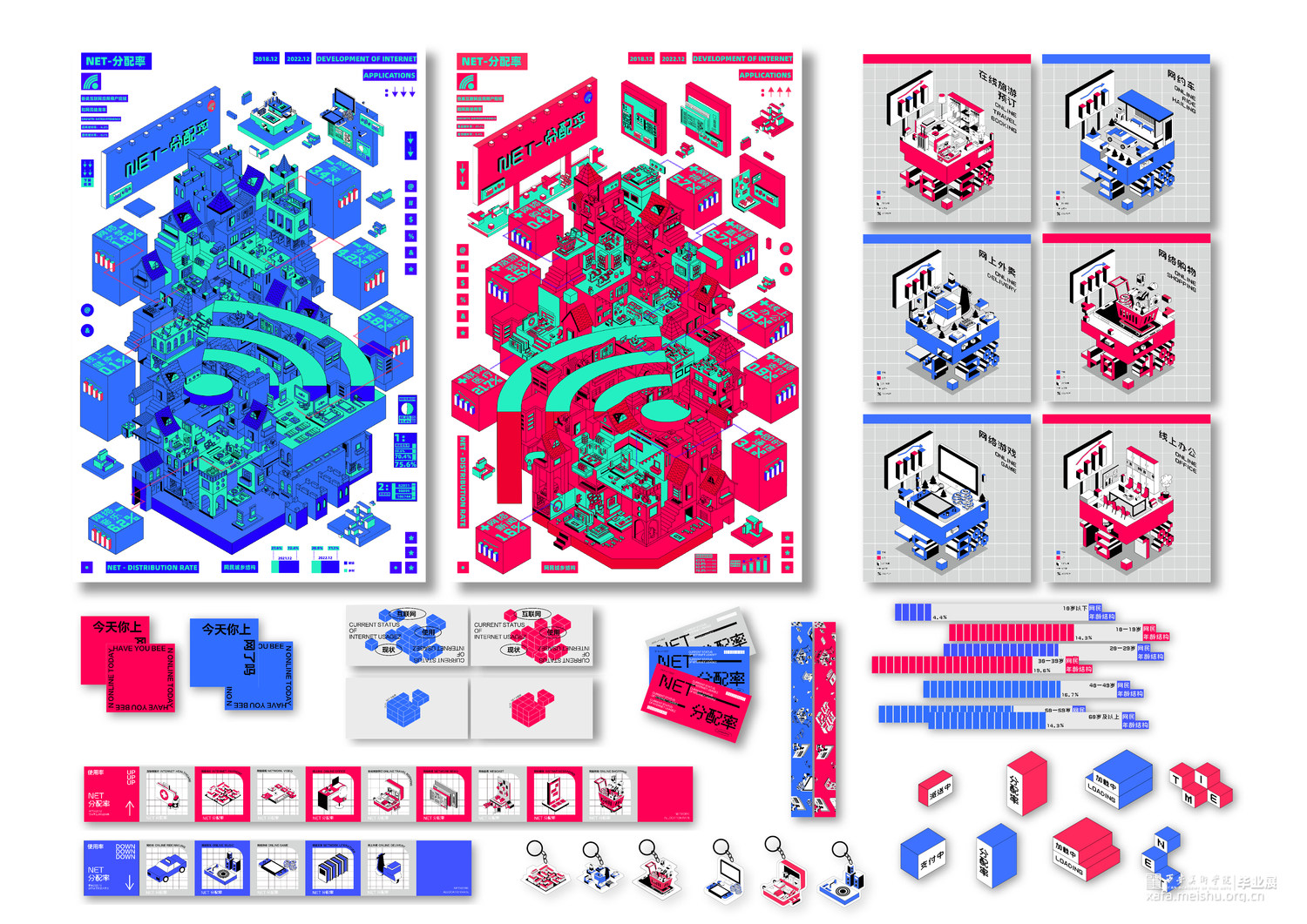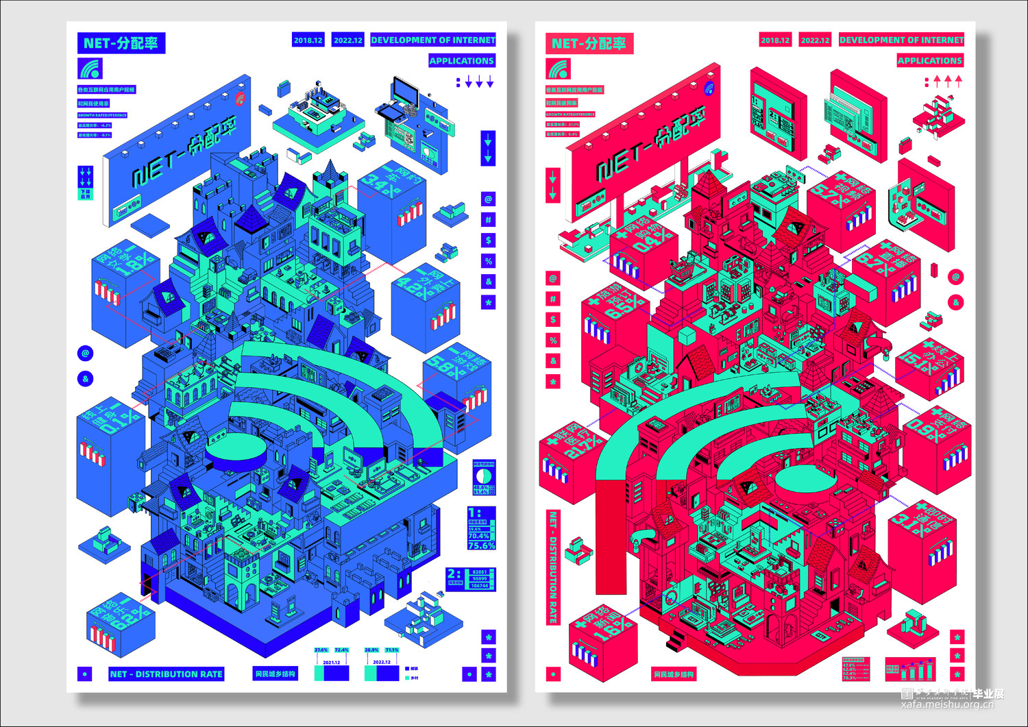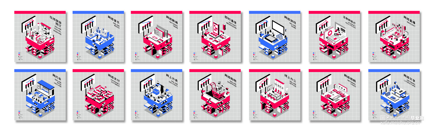 通过研究隐喻图形和信息图表,用2.5d插画的形式将网络对人们生活的影响以图解的方式转化为具像化图形,并用通过信息图表进行呈现。以“魔方”为原型来隐喻网络时代的千变万化,在现实的三维世界和网络虚拟的二维呈现中折中选择2.5d的形式来进行信息图表的绘制。将人们使用不同网络应用频率放在魔方这样一个平台上,解构重组,体现网络对人们生活的影响。其中红色代表使用率上升的网络应用,蓝色代表使用率下降的网络应用。