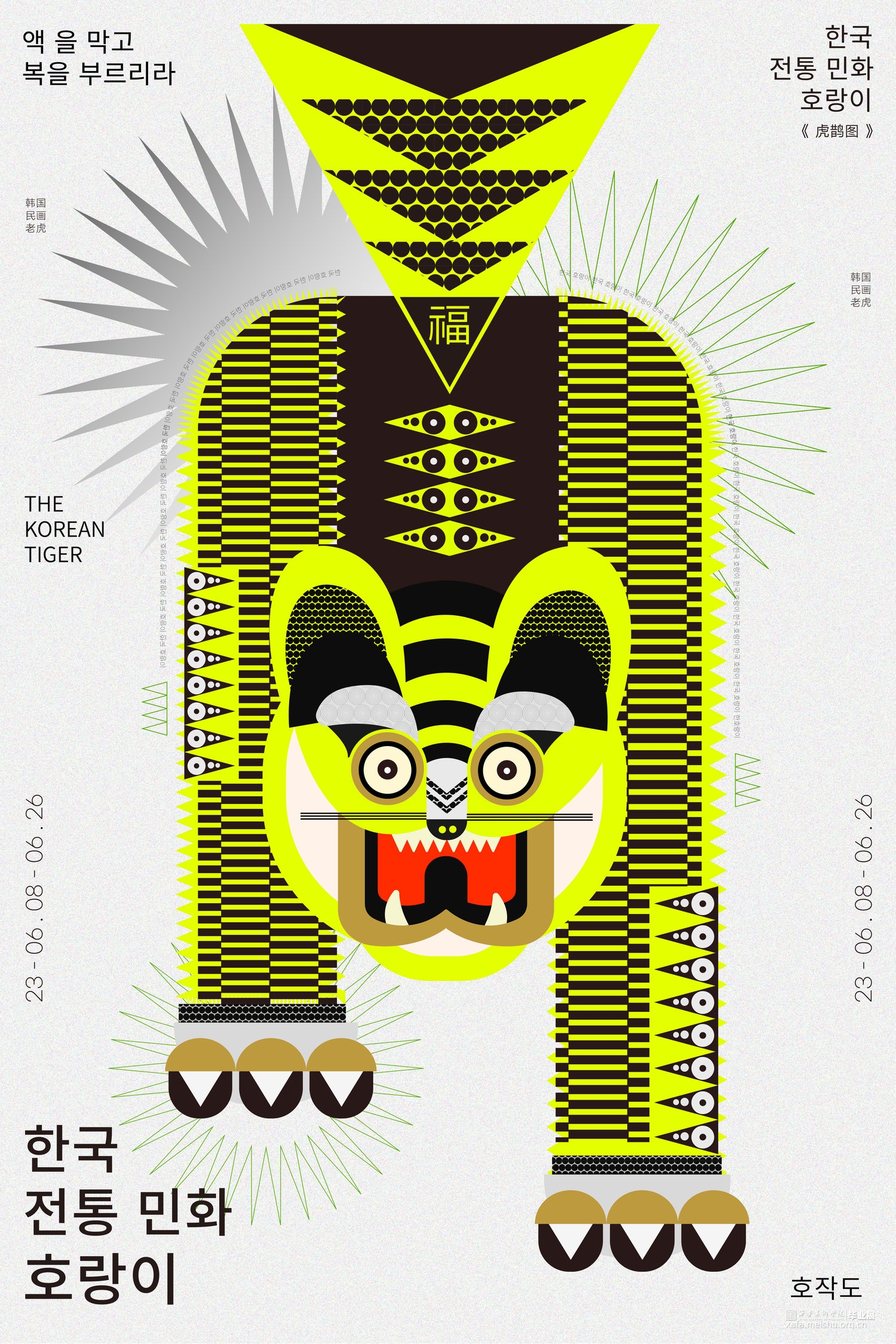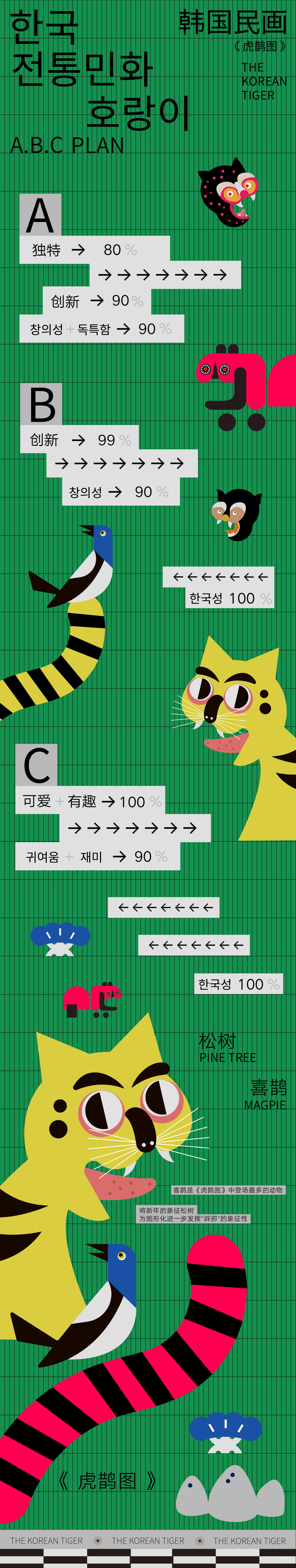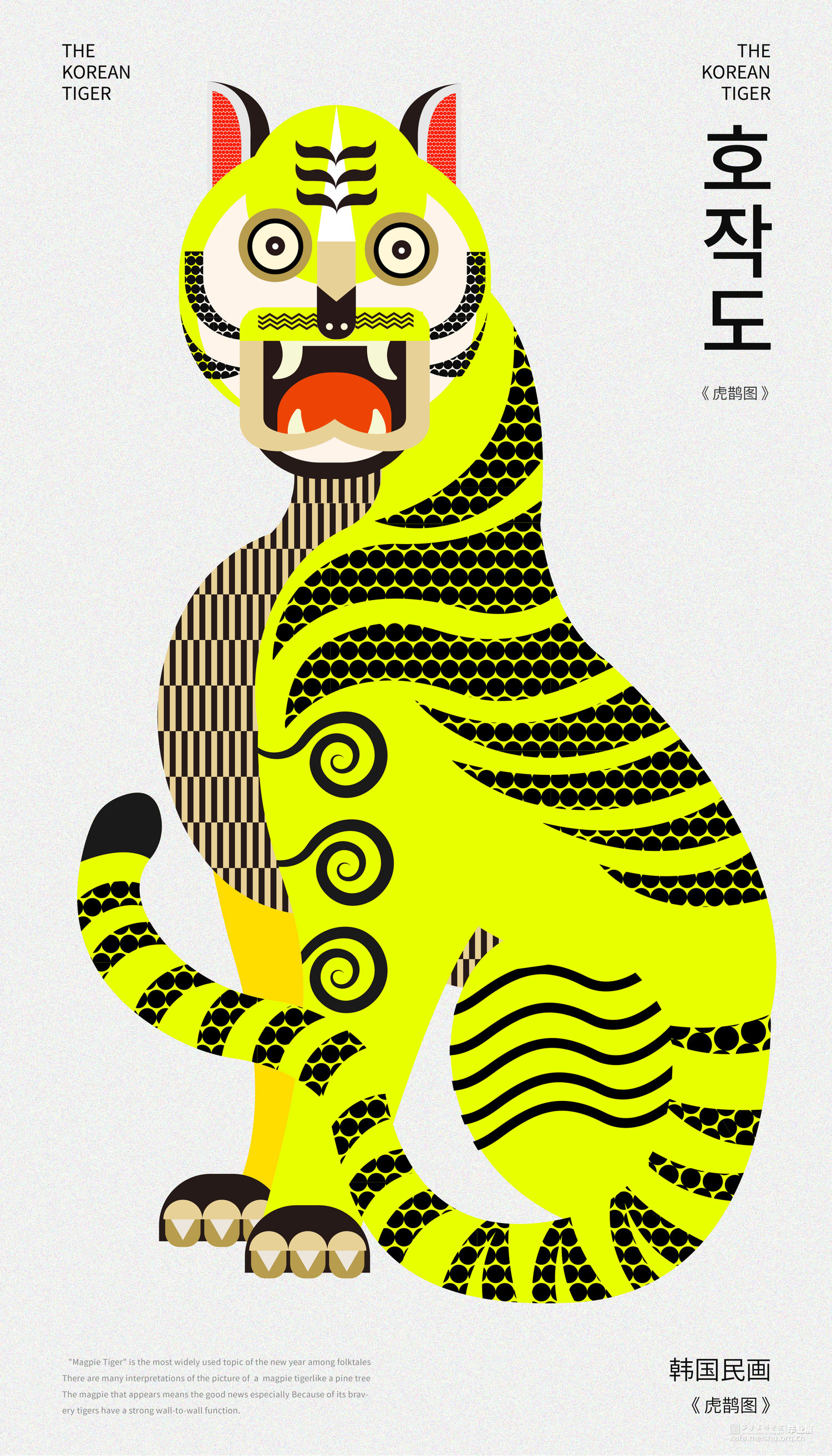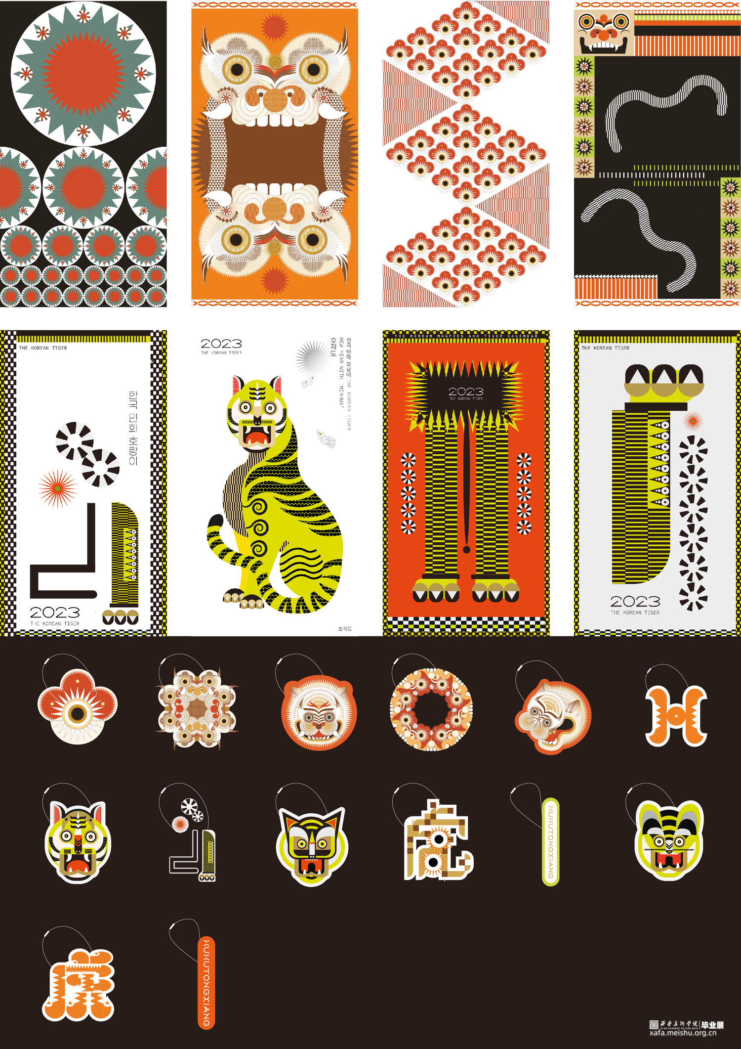 对于《虎鹊图》,要想强调的是韩国性特色,以突出韩国之美,从传统中寻找现代美感用现代的设计诠释打造突出"韩国性"的设计定位目标开始创作,充分体现老虎本身的素材的象征性,因此重新构成时注重表现了强烈的色彩和老虎独特的面部表情形态;对于凤翔年画,用现代的电脑技术来完成对于凤翔年画中老虎的造型结构用构成语言来表现画面,达到一种生动有趣的效果,又不乏凤翔年画本身的文化内涵,寓意虎虎生威,并希望它更具现代特色,能够有更好的现代的形式融入进去;对于字体设计,以中国虎字和韩国虎字来设计logo,根据中国年画虎和韩国民画虎的纹样特点寻找两者元素间的共同点并进行提取,中英文字体笔画的设计也主要参照了这种方式在表现老虎特点的同时保留了字本身的可读性。