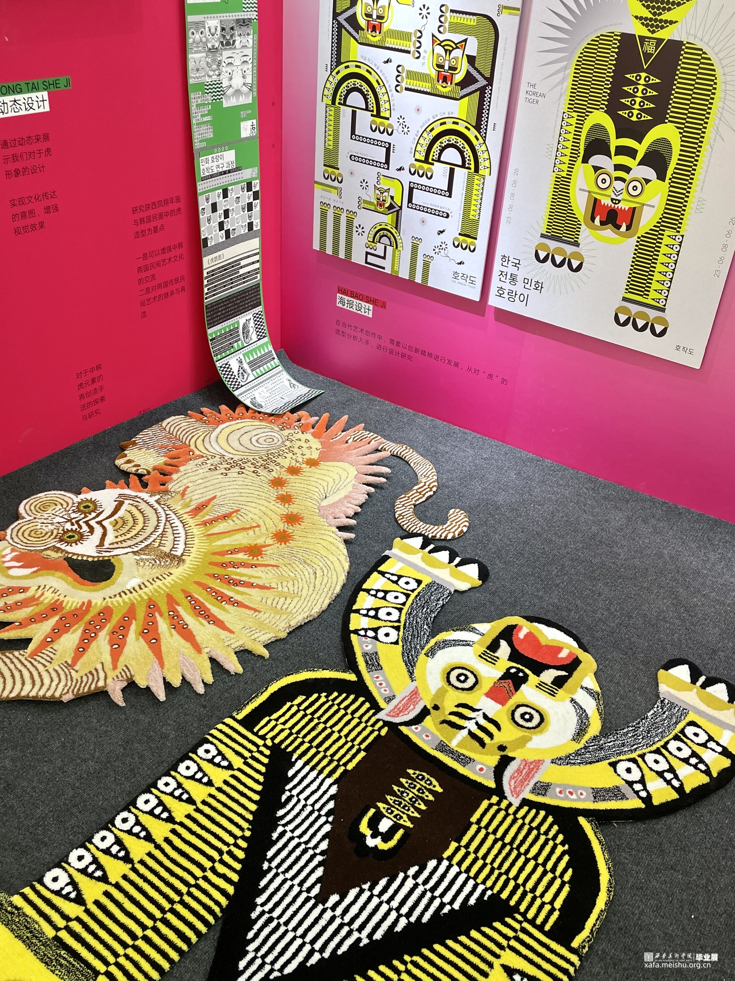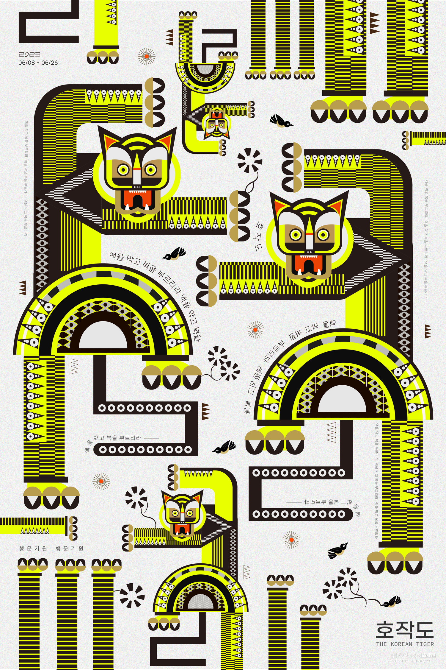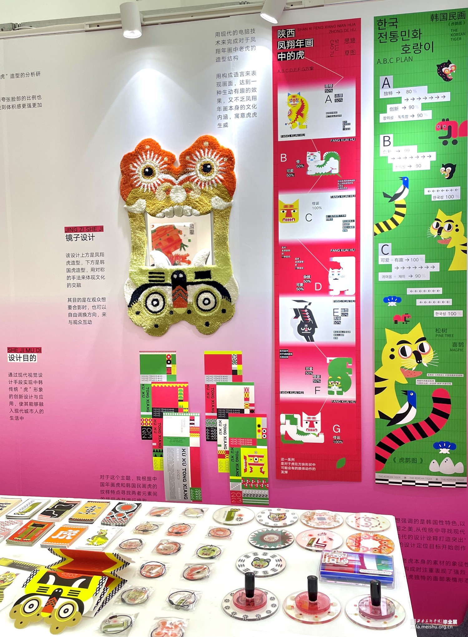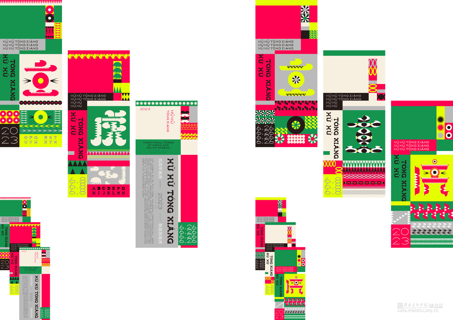对于《虎鹊图》,要想强调的是韩国性特色,以突出韩国之美,从传统中寻找现代美感用现代的设计诠释打造突出"韩国性"的设计定位目标开始创作,充分体现老虎本身的素材的象征性,因此重新构成时注重表现了强烈的色彩和老虎独特的面部表情形态;对于凤翔年画,用现代的电脑技术来完成对于凤翔年画中老虎的造型结构用构成语言来表现画面,达到一种生动有趣的效果,又不乏凤翔年画本身的文化内涵,寓意虎虎生威,并希望它更具现代特色,能够有更好的现代的形式融入进去;对于字体设计,以中国虎字和韩国虎字来设计logo,根据中国年画虎和韩国民画虎的纹样特点寻找两者元素间的共同点并进行提取,中英文字体笔画的设计也主要参照了这种方式在表现老虎特点的同时保留了字本身的可读性。