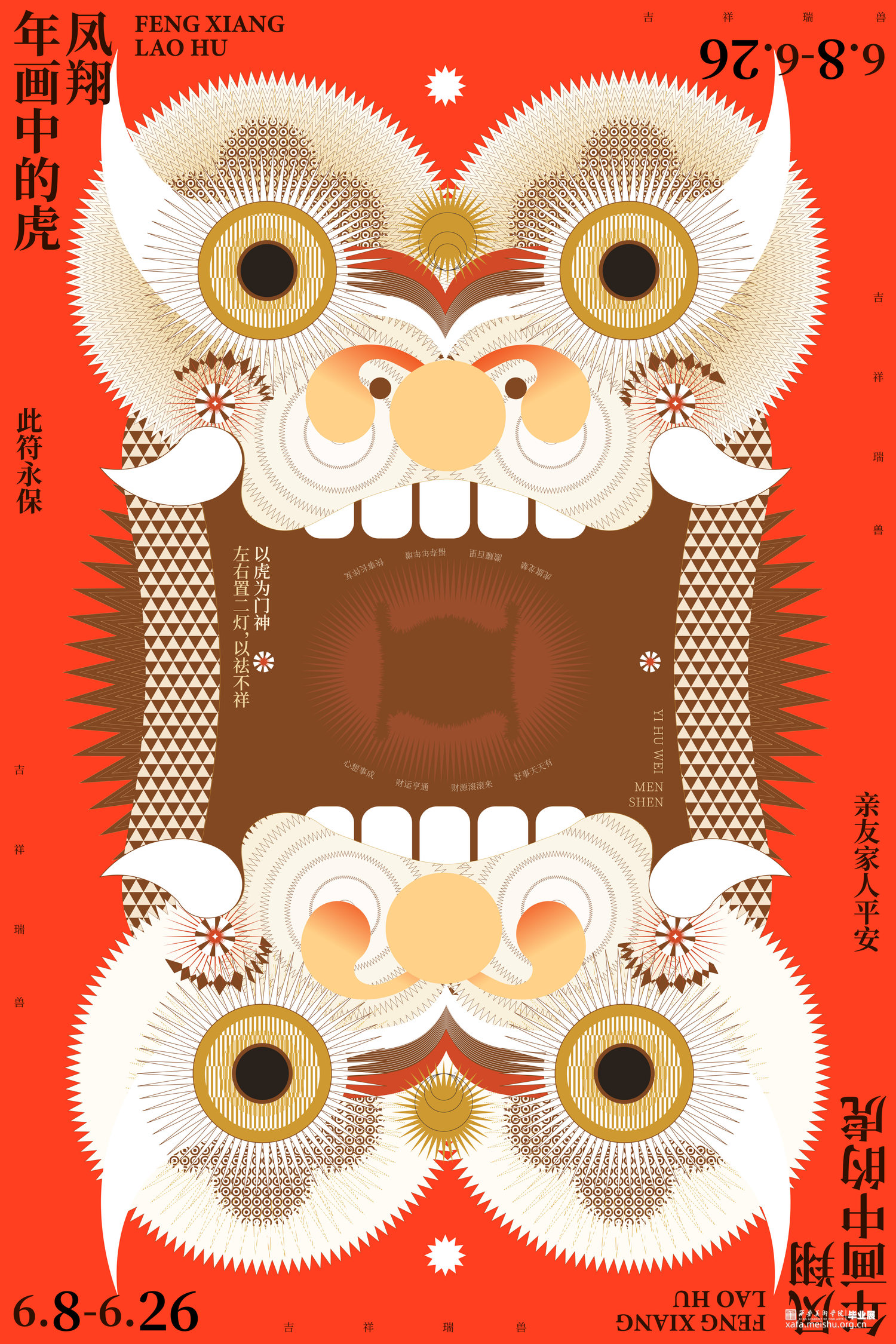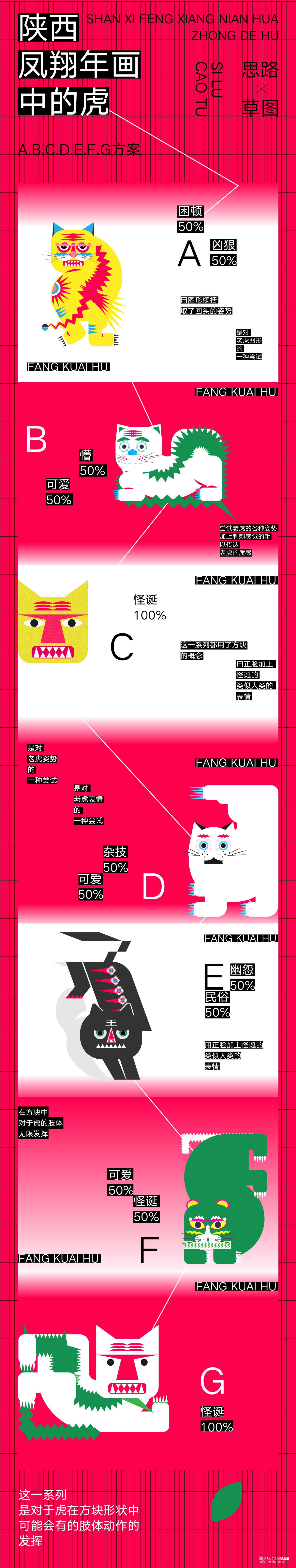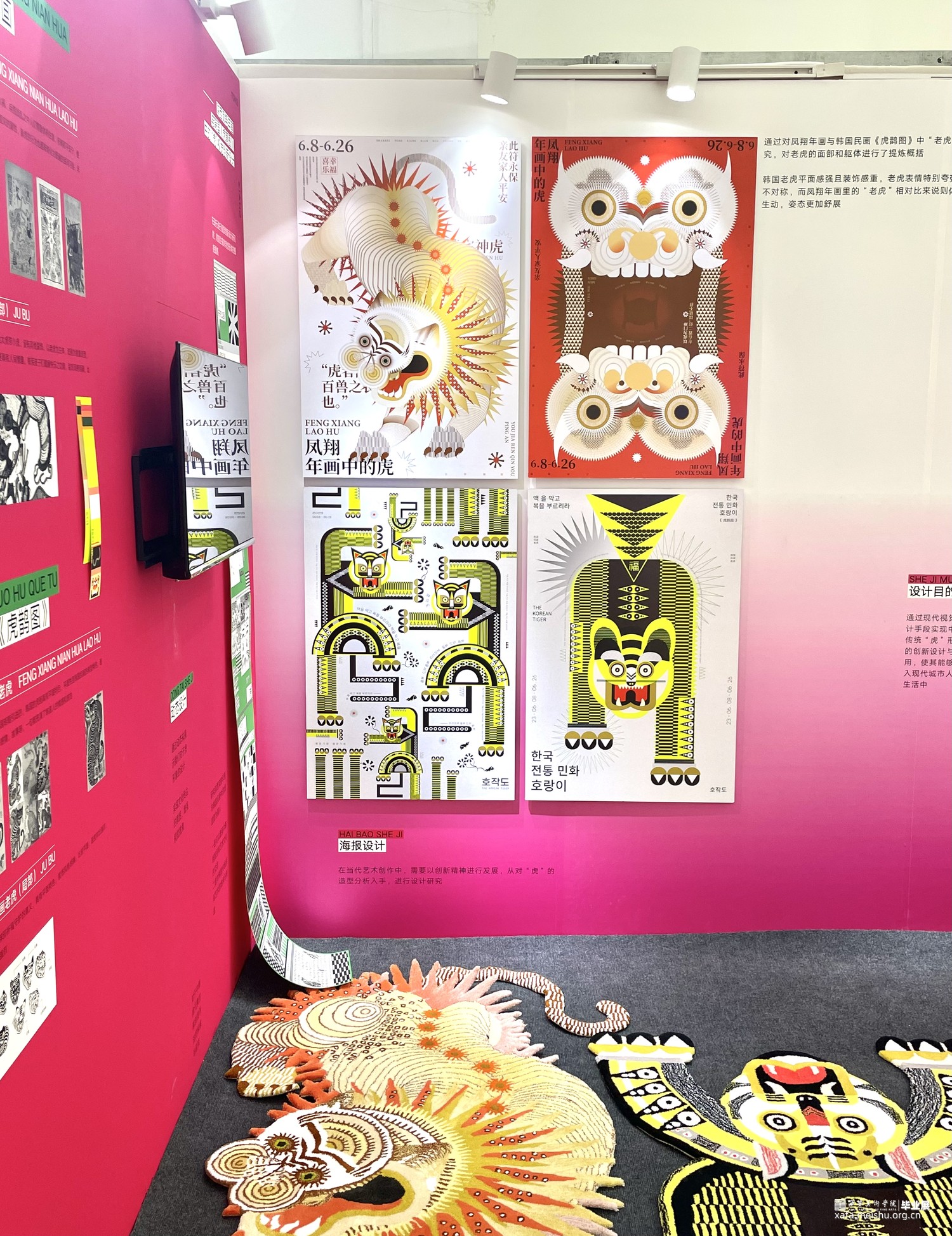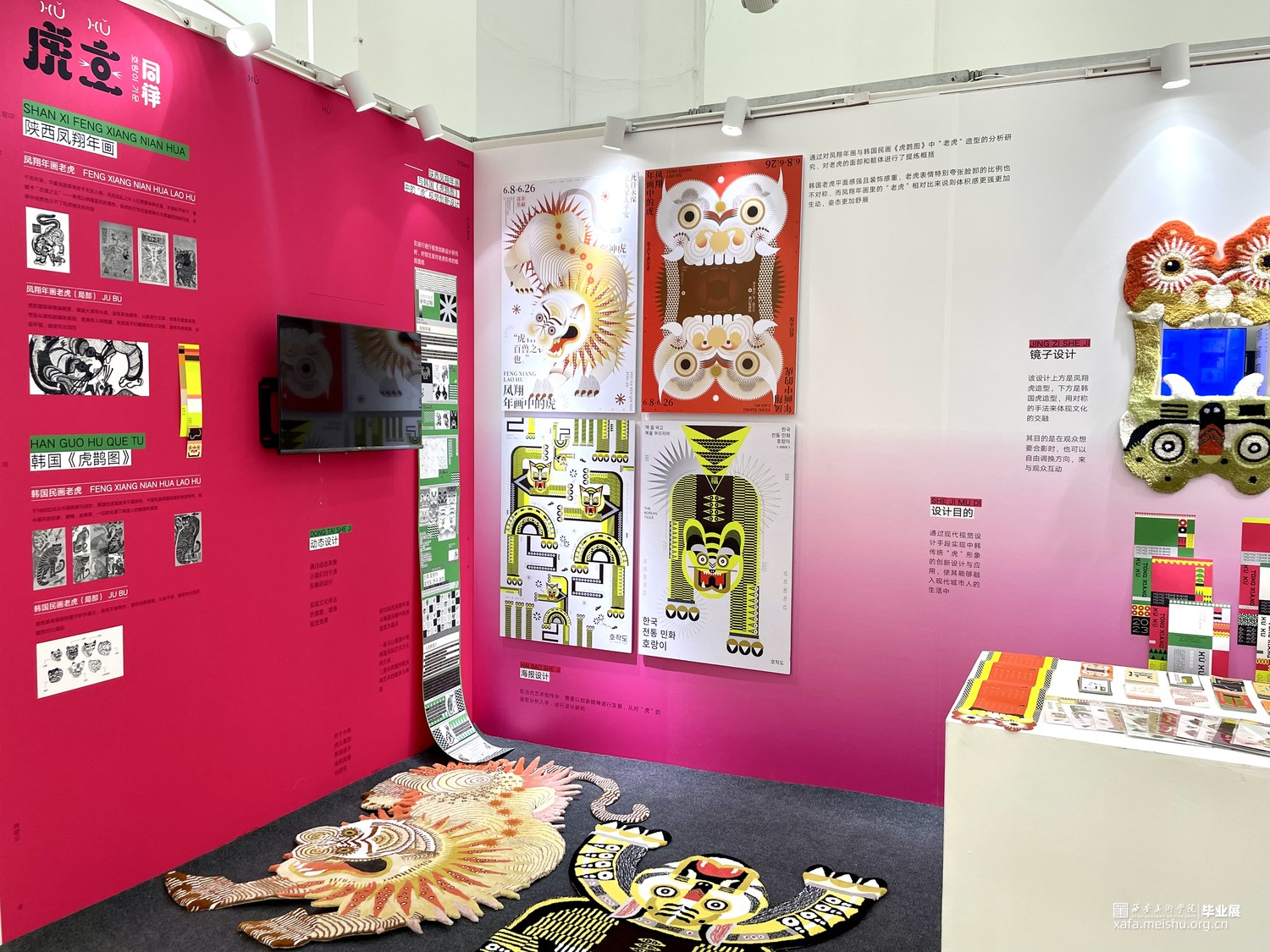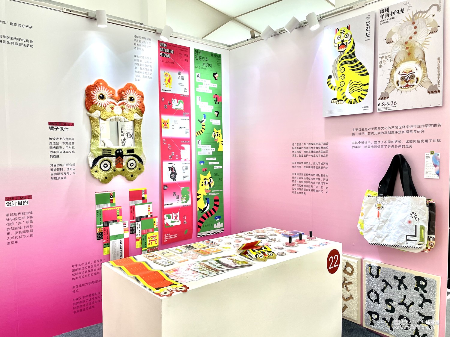 对于《虎鹊图》,要想强调的是韩国性特色,以突出韩国之美,从传统中寻找现代美感用现代的设计诠释打造突出"韩国性"的设计定位目标开始创作,充分体现老虎本身的素材的象征性,因此重新构成时注重表现了强烈的色彩和老虎独特的面部表情形态;对于凤翔年画,用现代的电脑技术来完成对于凤翔年画中老虎的造型结构用构成语言来表现画面,达到一种生动有趣的效果,又不乏凤翔年画本身的文化内涵,寓意虎虎生威,并希望它更具现代特色,能够有更好的现代的形式融入进去;对于字体设计,以中国虎字和韩国虎字来设计logo,根据中国年画虎和韩国民画虎的纹样特点寻找两者元素间的共同点并进行提取,中英文字体笔画的设计也主要参照了这种方式在表现老虎特点的同时保留了字本身的可读性。
