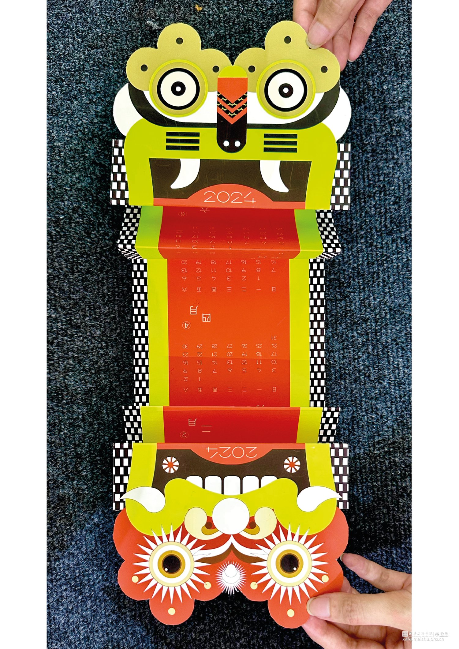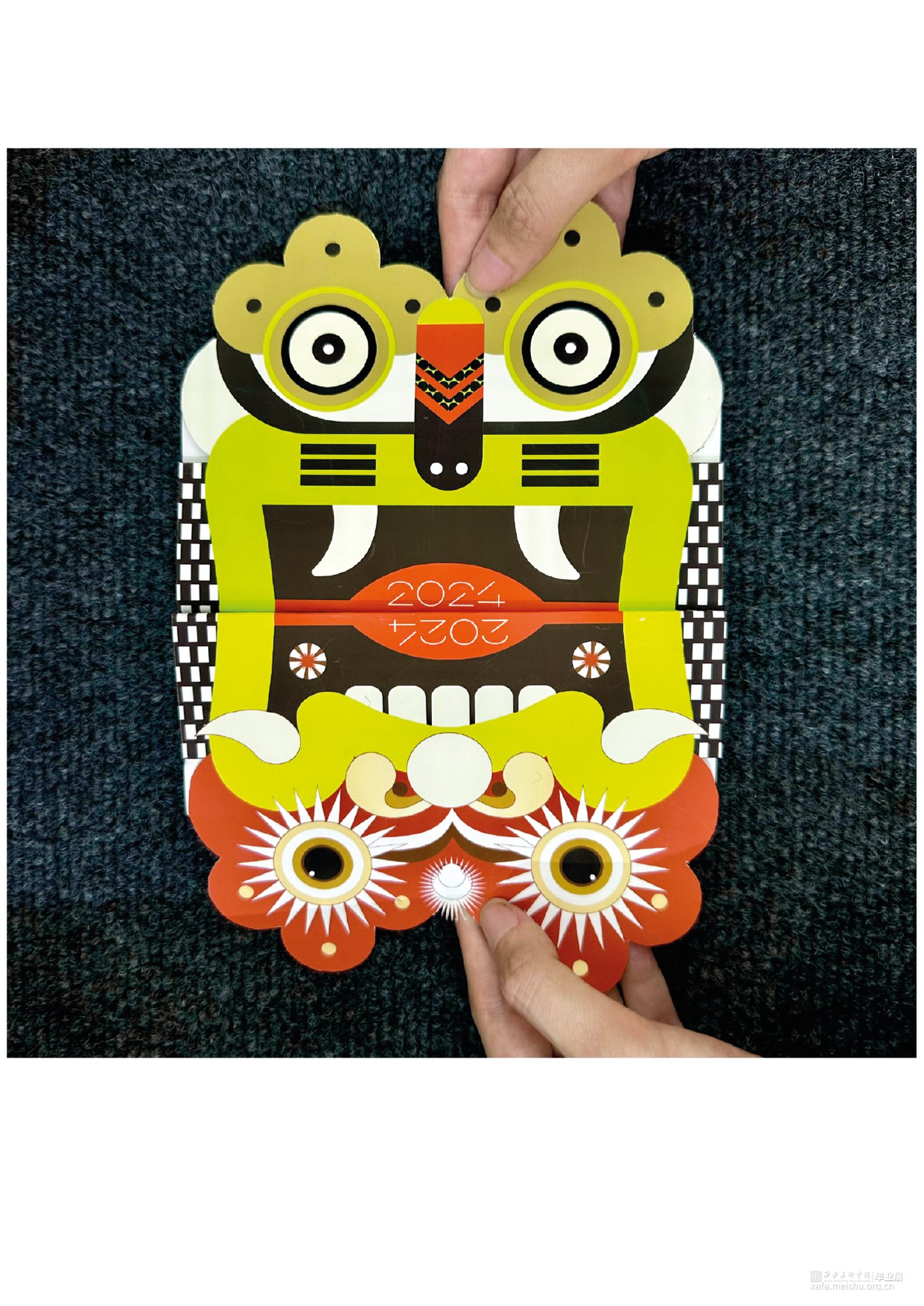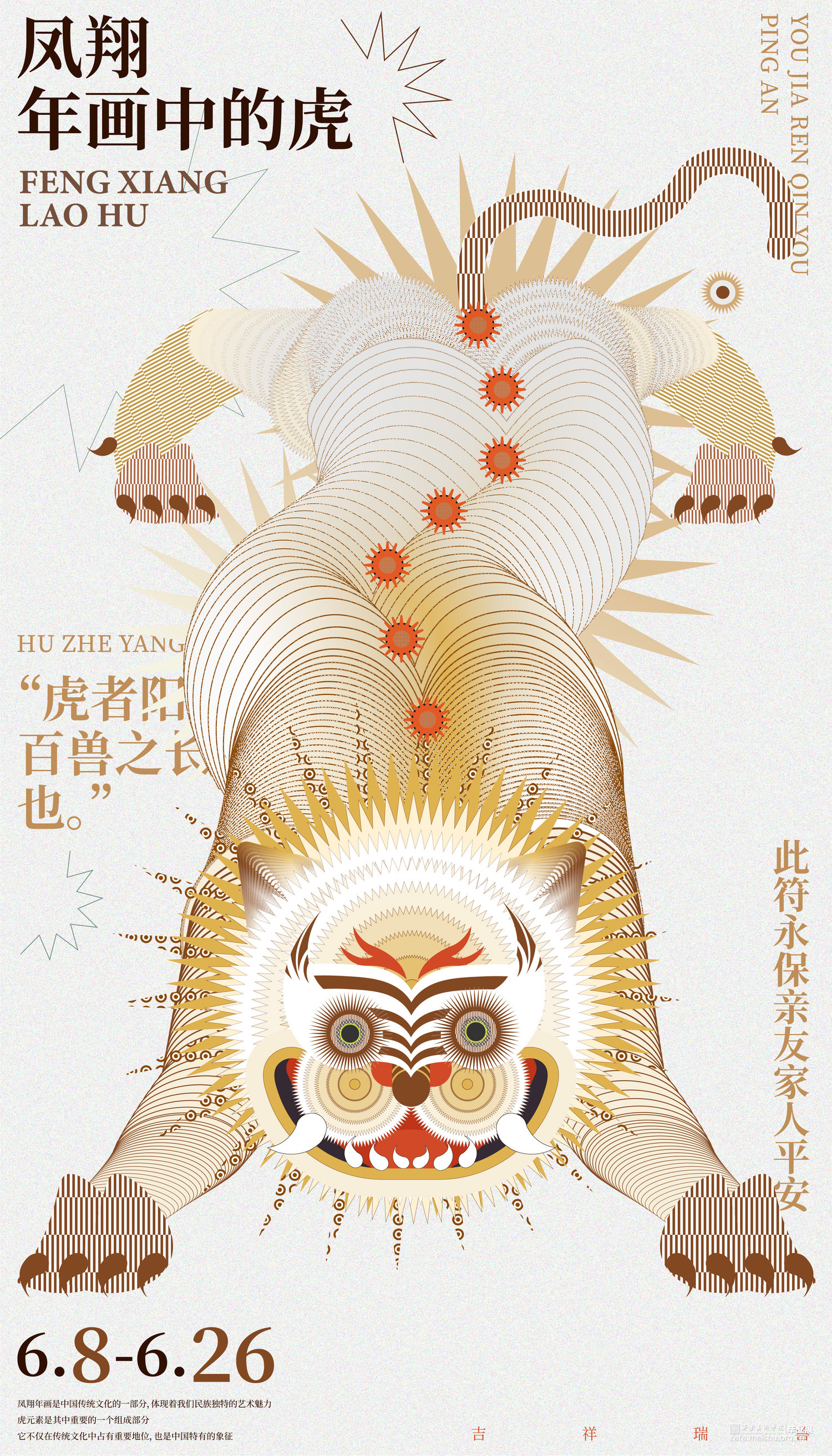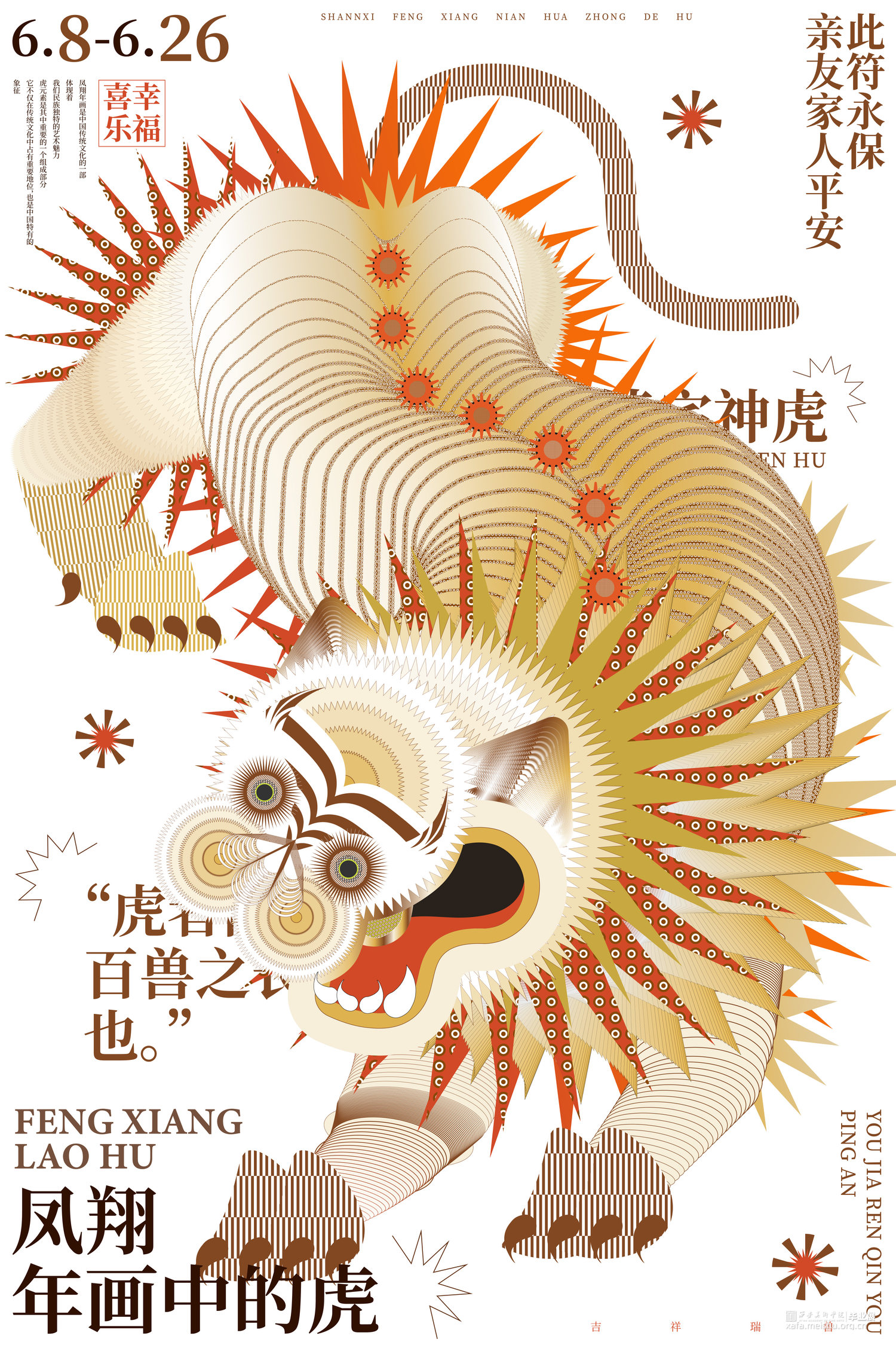 对于《虎鹊图》,要想强调的是韩国性特色,以突出韩国之美,从传统中寻找现代美感用现代的设计诠释打造突出"韩国性"的设计定位目标开始创作,充分体现老虎本身的素材的象征性,因此重新构成时注重表现了强烈的色彩和老虎独特的面部表情形态;对于凤翔年画,用现代的电脑技术来完成对于凤翔年画中老虎的造型结构用构成语言来表现画面,达到一种生动有趣的效果,又不乏凤翔年画本身的文化内涵,寓意虎虎生威,并希望它更具现代特色,能够有更好的现代的形式融入进去;对于字体设计,以中国虎字和韩国虎字来设计logo,根据中国年画虎和韩国民画虎的纹样特点寻找两者元素间的共同点并进行提取,中英文字体笔画的设计也主要参照了这种方式在表现老虎特点的同时保留了字本身的可读性。