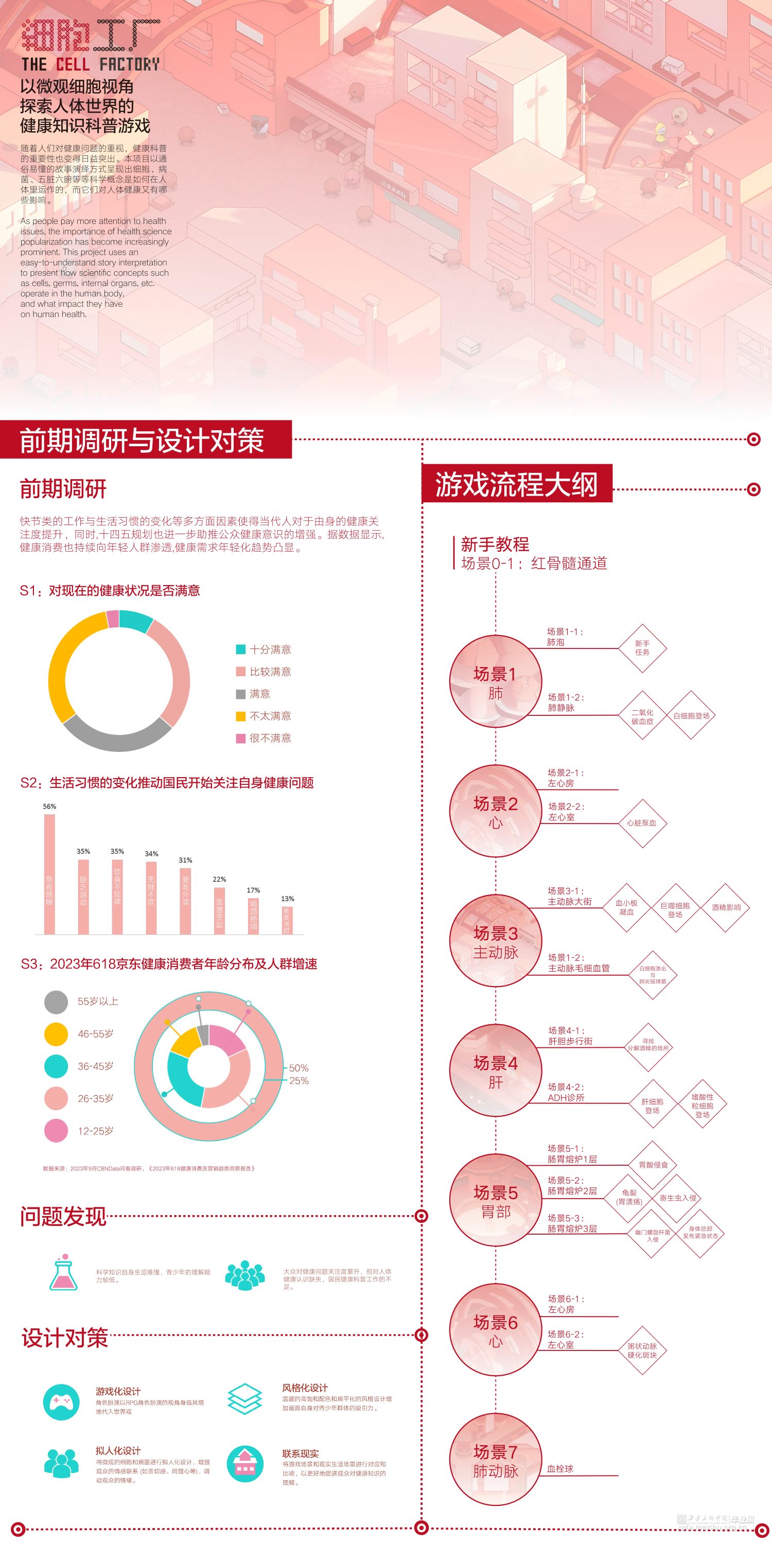 随着时代的发展,大众对知识的获取需求与传统科普展示方式的局限性之间的矛盾日益显著。传统科普展示设计在吸引力、参与度、信息传递方式、持续互动和个性化体验等方面存在不足。本研究探讨了融合游戏化思维和科普展示空间的创新方法,目的在于通过独特的游戏化科普展示设计和互动方式,激发公众对健康知识的兴趣、理解和参与度。这一方法能够使科普展示更加生动有趣,吸引更多参与者,加深他们对健康知识的理解。