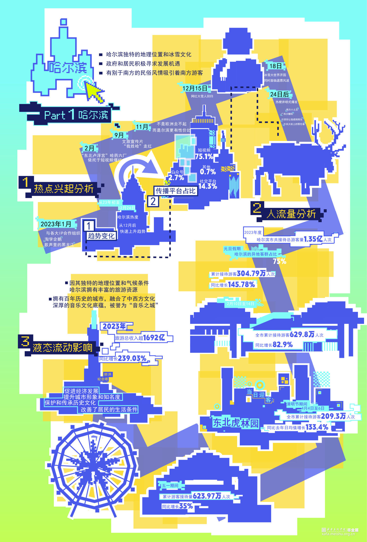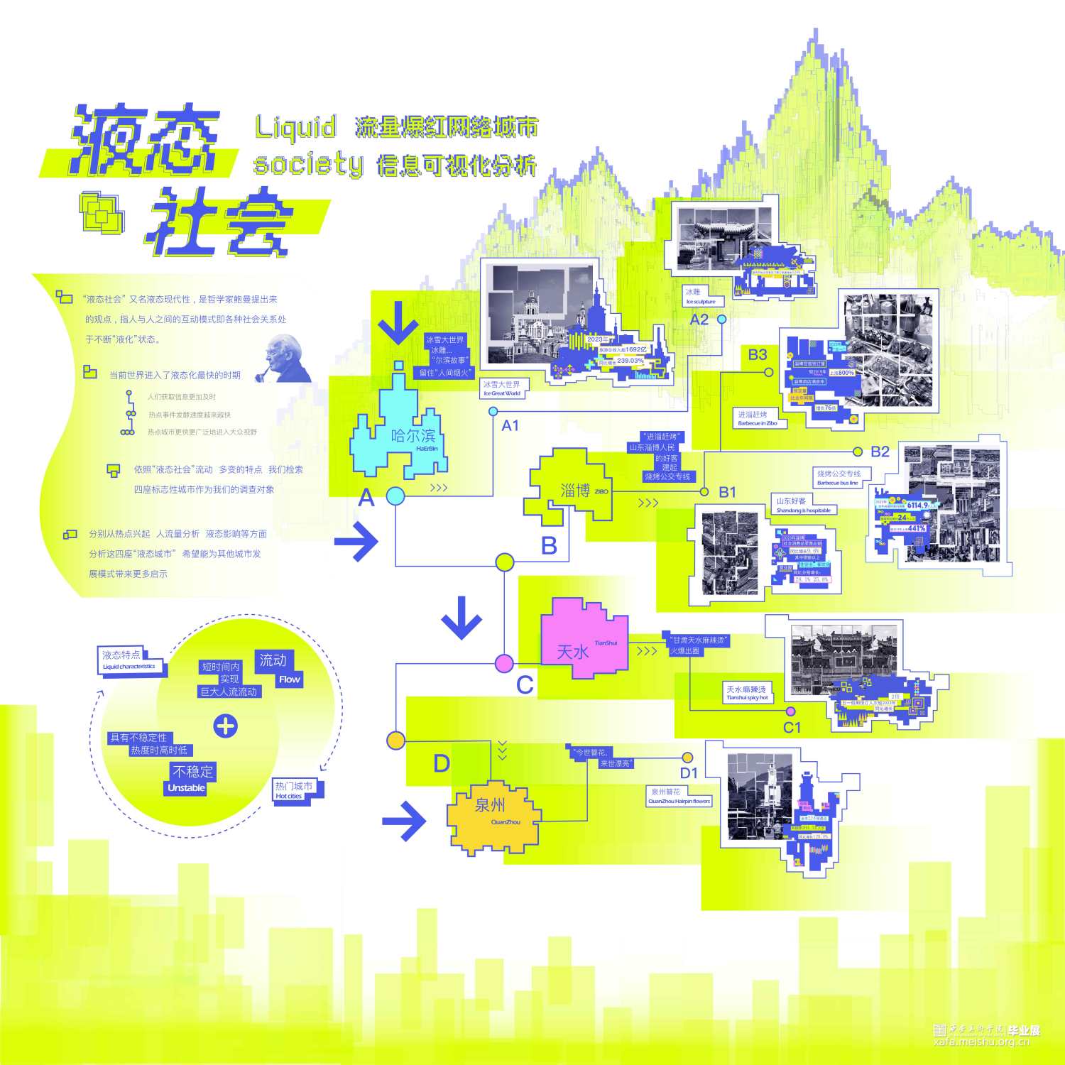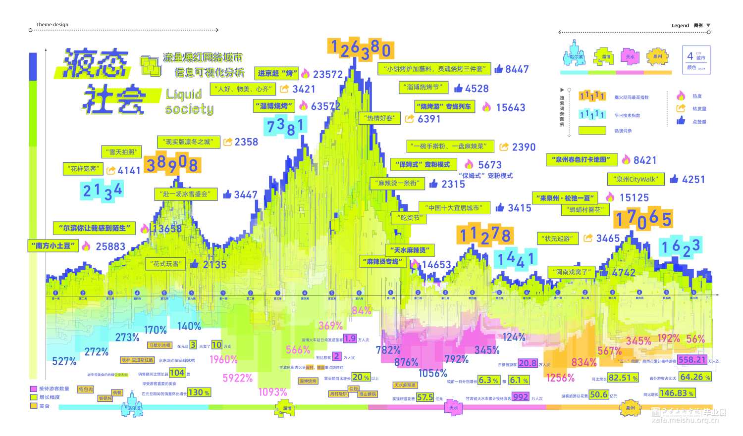 当今时代是信息化的时代,网络技术的发展和普及进一步加速了液态社会的形成,使得工作和社交活动能够跨越地理空间限制。世界进入了液态化最快的时期,人们获取信息也更加及时。 热点事件发酵速度越来越快。得益于此,热点城市更快更广泛地进入大众视野,依照“液态社会”流动、多变、不稳定的特点,我们检索提取了四座标志性城市作为我们的调查对象。分别从热点兴起、人流量分析、液态影响等方面分析这四座“液态城市”,希望能为别的城市发展模式带来更多启示。