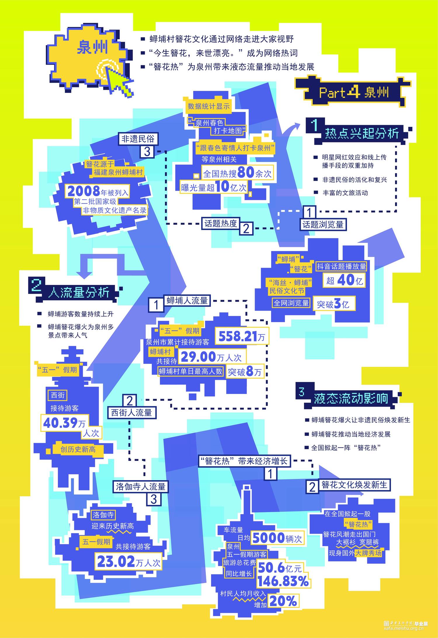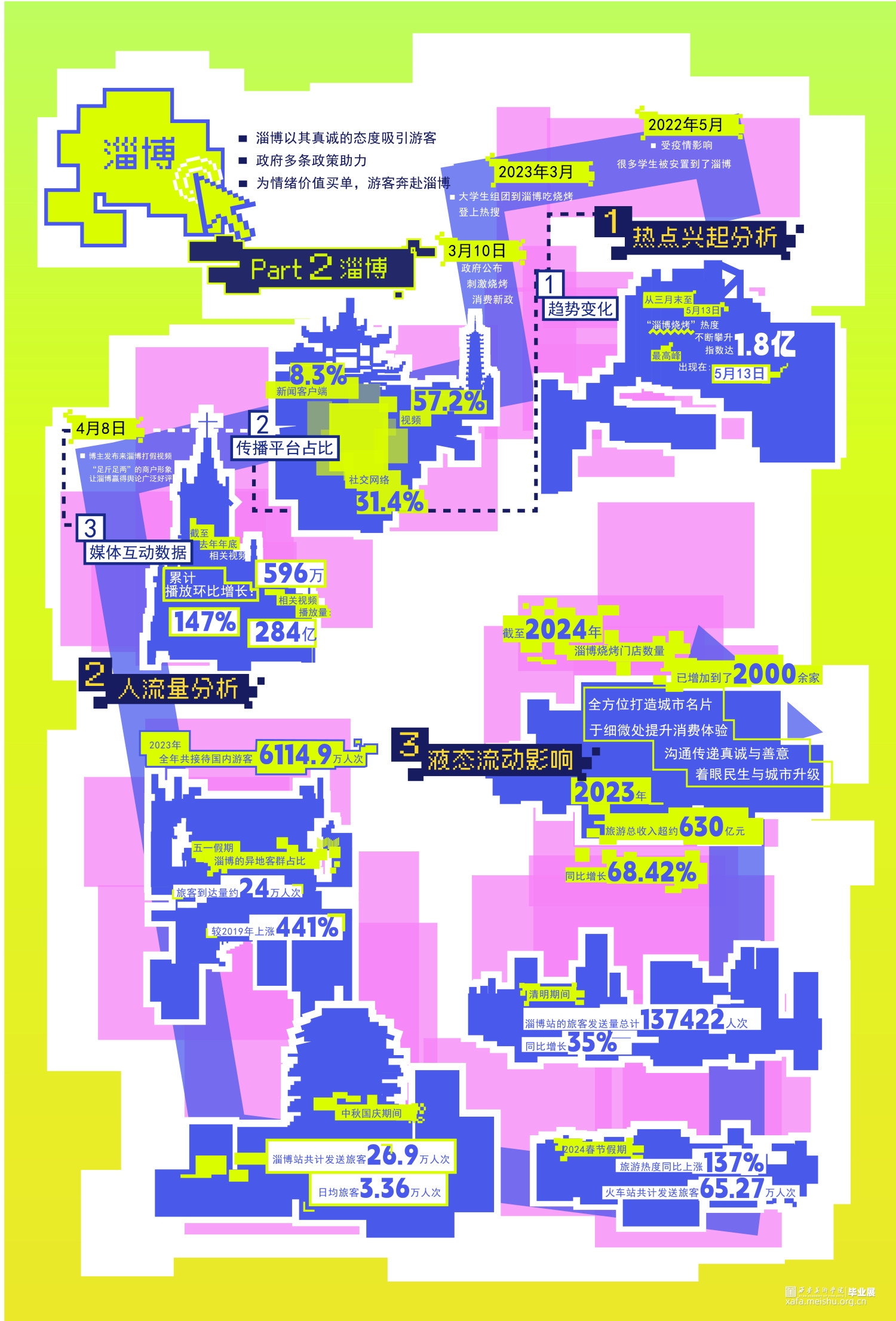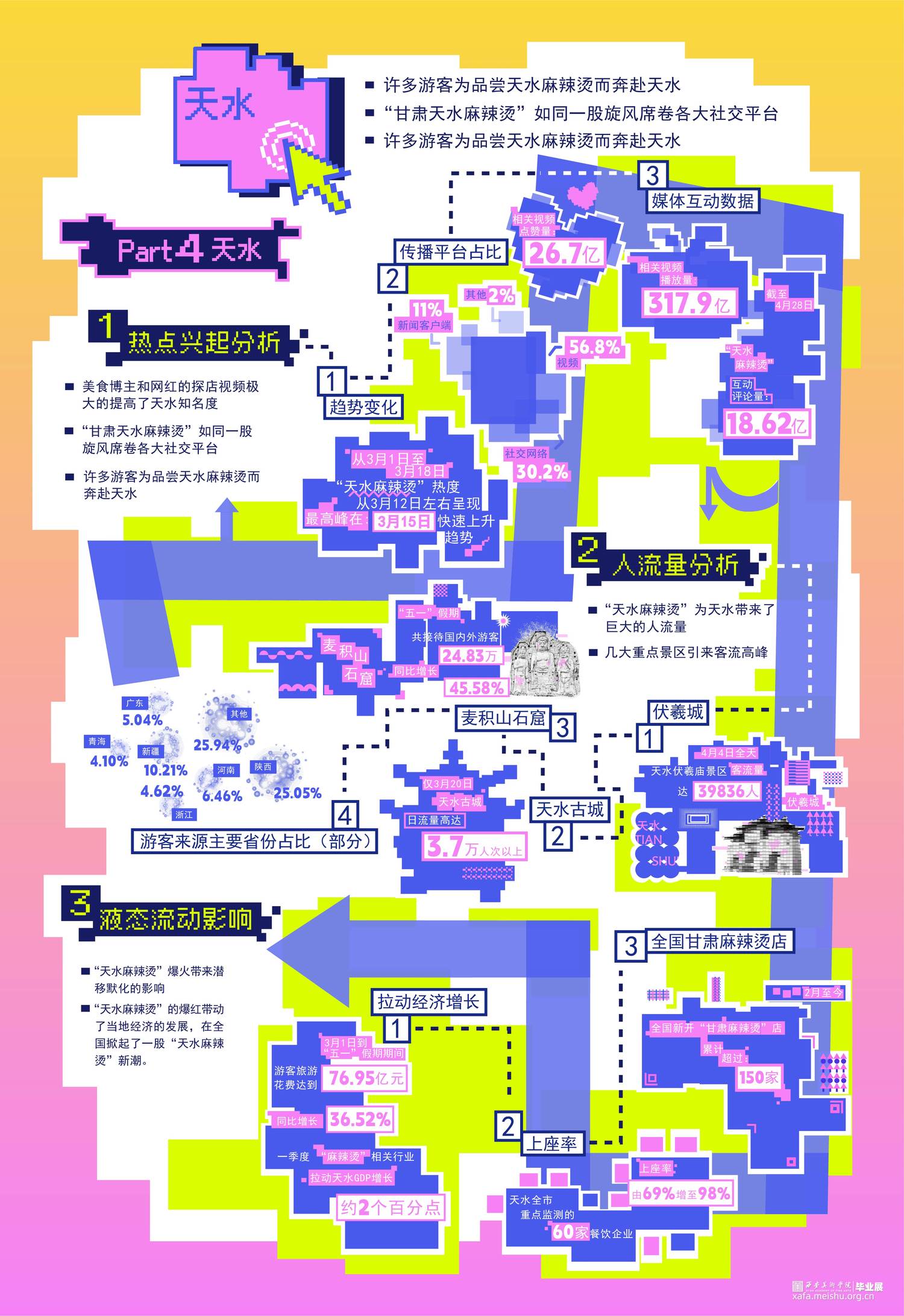 当今时代是信息化的时代,网络技术的发展和普及进一步加速了液态社会的形成,使得工作和社交活动能够跨越地理空间限制。世界进入了液态化最快的时期,人们获取信息也更加及时。 热点事件发酵速度越来越快。得益于此,热点城市更快更广泛地进入大众视野,依照“液态社会”流动、多变、不稳定的特点,我们检索提取了四座标志性城市作为我们的调查对象。分别从热点兴起、人流量分析、液态影响等方面分析这四座“液态城市”,希望能为别的城市发展模式带来更多启示。