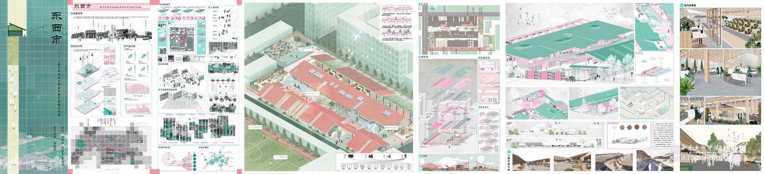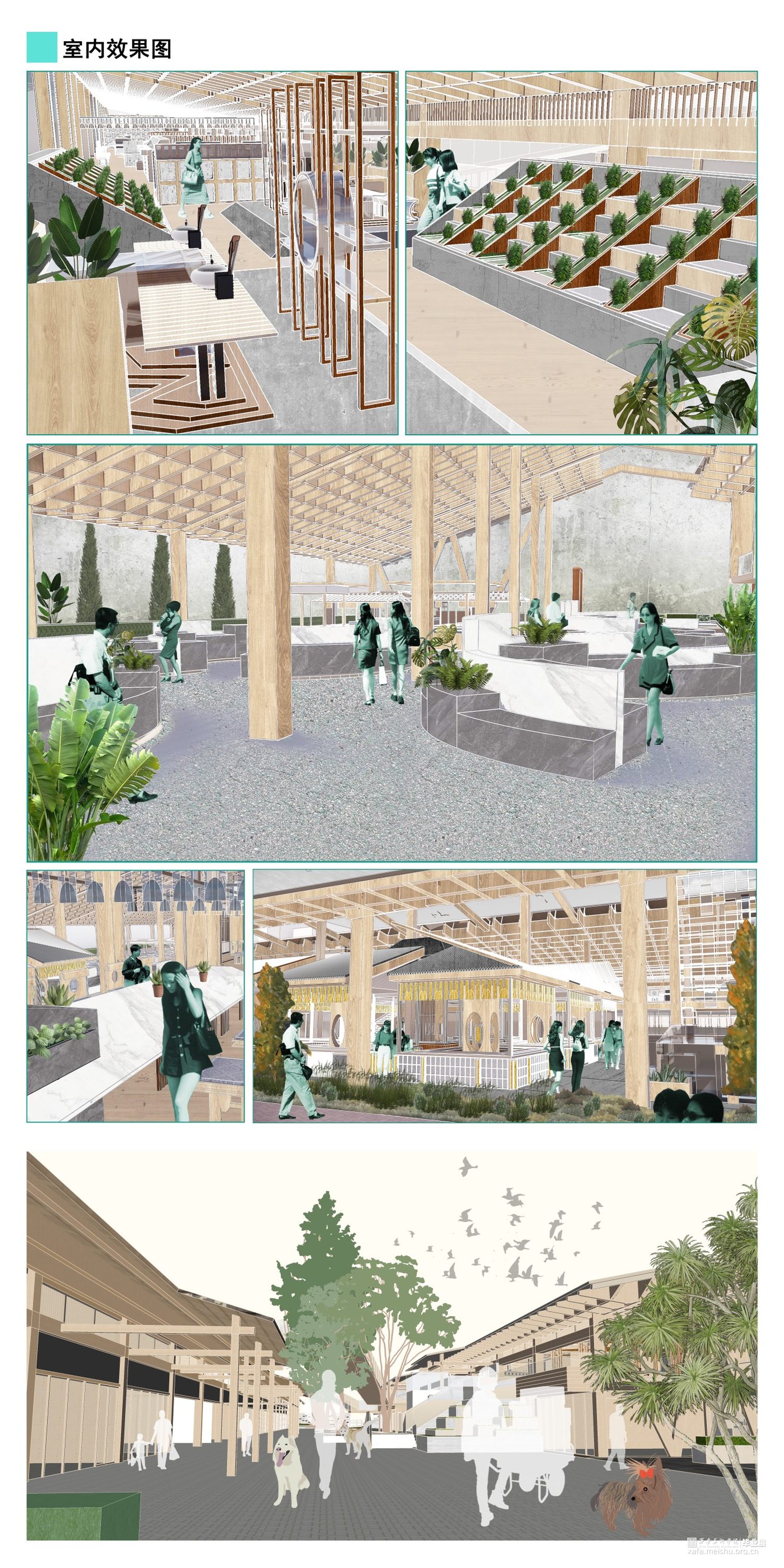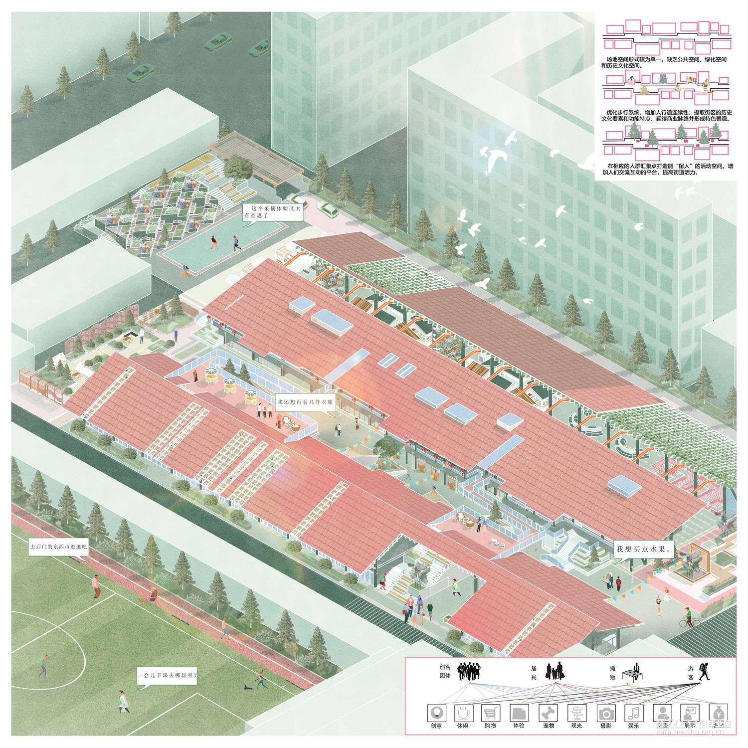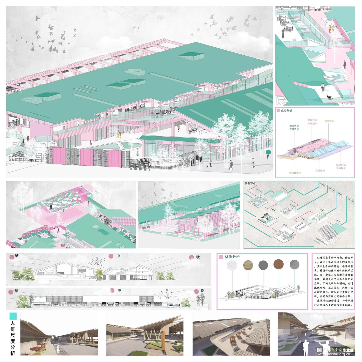 本项目选址在西安市雁塔区的天天利民综合市场,随着人民生活水平的不断提高,综合市场逐渐显现出一些弊端,难以满足现代消费者对于便捷舒适,多样化购物体验的需求。我们旨在打造一个顺应新时代的综合市场,通过对吃、行、娱、购、游几大要素合理布局,首先对空间布局进行合理优化,设计东西市集,一动一静,亦雅亦俗,老少皆宜。东市作为静态集市,以固定商铺为主,销售服装,瓷器,家具为主。西市大厅以蔬菜瓜果、粮油熟食、肉类冷鲜等为主,二层以麻将,品茗,快餐休息为主,面向世俗,人间烟火。同时打造了入口城市口袋公园以及种植体验广场。把生态种植、采摘体验、垂直绿化与景观相融合,满足了周边的绿色覆盖率以及促进了周边邻里社区之间的交往。然后是对建筑外观进行改造,运用传统民居坡屋顶的形式,结合木架构元素,是古代建筑形式的现代化转变,呼应主题“东西市”。对内部环境也进行了改善,加强通风采光,增设地下停车场,公共卫生间和休息区,提供全方位服务。同时在广场不定期举办生态产品展示,亲子种植领养活动等。通过活动策划。营造特色主题综合街区,展现地域文化魅力,不仅涵盖传统商业业态,还引入新兴业态,满足不同消费者需求。通过这次设计,为城市增添新的亮点。