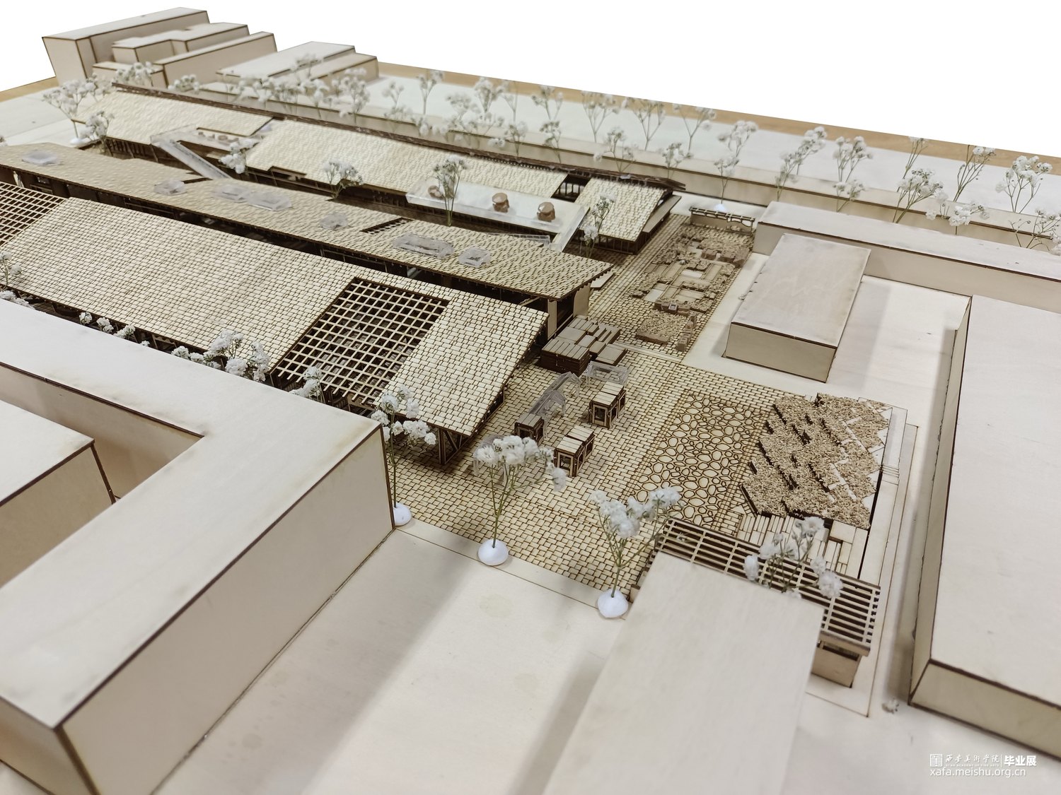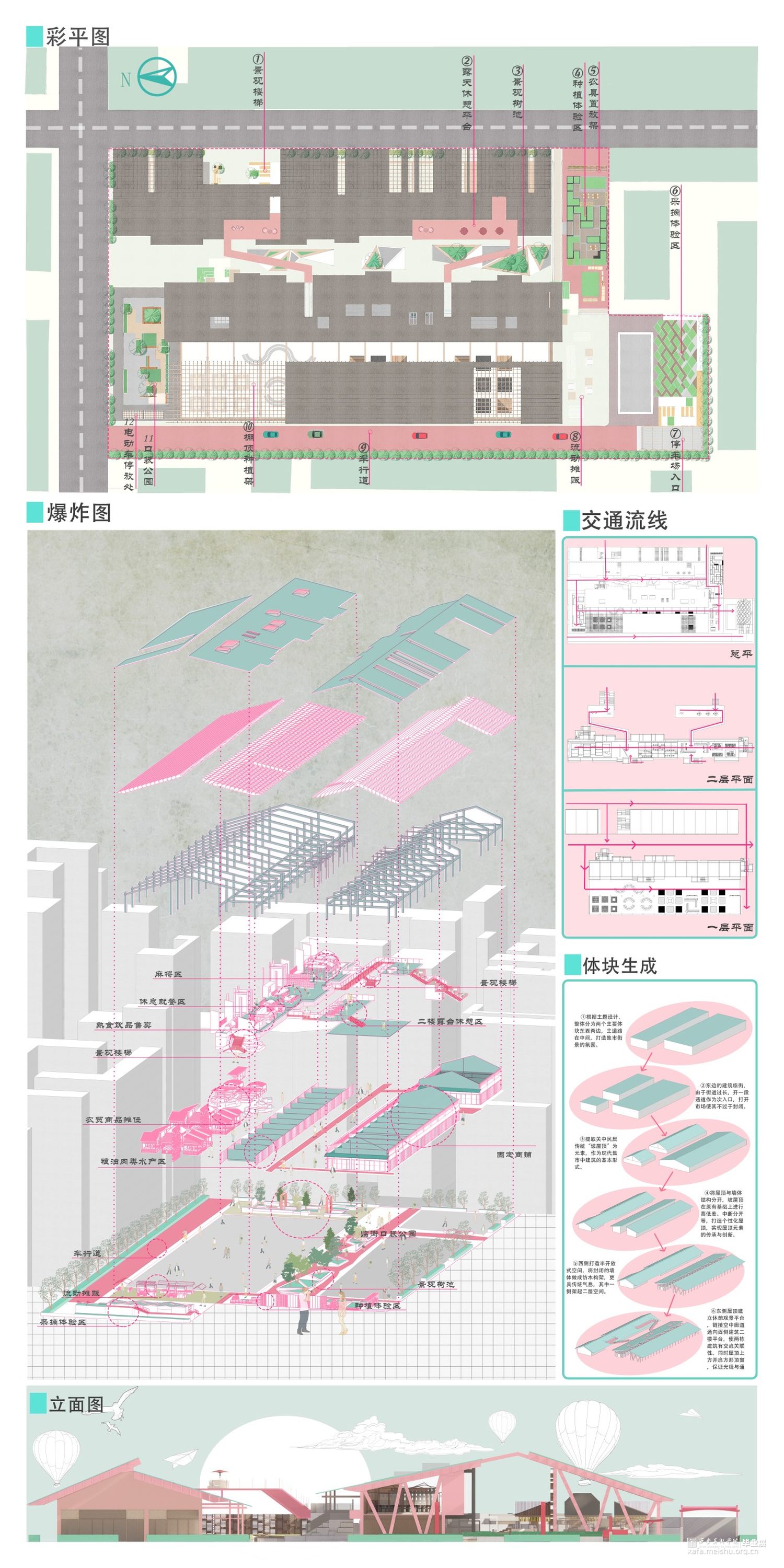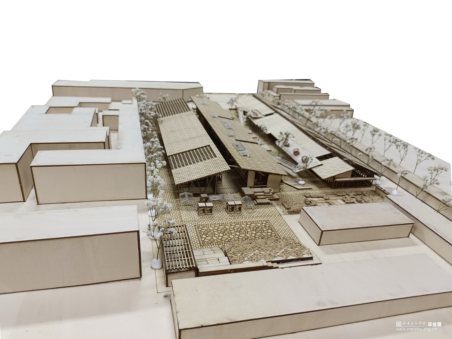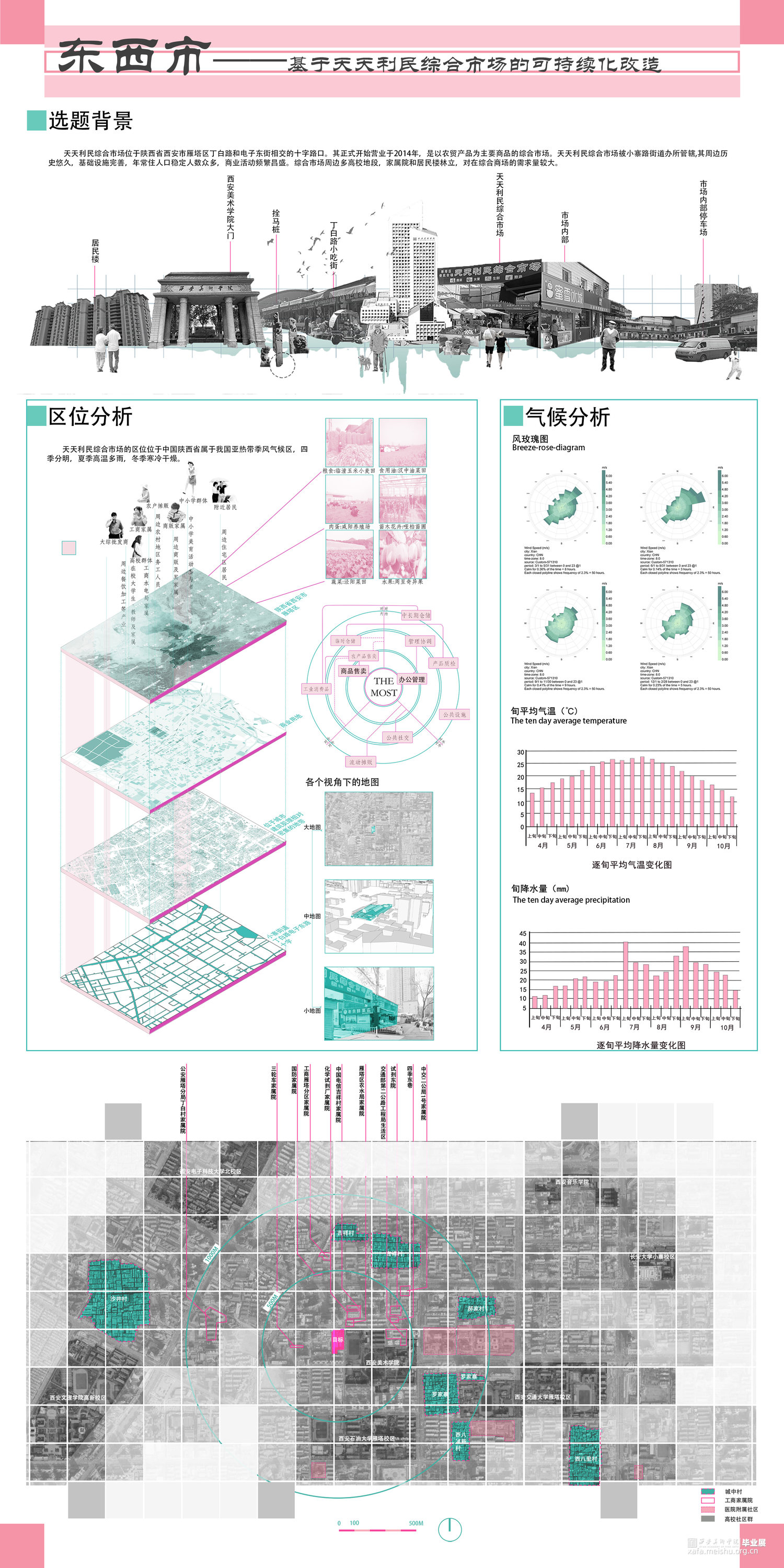 本项目选址在西安市雁塔区的天天利民综合市场,随着人民生活水平的不断提高,综合市场逐渐显现出一些弊端,难以满足现代消费者对于便捷舒适,多样化购物体验的需求。我们旨在打造一个顺应新时代的综合市场,通过对吃、行、娱、购、游几大要素合理布局,首先对空间布局进行合理优化,设计东西市集,一动一静,亦雅亦俗,老少皆宜。东市作为静态集市,以固定商铺为主,销售服装,瓷器,家具为主。西市大厅以蔬菜瓜果、粮油熟食、肉类冷鲜等为主,二层以麻将,品茗,快餐休息为主,面向世俗,人间烟火。同时打造了入口城市口袋公园以及种植体验广场。把生态种植、采摘体验、垂直绿化与景观相融合,满足了周边的绿色覆盖率以及促进了周边邻里社区之间的交往。然后是对建筑外观进行改造,运用传统民居坡屋顶的形式,结合木架构元素,是古代建筑形式的现代化转变,呼应主题“东西市”。对内部环境也进行了改善,加强通风采光,增设地下停车场,公共卫生间和休息区,提供全方位服务。同时在广场不定期举办生态产品展示,亲子种植领养活动等。通过活动策划。营造特色主题综合街区,展现地域文化魅力,不仅涵盖传统商业业态,还引入新兴业态,满足不同消费者需求。通过这次设计,为城市增添新的亮点。