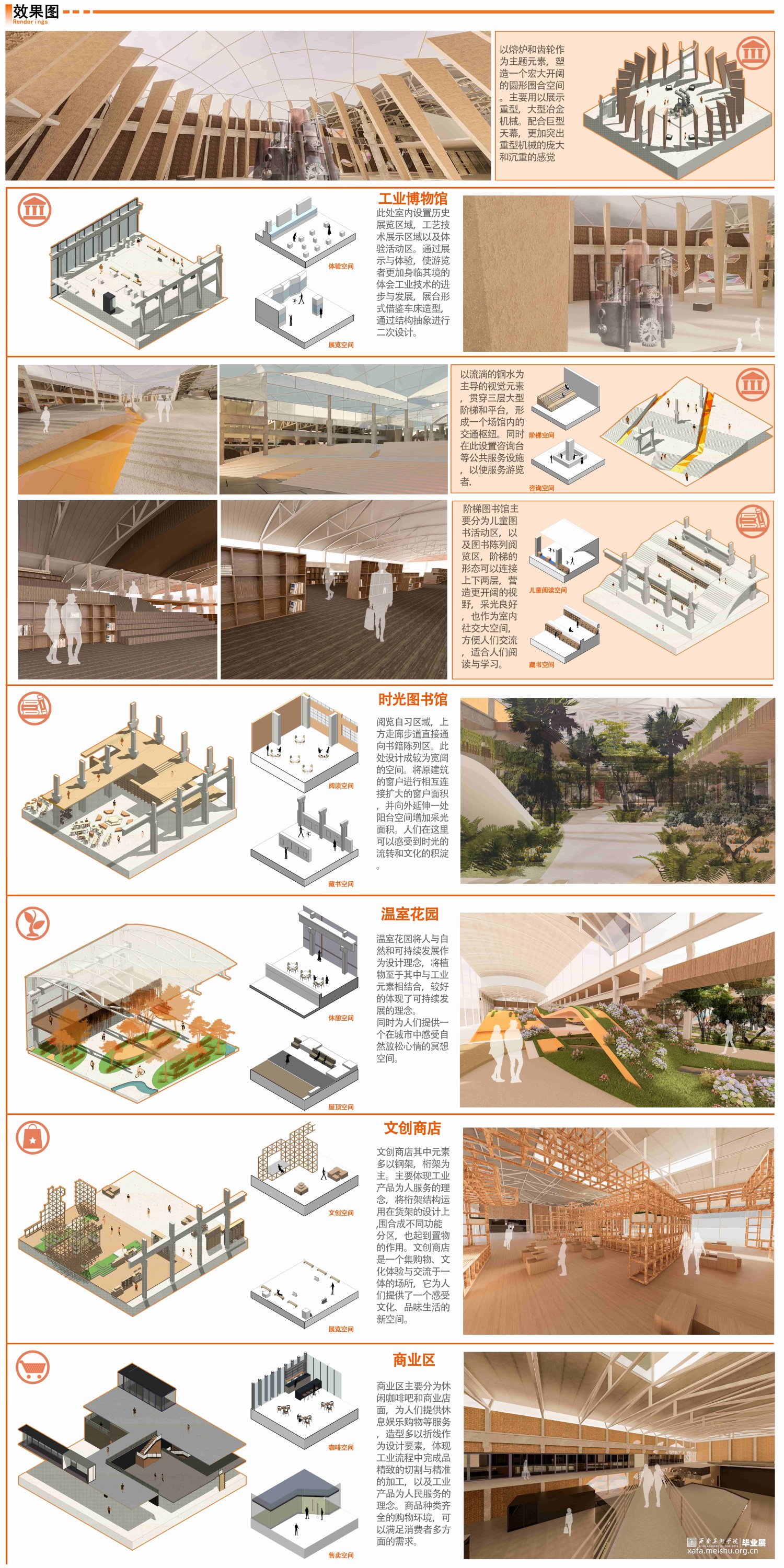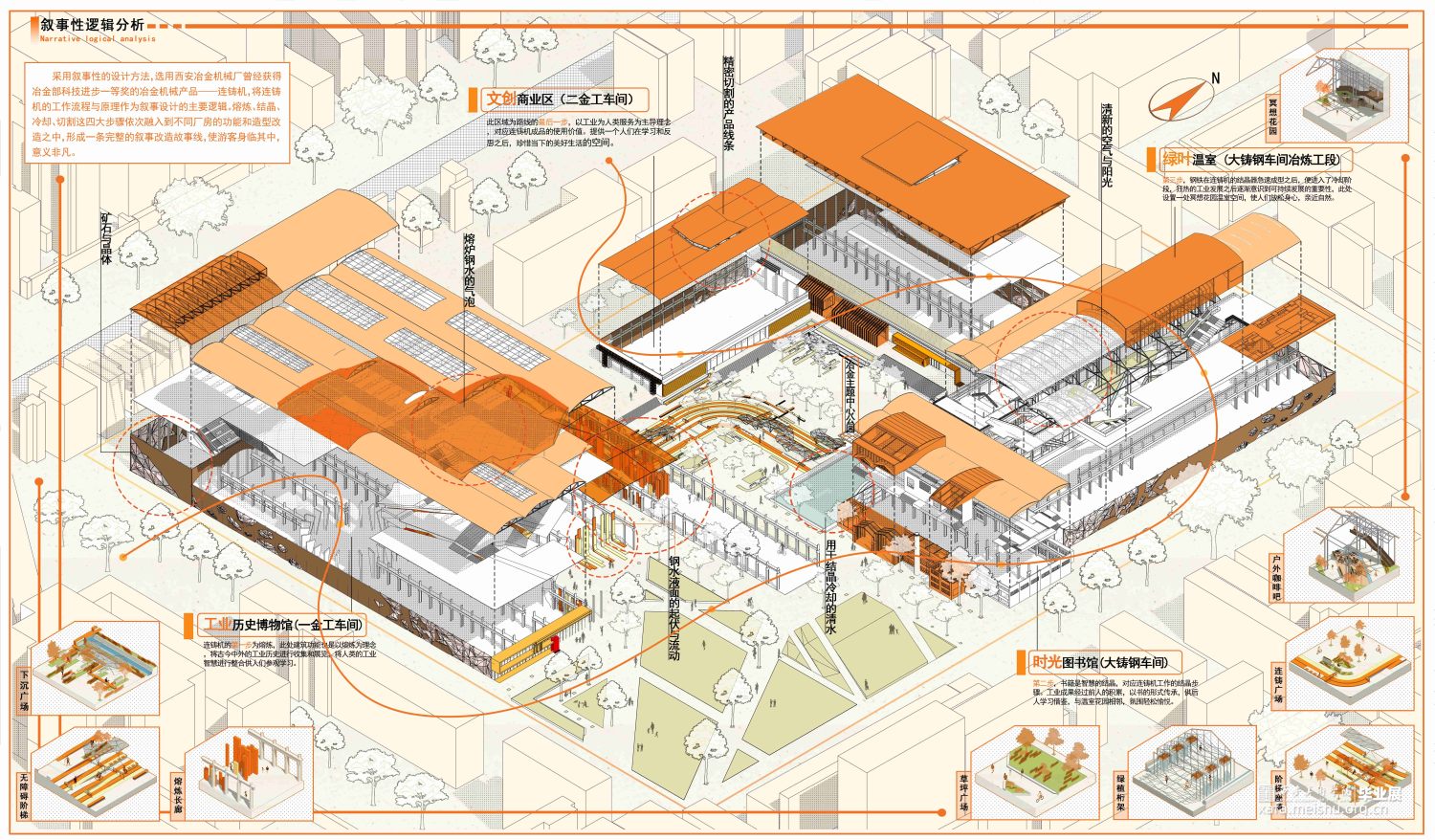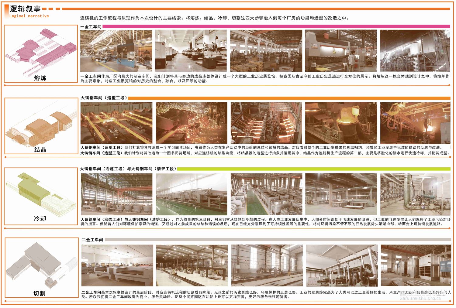 西安作为我国西部最重要的中心城市,其工业建设也是在相当早的时期开始建设并发展。经过多年的发展形成了具有相当规模的工业体系。通过对西安冶金机械厂遗址的改造,使其焕发新的活力,承载符合时代需求的新功能。唤醒老一辈集体的记忆,了解过去的艰难与荣誉。串联西安历史的过去与现在,感受时代的发展和工业的进步。通过对厂址的二次改造设计,唤醒原本工人曾经的记忆,同时也让后来的人们了解到过去的大生产时代的热情与活力,了解更多老一辈工人在厂区中艰苦奋斗,为祖国做出贡献的精神。采用叙事性的设计方法,选用西安冶金机械厂曾经获得冶金部科技进步一等奖的冶金产品——连铸机,以及连铸机的工作流程与原理作为本次设计的主要线索。将熔炼、结晶、冷却、切割这四大步骤融入到每个厂房的功能和造型的改造之中。将厂区曾经取得的辉煌成就融入设计之中,引导老一辈工人的自豪感,价值感。促使新一辈的人们也能通过这些当年的成果继续勇攀高峰。将冶金厂原厂区的南部区域改造为一个以文化历史展览为主,商业休闲为辅的综合文化园区。与西安城市东部的老钢厂、老菜场、大华纺织厂和半坡国际艺术区相呼应,与之配合形成一个相对完整的城市型工业遗产廊道。为周边居民提供一个可参观游览的休闲场所,对于外来游客来说,此场所可作为一个了解我国西部工业发展历史,参观西部现代工业成果的一个重要窗口。亦可以作为广大中小学生的一个爱国主义教育基地和历史学习基地。