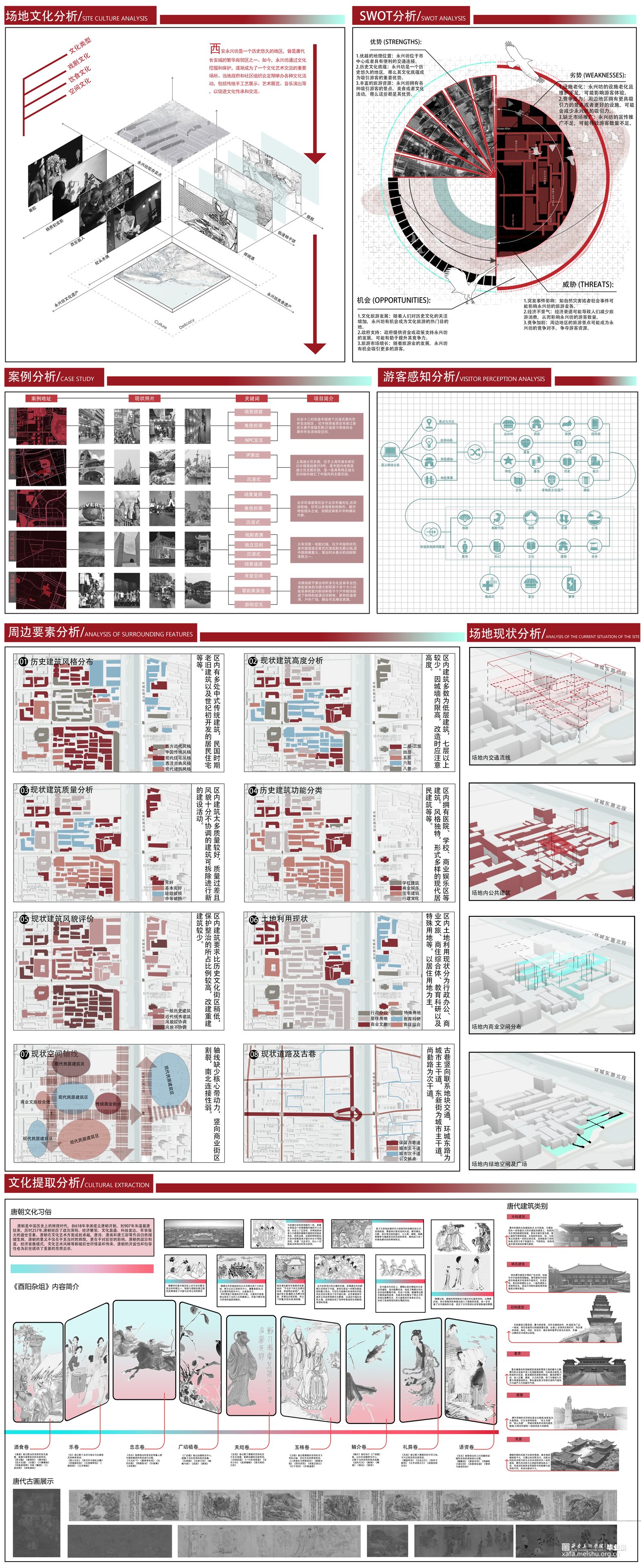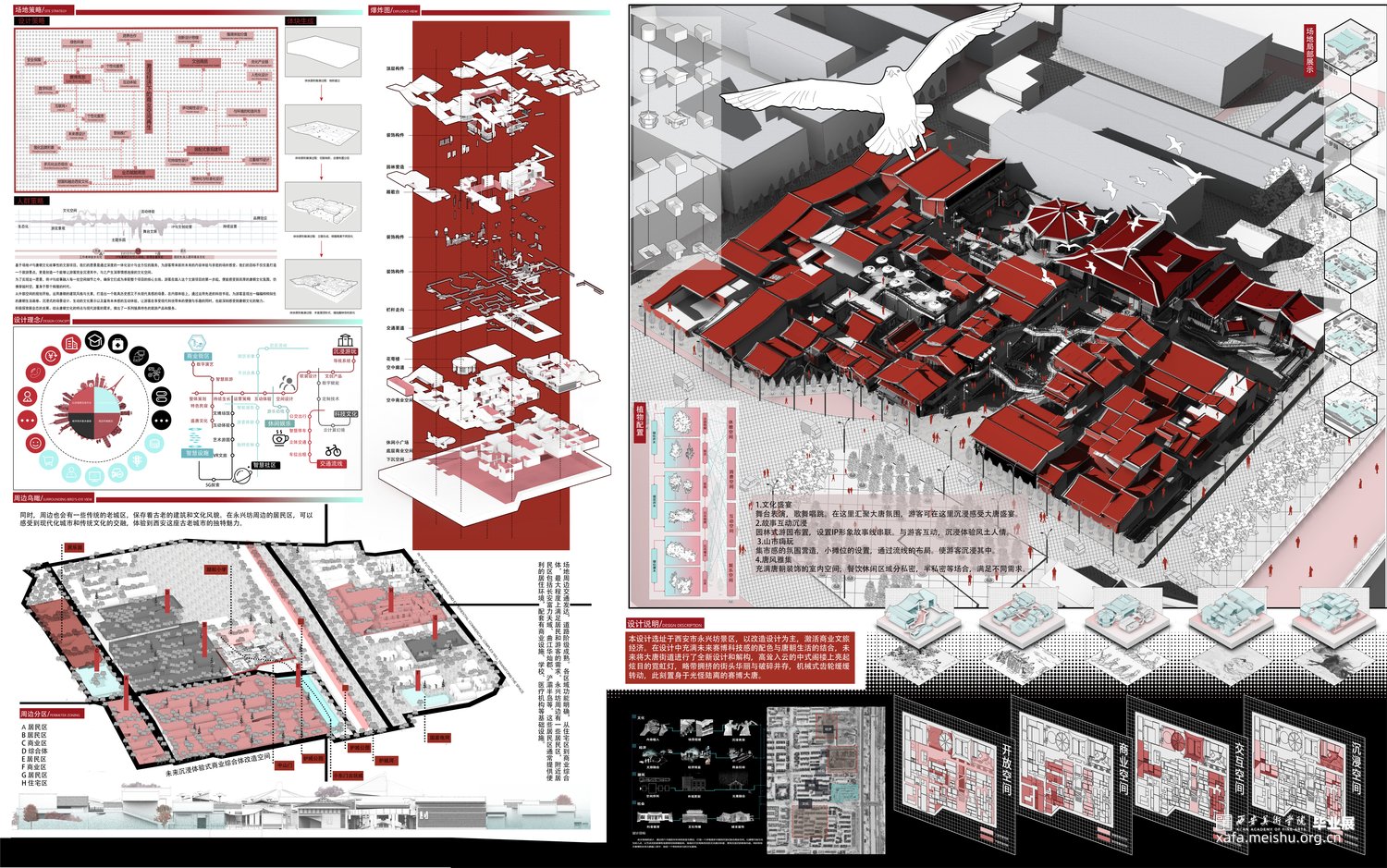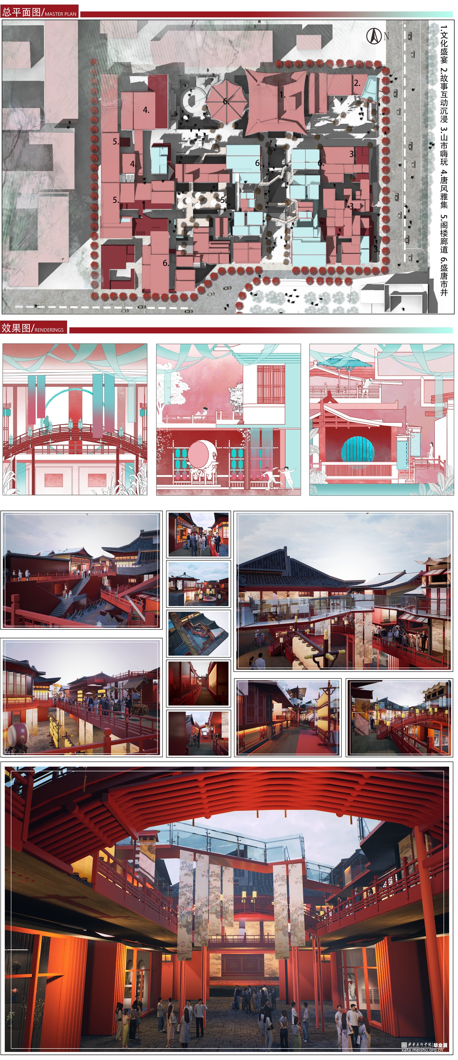本设计选址于西安市永兴坊景区,以永兴坊景区为基底,研究未来商业街区发展模式,以激活商业文旅经济。在设计中充满未来赛博科技感的配色与唐朝生活的结合,未来将大唐街道进行了全新设计和解构,现代中式阁楼上亮起炫目的霓虹灯,略带拥挤的街头华丽与破碎并存,机械式齿轮缓缓转动,此刻置身于光怪陆离的赛博大唐街区。设计引进唐代志怪小说《酉阳杂俎》为故事线,游客进入将会以沉浸式的场景搭建与整体氛围渲染来感受唐朝的市井文化与民众习俗,同时感受传统与未来在街坊空间中的碰撞与交融。