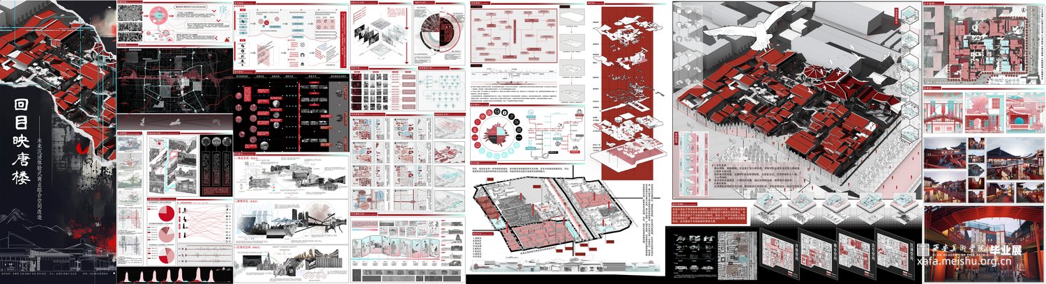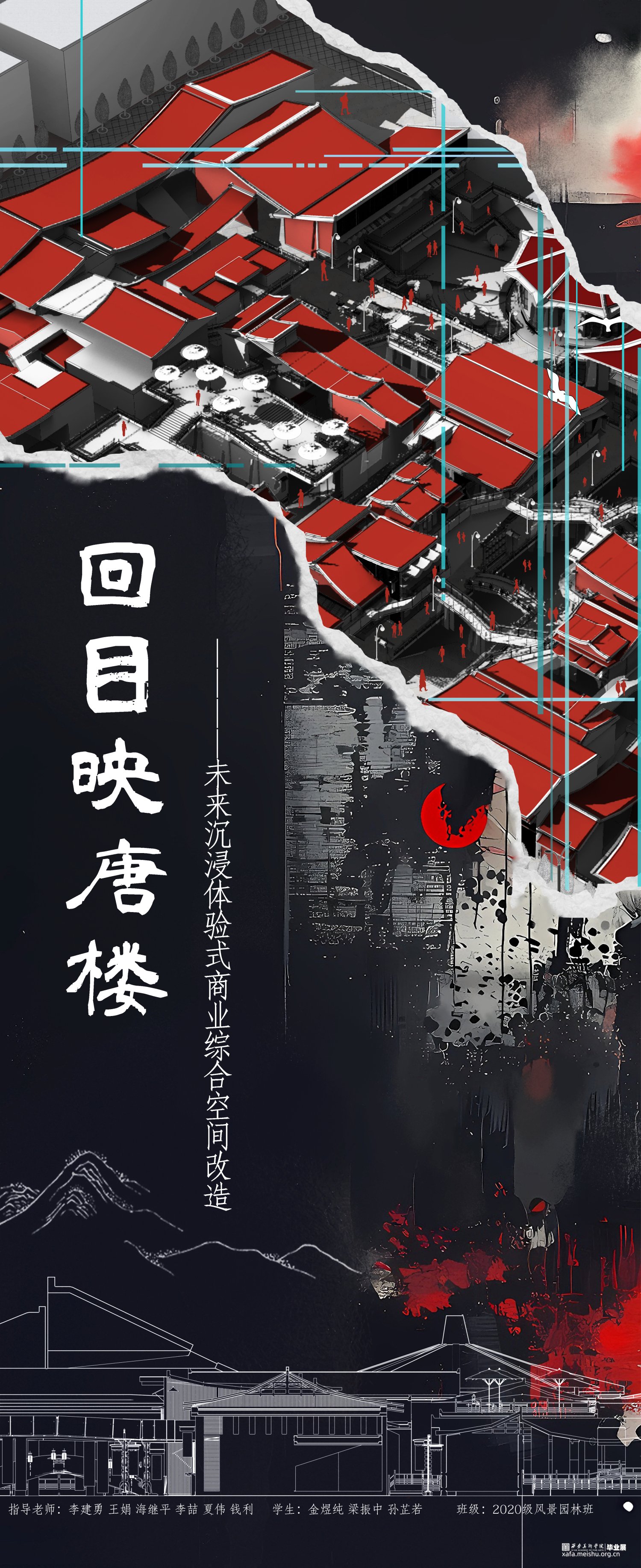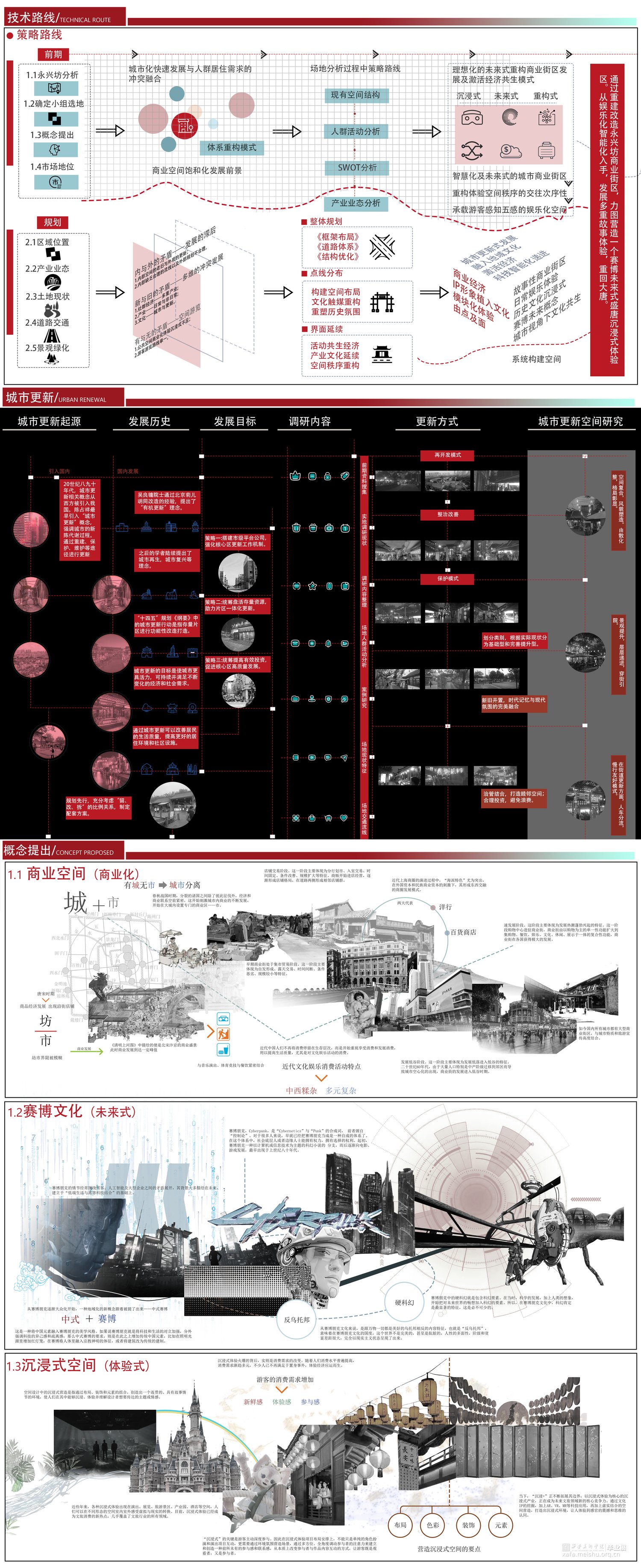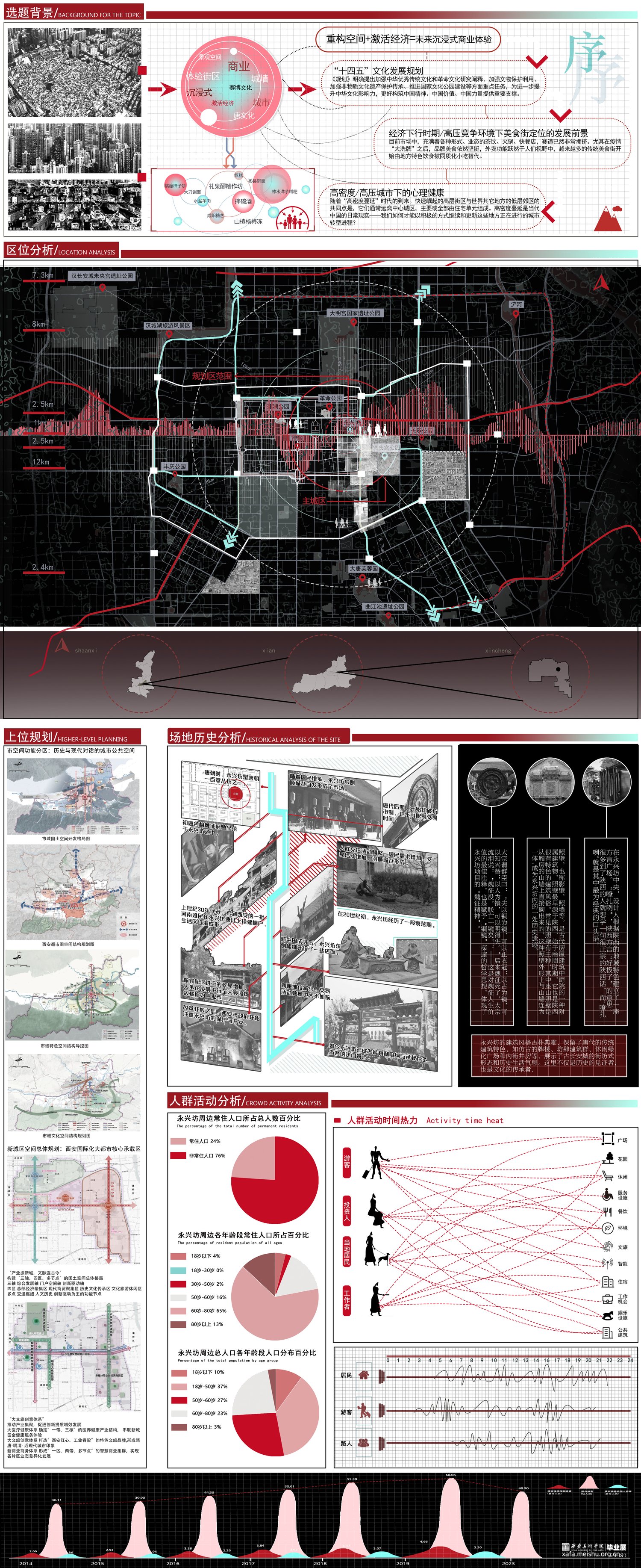 本设计选址于西安市永兴坊景区,以永兴坊景区为基底,研究未来商业街区发展模式,以激活商业文旅经济。在设计中充满未来赛博科技感的配色与唐朝生活的结合,未来将大唐街道进行了全新设计和解构,现代中式阁楼上亮起炫目的霓虹灯,略带拥挤的街头华丽与破碎并存,机械式齿轮缓缓转动,此刻置身于光怪陆离的赛博大唐街区。设计引进唐代志怪小说《酉阳杂俎》为故事线,游客进入将会以沉浸式的场景搭建与整体氛围渲染来感受唐朝的市井文化与民众习俗,同时感受传统与未来在街坊空间中的碰撞与交融。