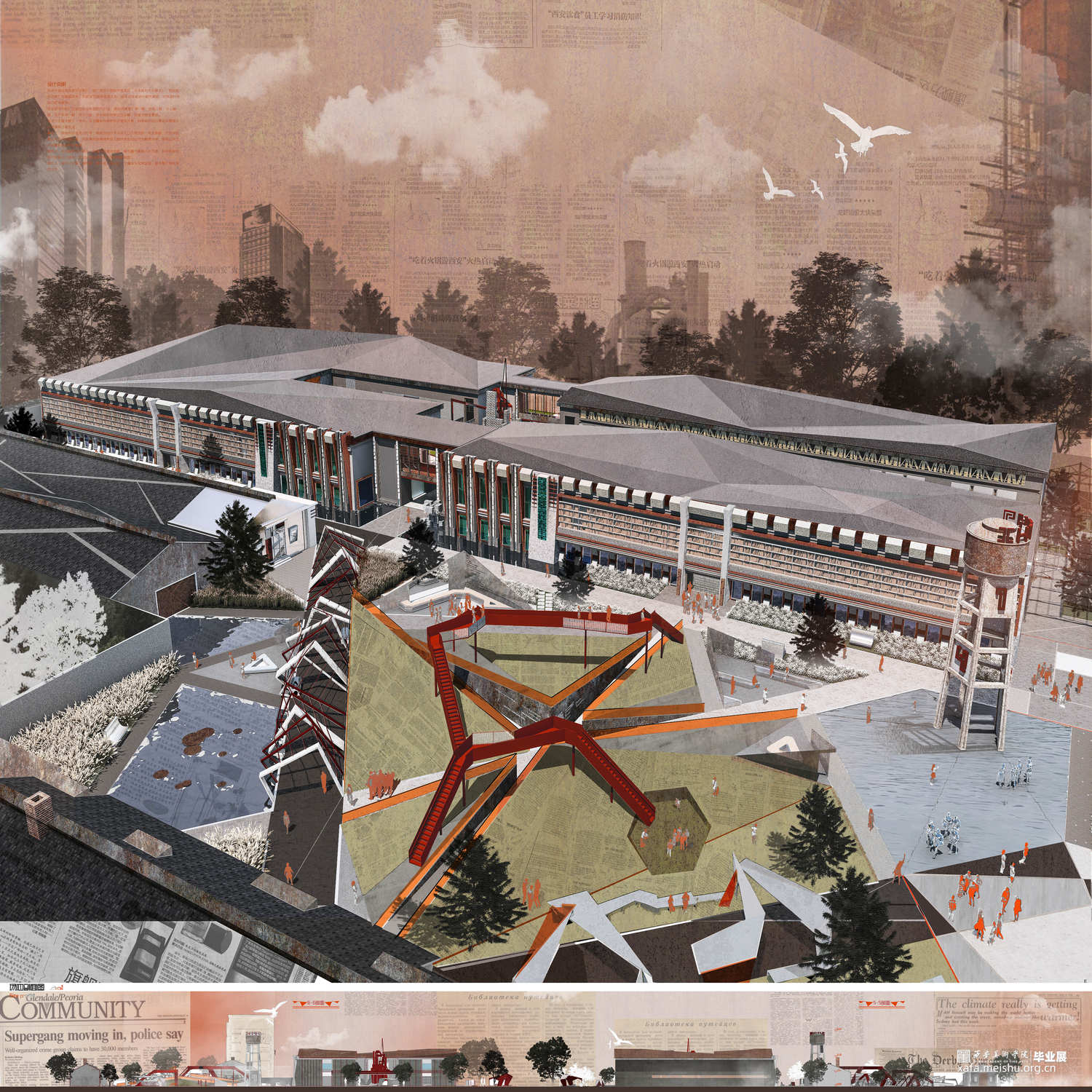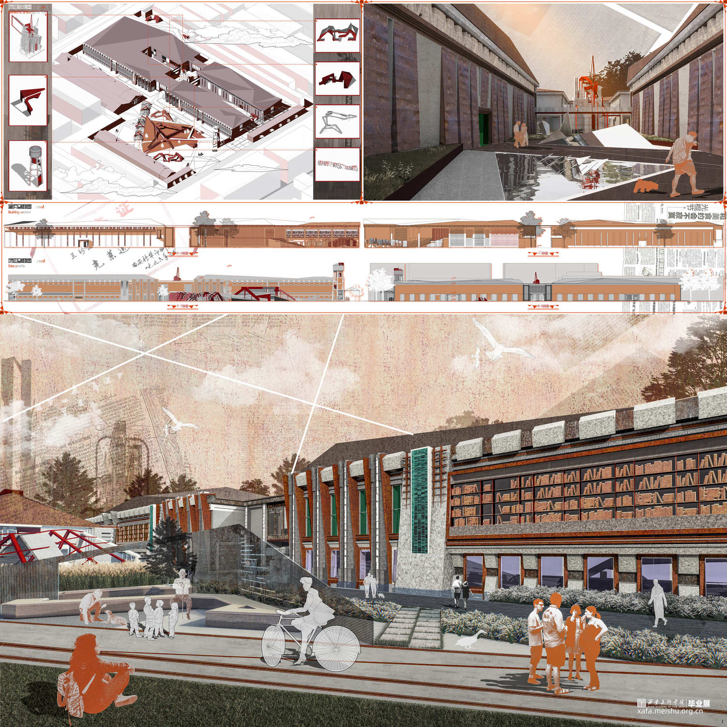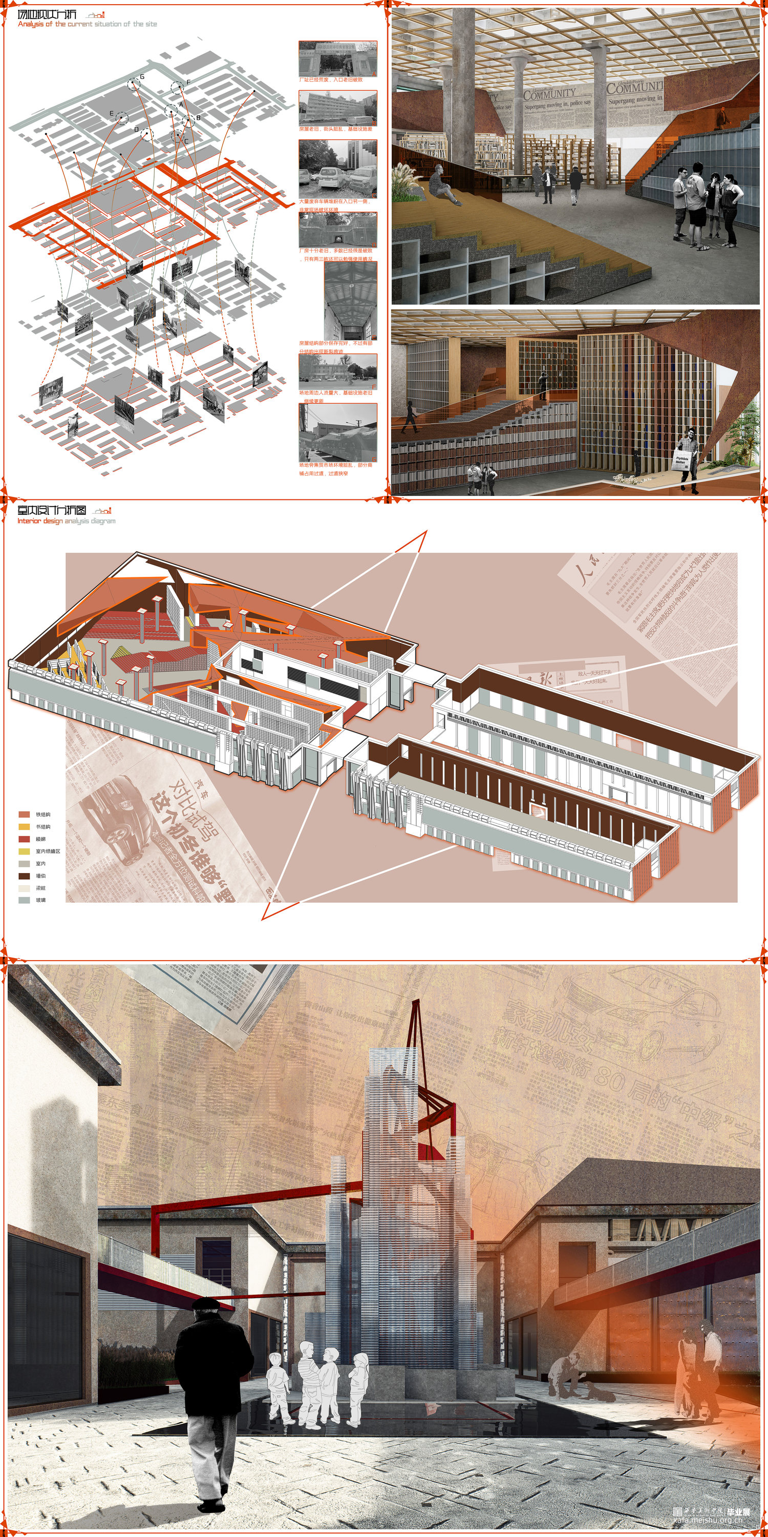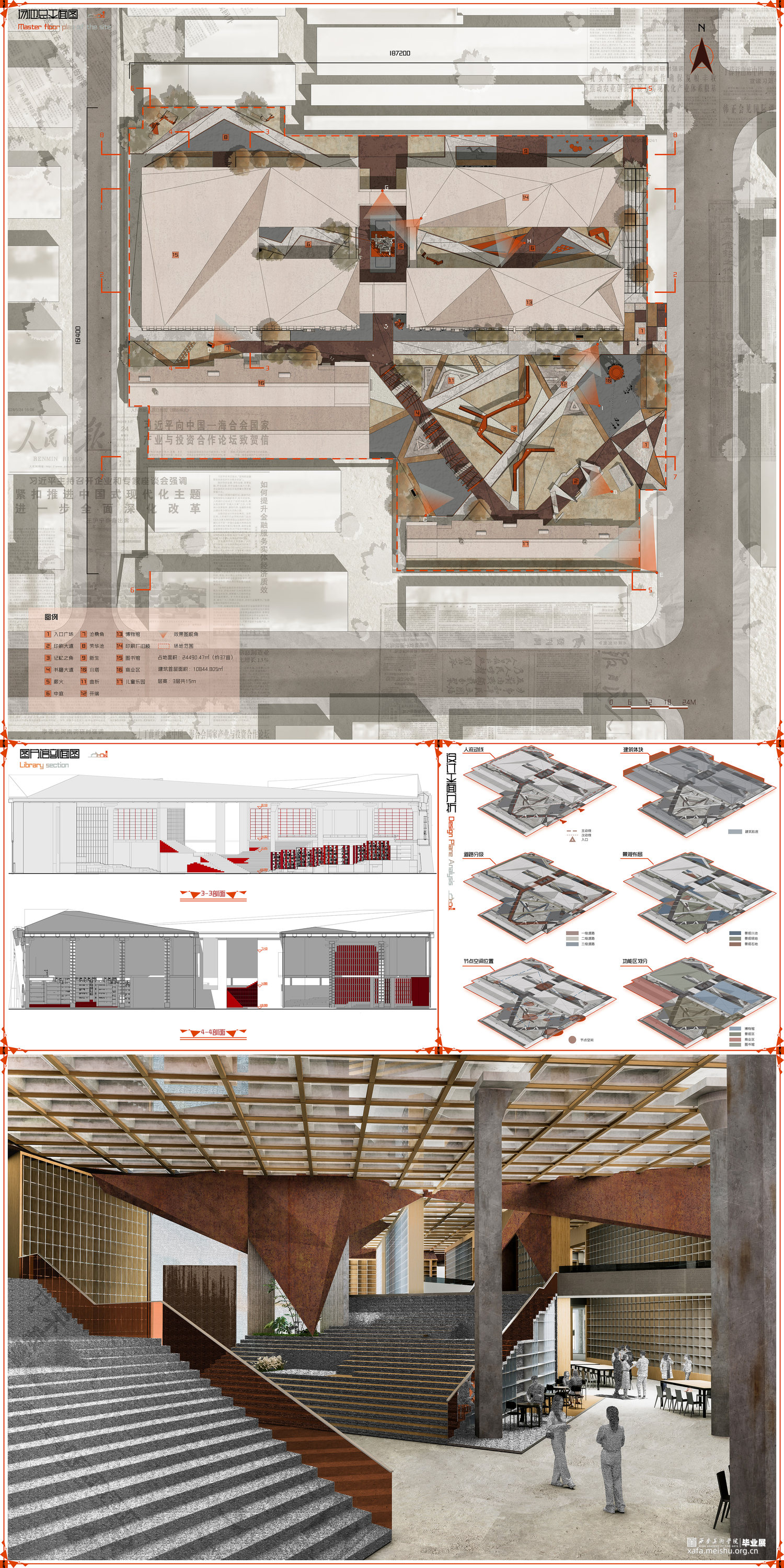 本设计主题为薪火·芳华,从书籍报刊等纸张中提取元素,对场地内进行景观环境提升以及建筑立面改造。