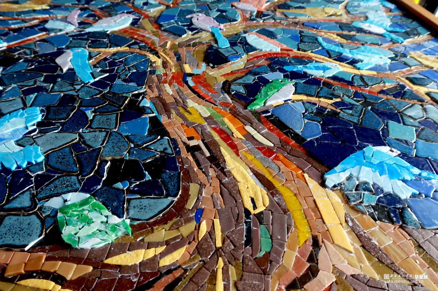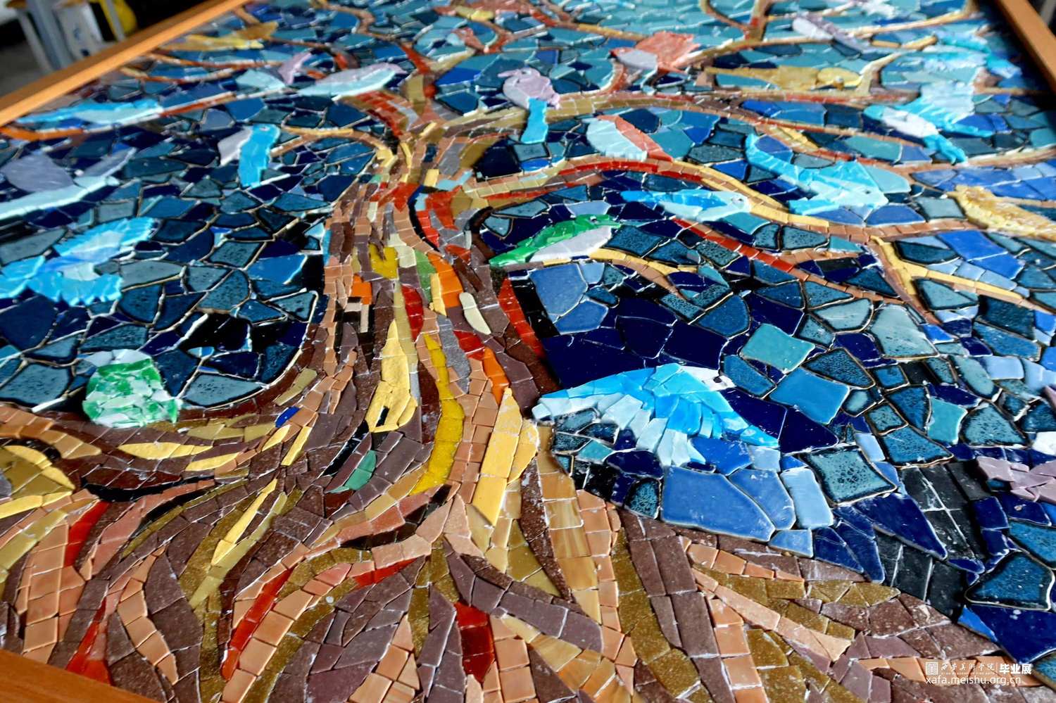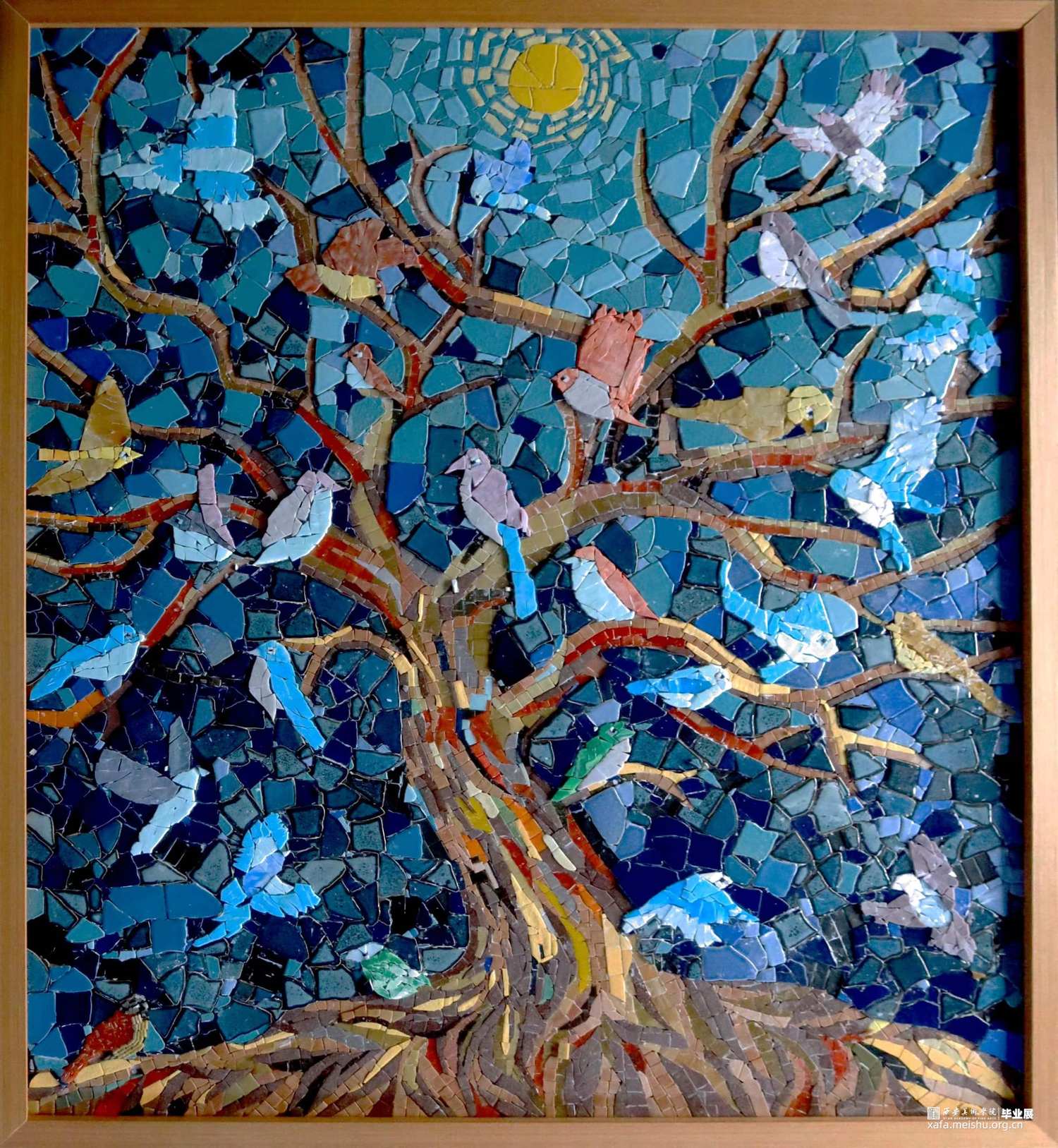 在马赛克镶嵌技术上有创新的运用,采用了新的材料组合、切割方式、拼贴技巧等,以创造出更加生动立体、细腻的树木形态和纹理效果。运用多个玻璃块材质的结合,探索其材质组合后产生的反应,结合空间与质感表达探讨材料对于画面的表现。运用不同深浅冷暖的色调来表现平面插画在马赛克镶嵌工艺的表现。作品突破了传统马赛克作品的审美风格,融合了现代艺术的元素,如抽象表现、简约风格、色彩对比等,以创造出更加个性化和时尚的艺术效果。