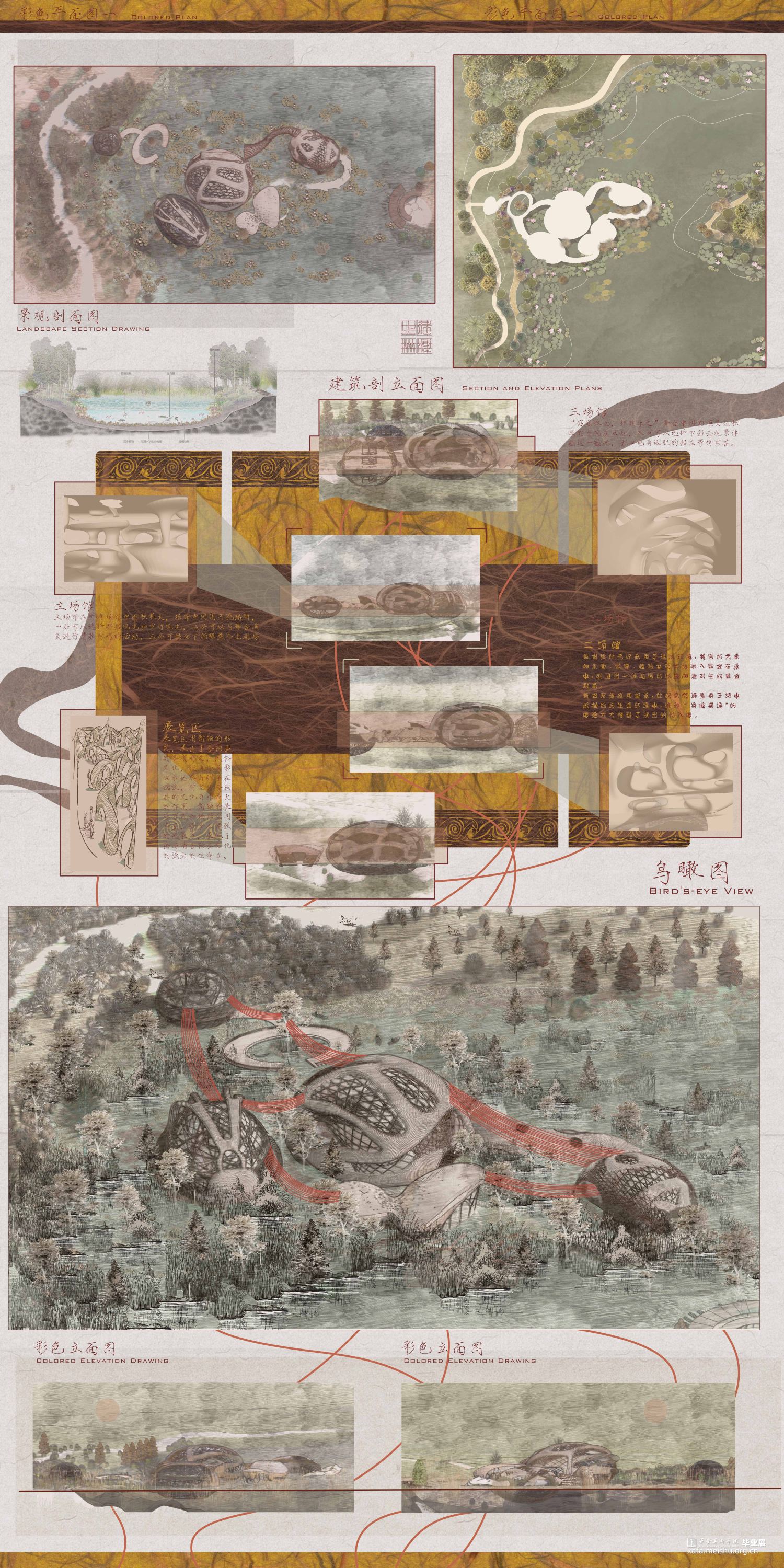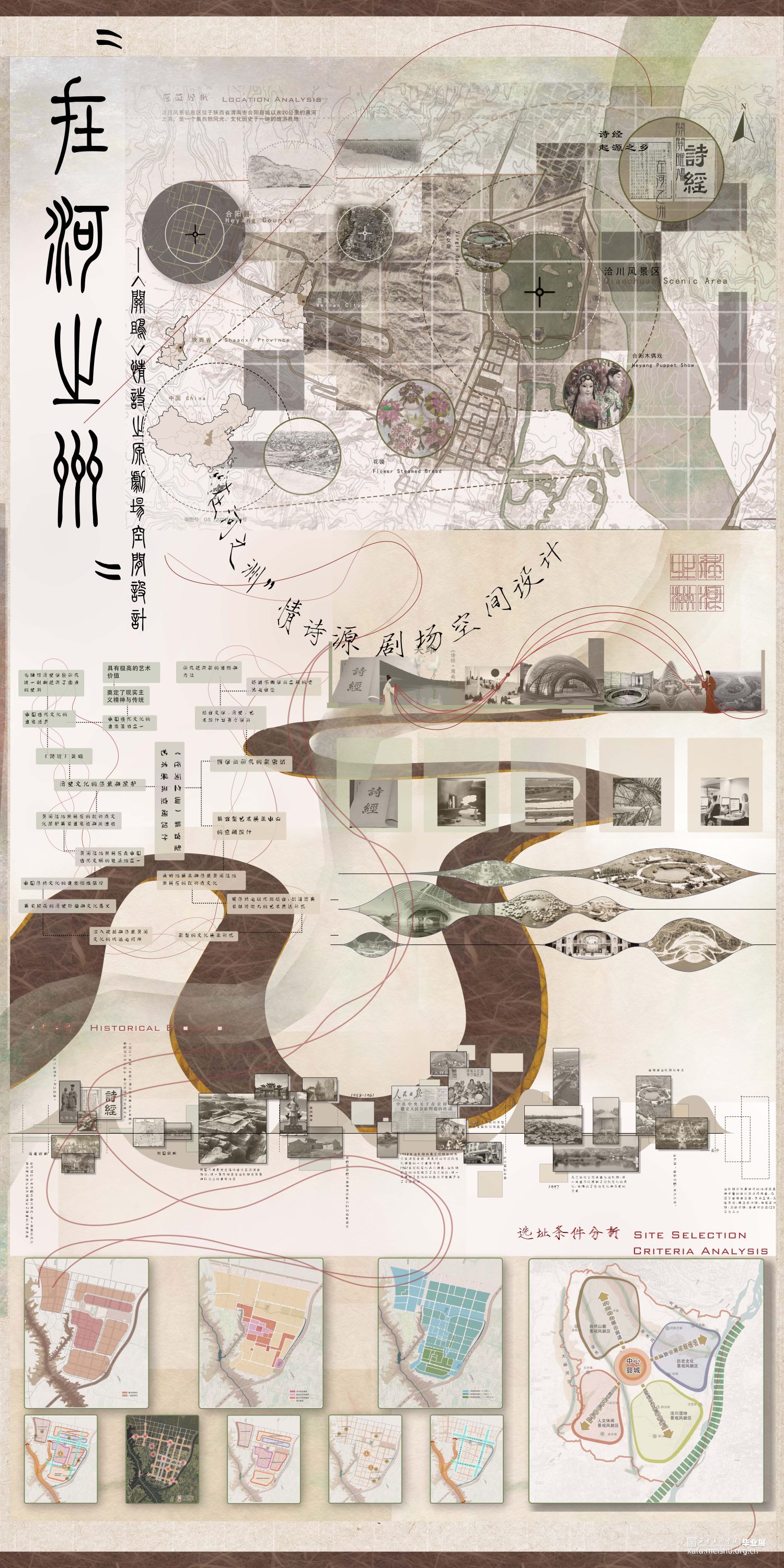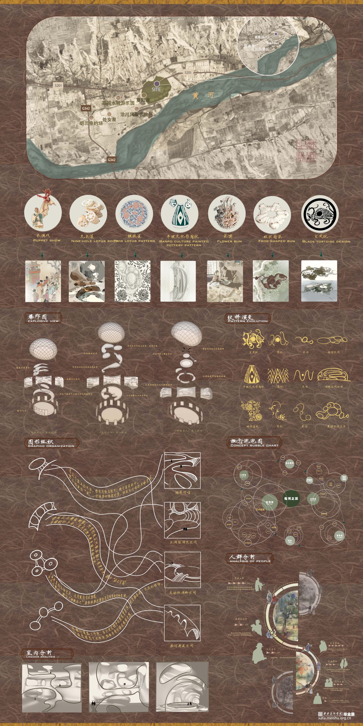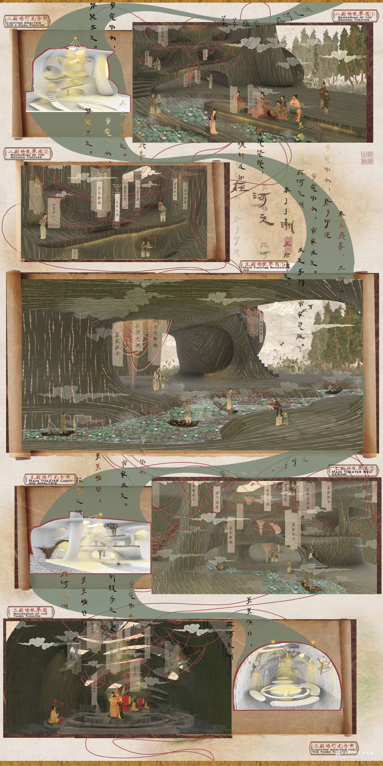 本作品以诗经《关雎》为线索,受到黄河流域的非物质文化的启发,结合剧场空间这一载体,意图采用当代与传统相结合的手法,致力于创作一个诗情画意、可持续性的空间环境。我们希望通过这个设计,将诗经中的诗句与空间相结合,让书里的诗句走出二维平面,来到三维空间,并且可以引发人们对于环境共生型空间设计的思考和共鸣。