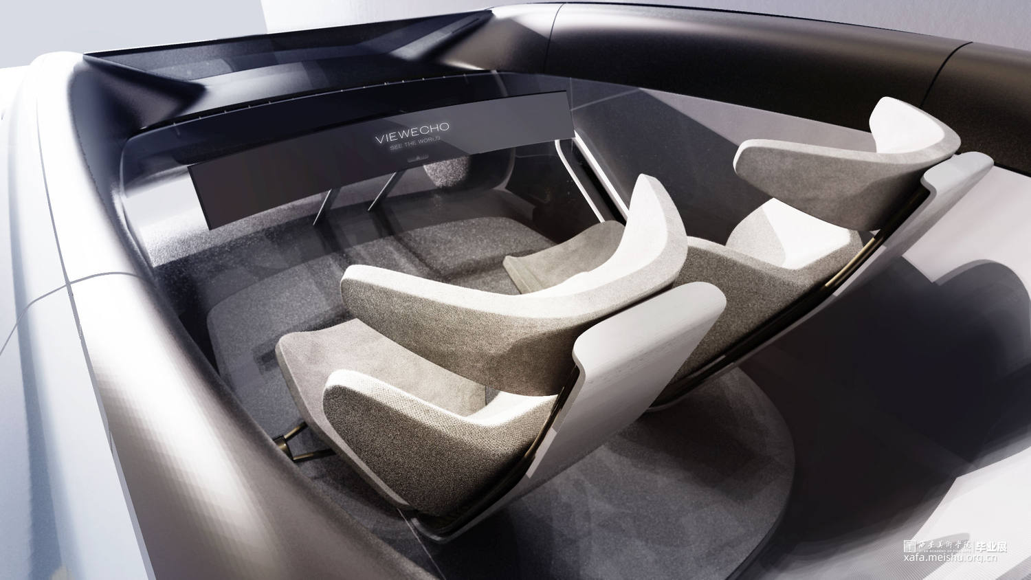 中国汽车产业正在以其独特的活力与韧性不断吸引世界目光,我们团队致力于探索中国审美下的情感化设计,主张「情随景至」的设计观点. VIEWECHO 意为“观感共鸣”。中国审美文化强调自然与和谐。VIEWECHO 的双形态设计满足用户在不同场景下的需求。驾驶场景下为全包裹结构,充分保障驾驶安全和用户隐私。充斥未来感的造型风格、虚拟现实驾驶系统、前卫简洁的外观设计和富有中式对称美的形态,让 VIEWECHO 置身现代城市见证东方世界的未来已来。观光形态下,座舱升起,乘坐者可相向而坐,提供“对话”场景。此形态的设计