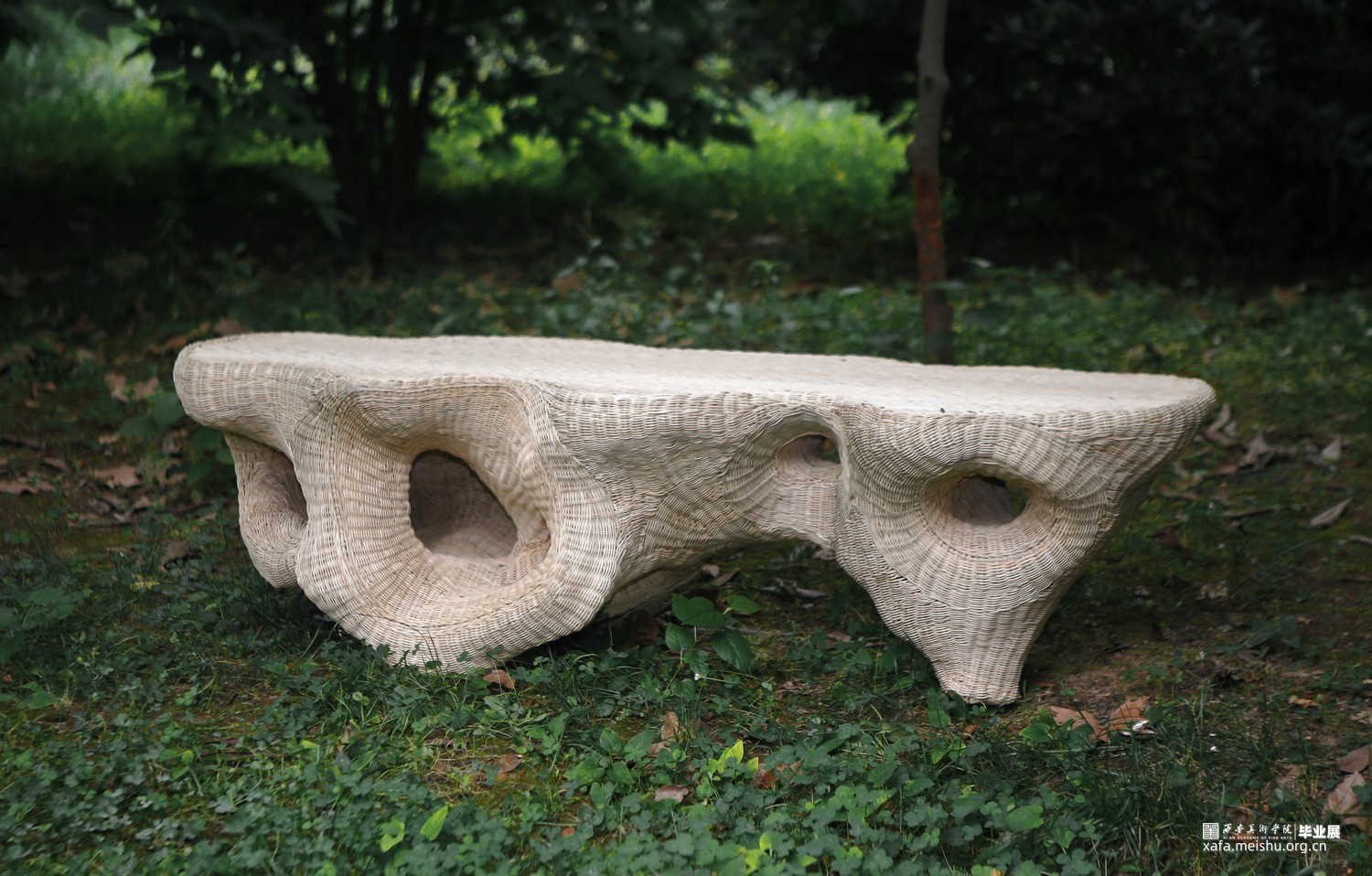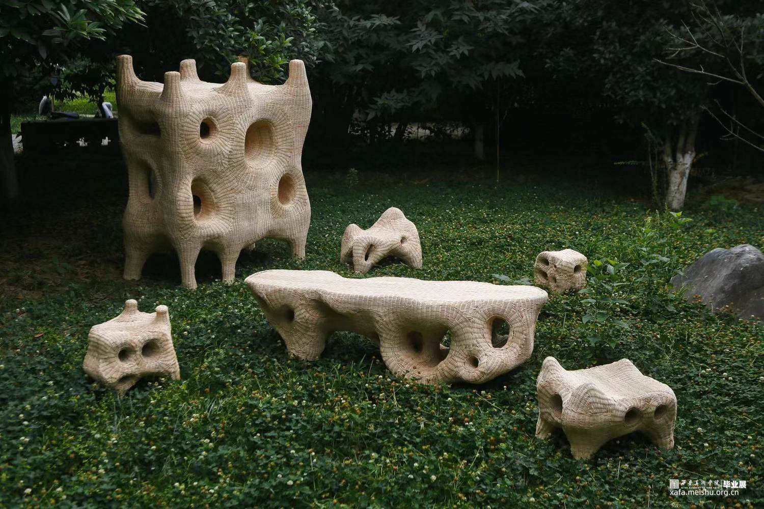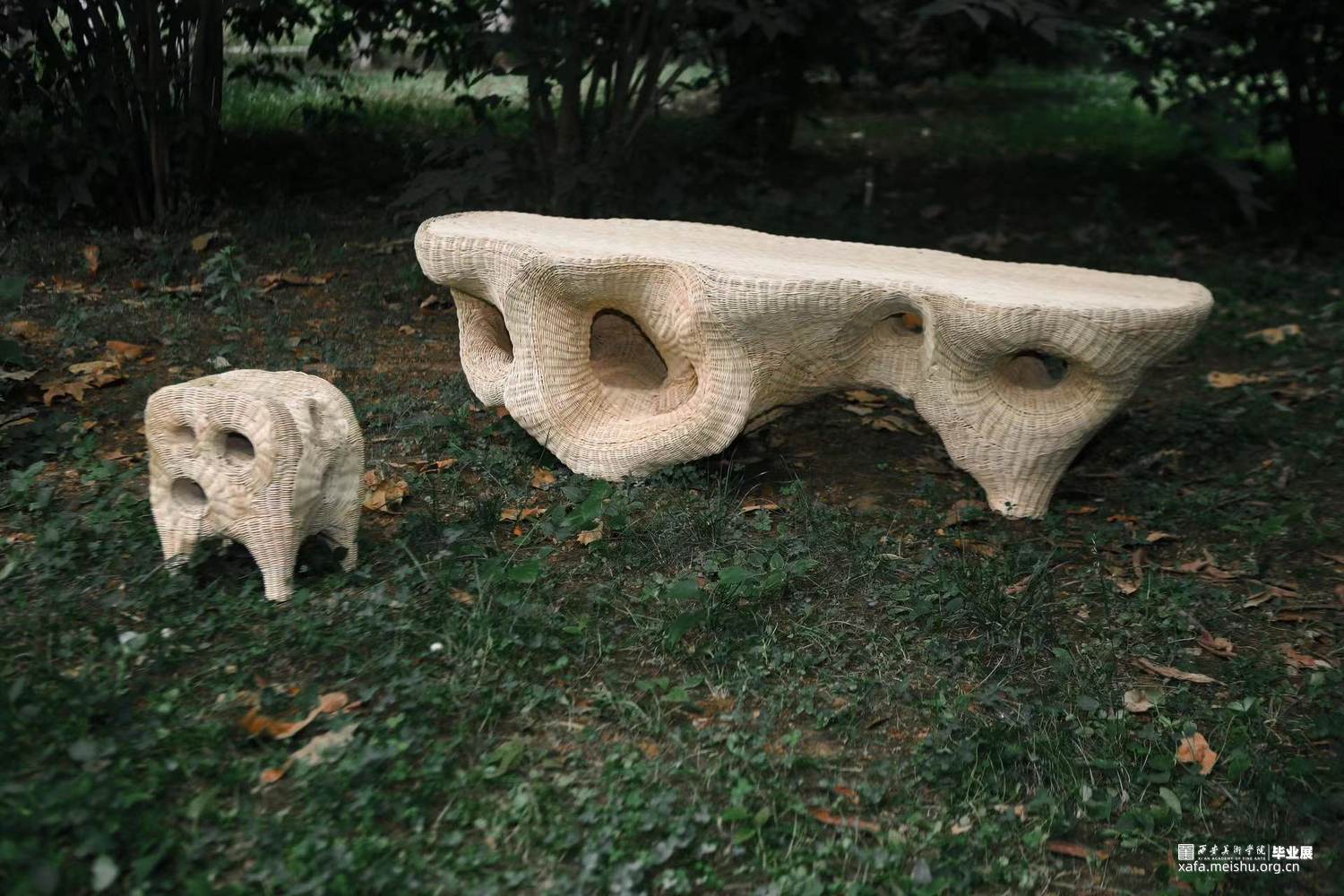 在这组作品当中,每一件作品都如同一块精心雕琢的自然艺术品,展现出孔洞与曲线的和谐美感,犹如太湖石的天然纹理,带给人一种回归自然的宁静与舒适。家具的结构设计受自然溶洞启发,形成独特的空间感和透气性,既美观又实用。而陕北的地形地貌的元素则赋予作品一种深厚的地域文化内涵,仿佛将当地的风土融入到了现代家居的生活当中。