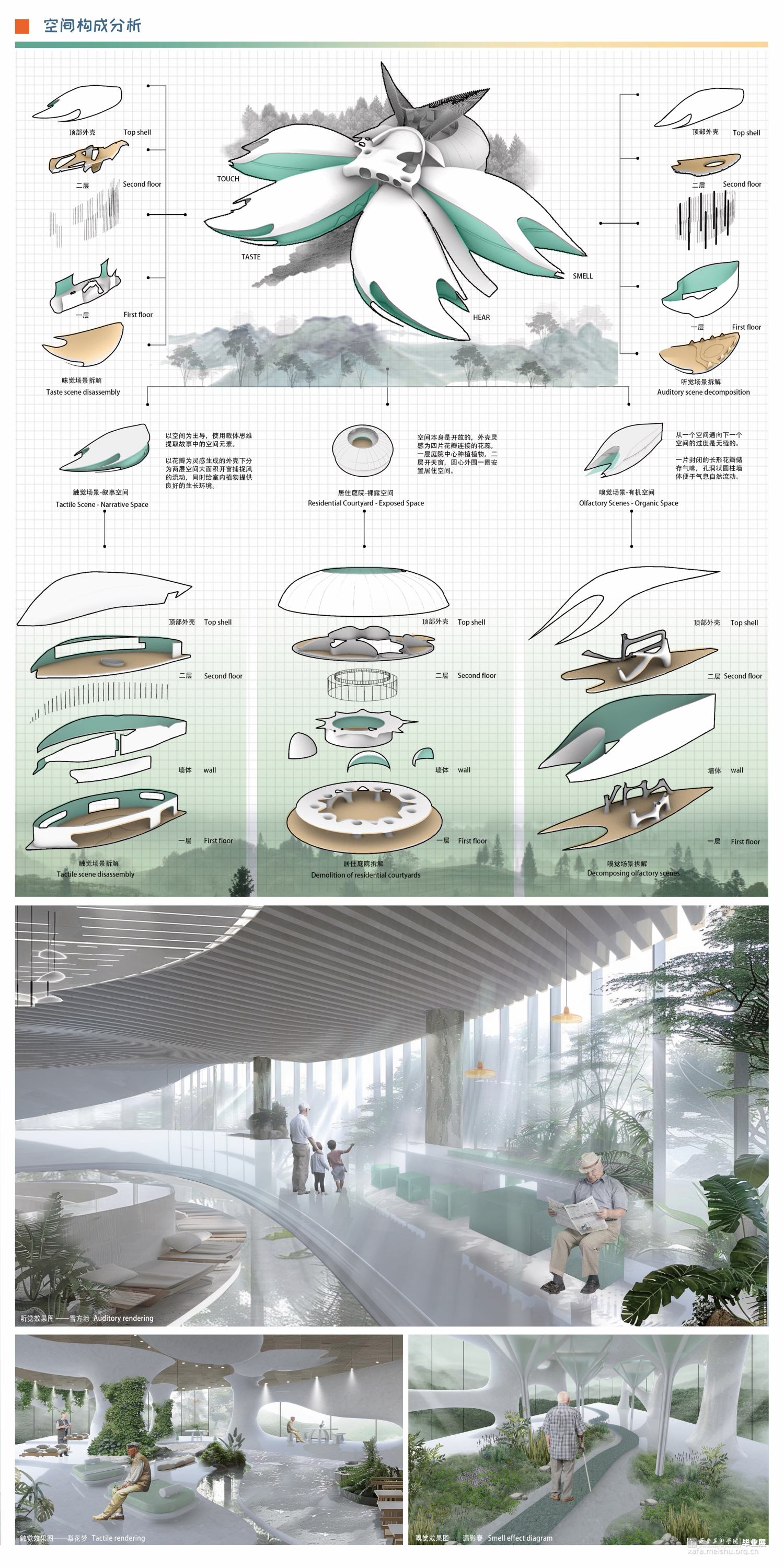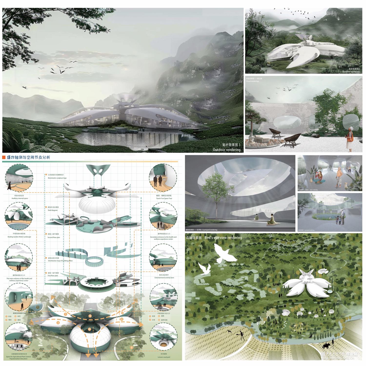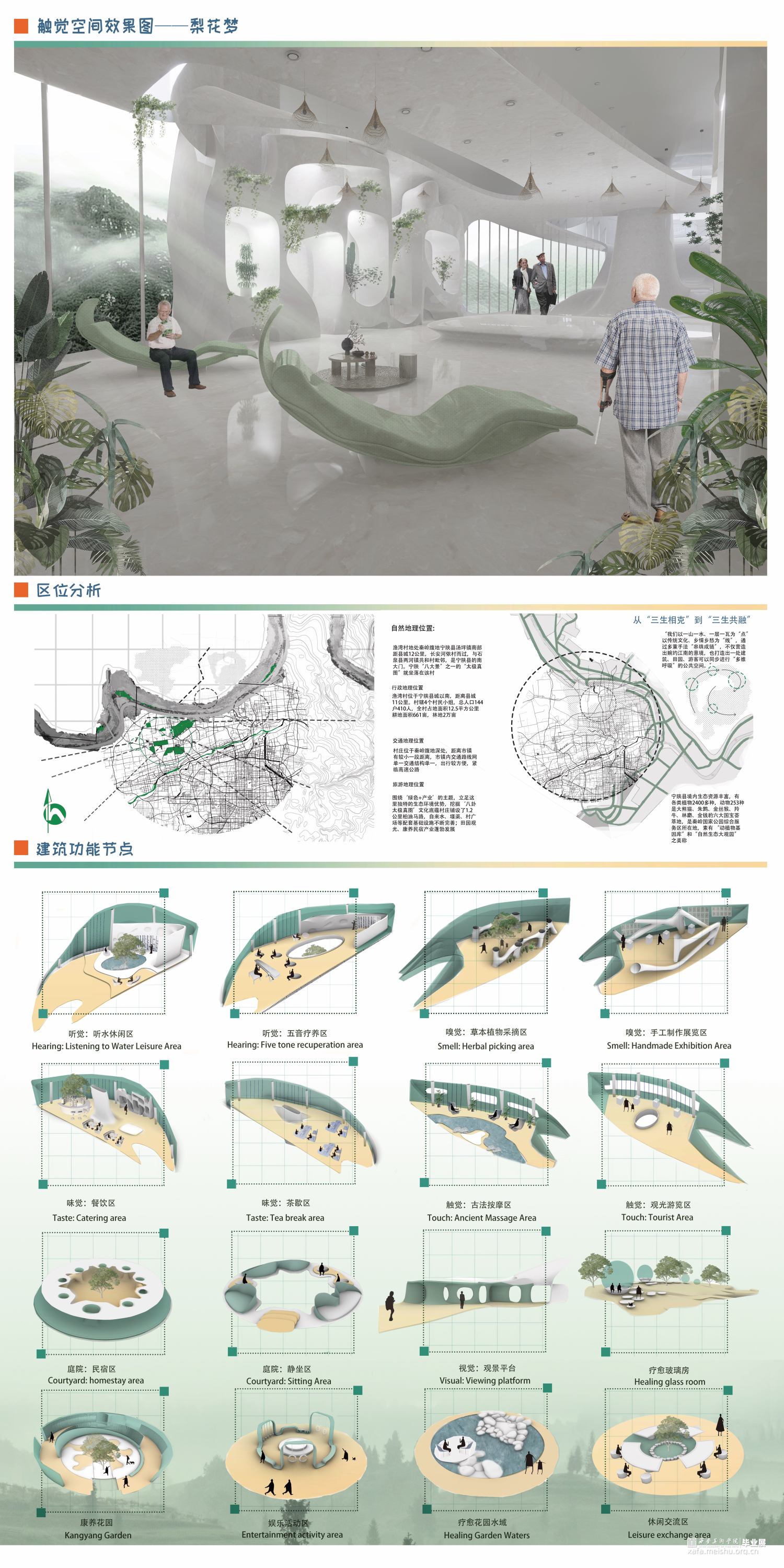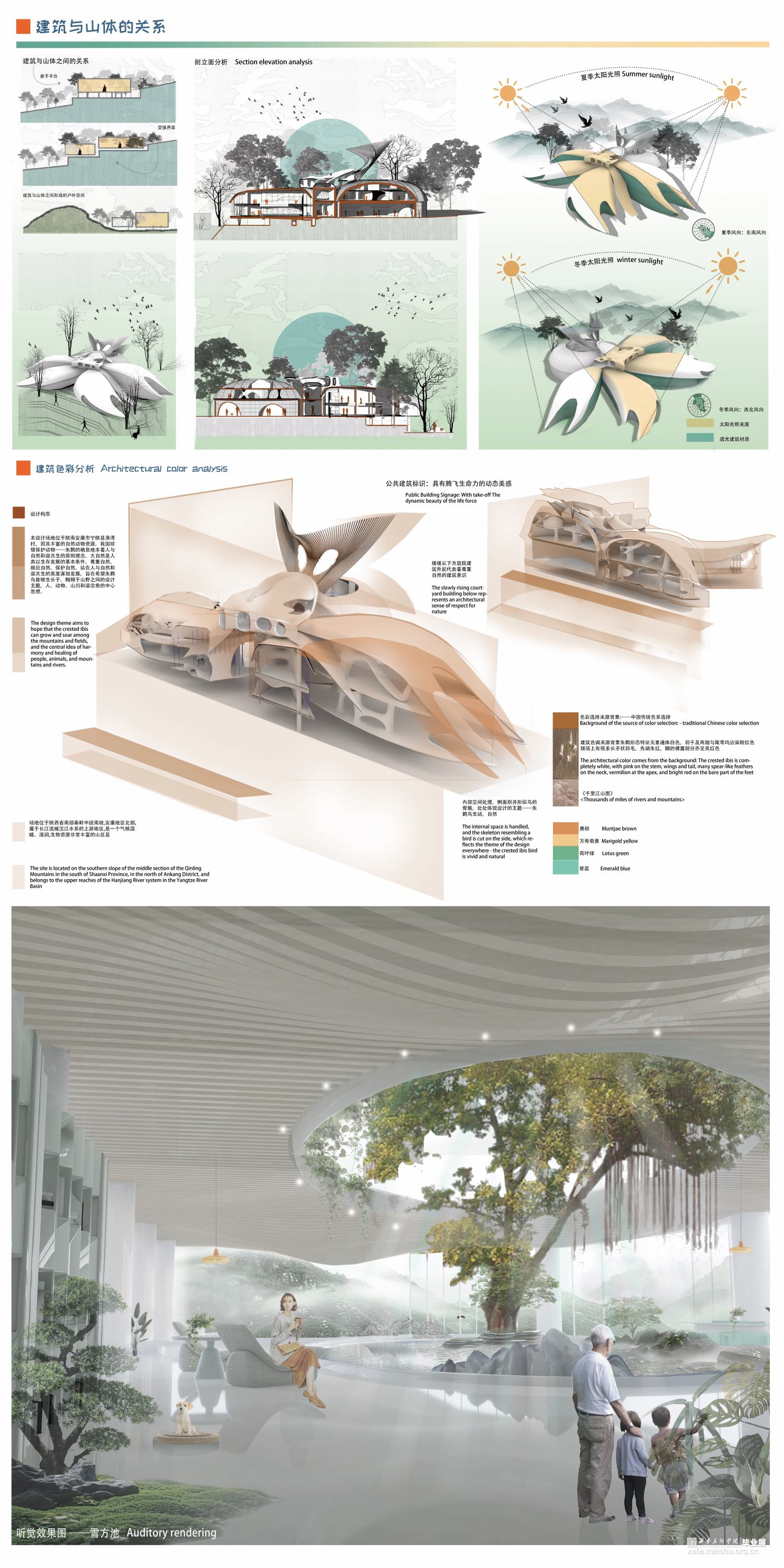 本设计方案位于安康市宁陕县南部的渔湾村,从上个世纪60年代的废旧水电站,出落成目前精致的生态社区中心,当地拥有具有人文情怀与美学理念的公共休憩空间,——书店、咖啡馆、美术馆等集公共文化、旅游服务等复合型功能空间。经过实地调研探查,在其中敏锐的察觉到仍有部分功能空间的缺失,因此本设计立足于康养疗愈体验的主题进行设计。设计中心围绕“五感设计”中心主题进行构思,立足当地生态自然资源,朱鹮保育的目的,守护秦岭净土的原则,以此构成本设计的思想框架——以朱鹮鸟、蝴蝶兰花种为元素提取的仿生建筑,结合陕南传统民居建筑特色,在此基础上融入新设计理念和材料的增加,在建筑空间上的新旧结合。艺术疗愈与空间结合,引入自然元素。扎根大地,立足乡土文化资源,做陕南的“大地艺术”。有无相生,道法自然——以赋予有无相生,道法自然的东方哲思,强调人与自然的和谐共生,去寻找生活与压力现实世界的平衡;去寻找人们身心自我的平衡;去寻找传统建筑空间新旧设计结合的平衡。