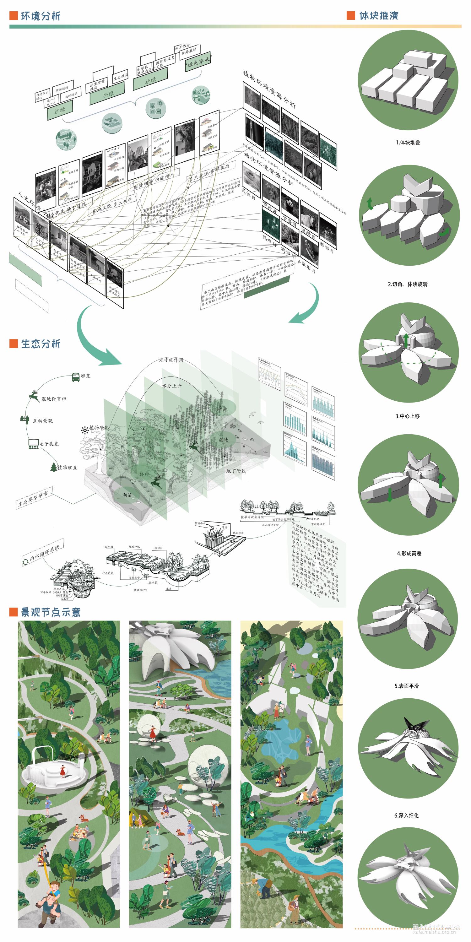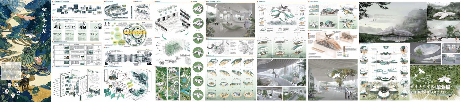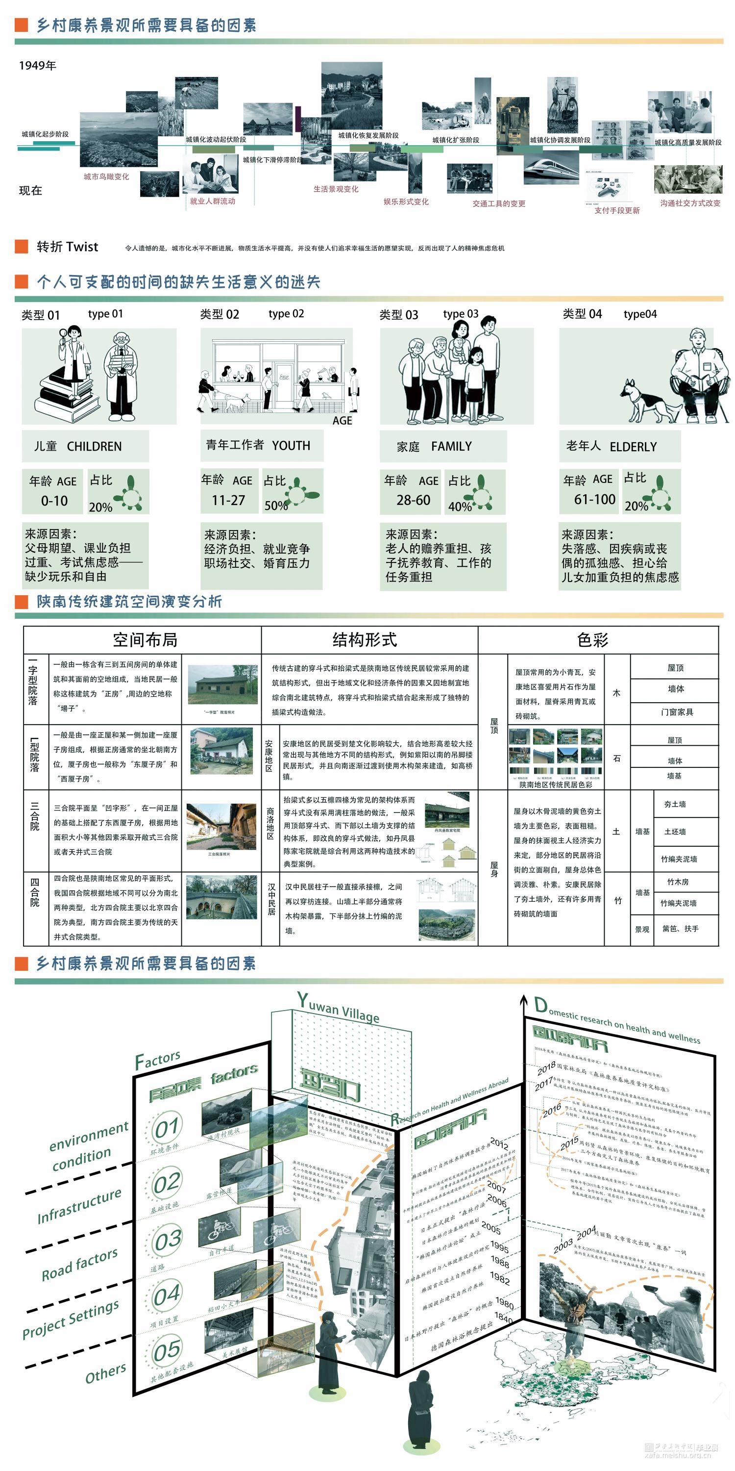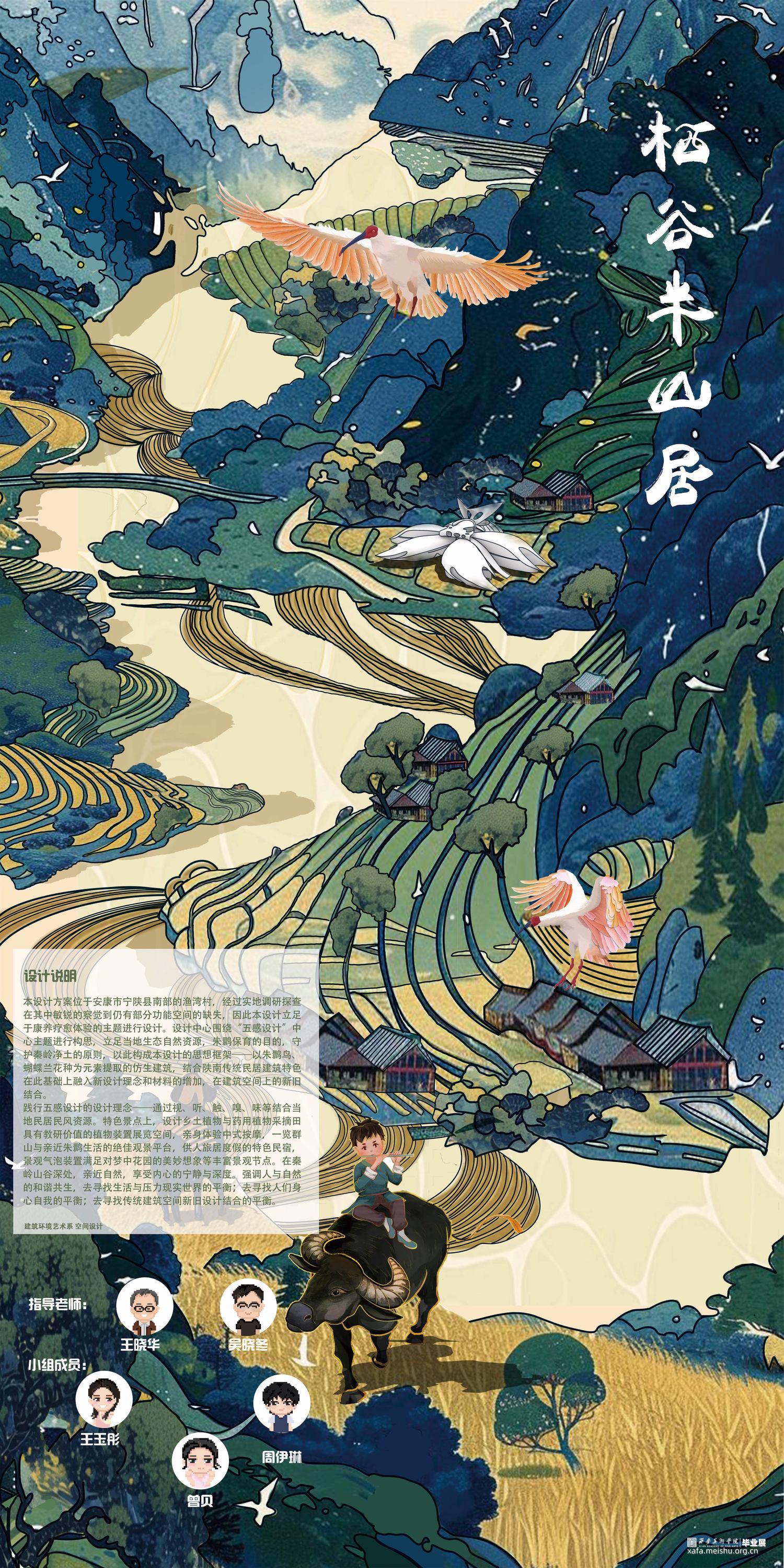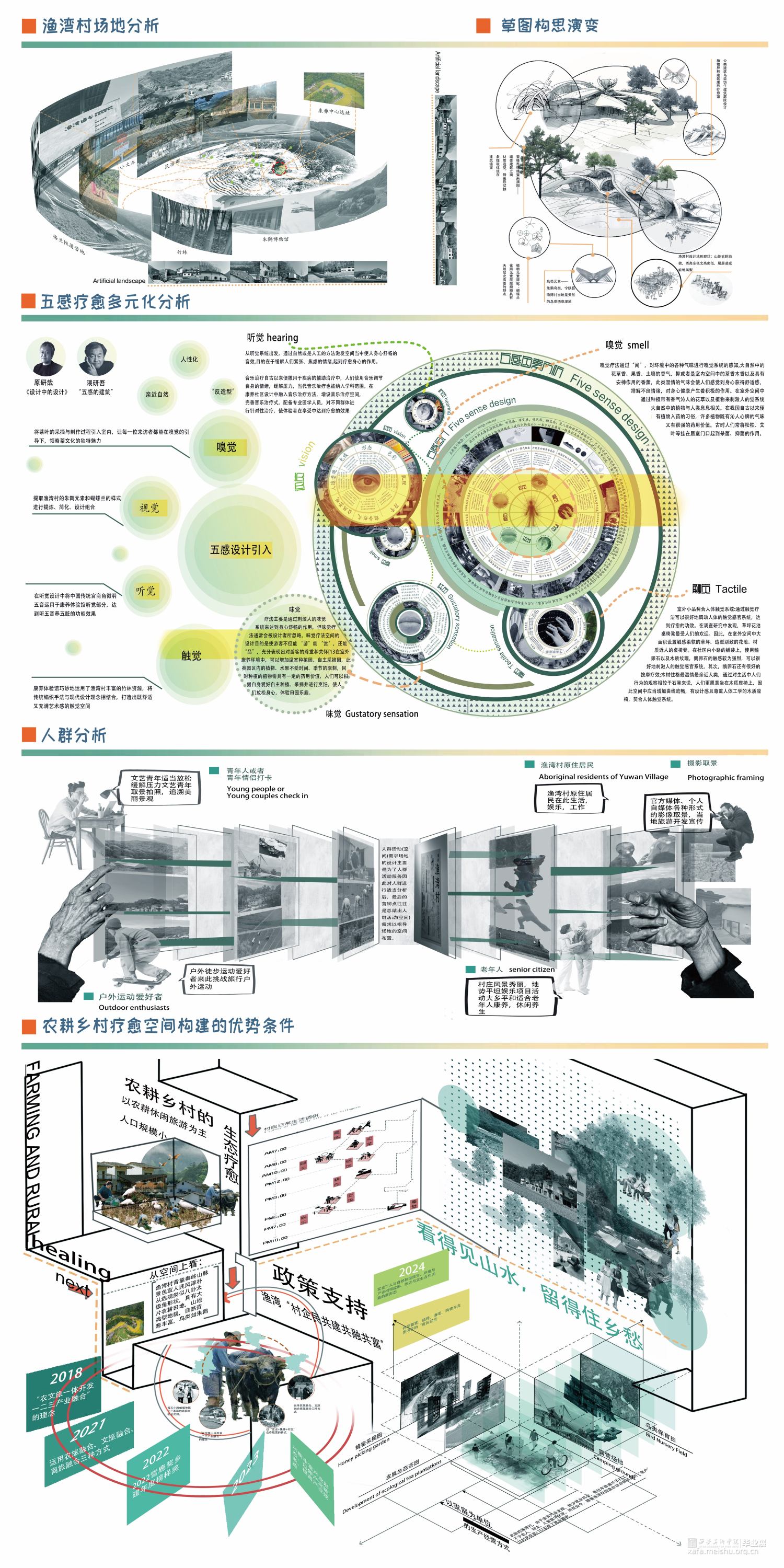 本设计方案位于安康市宁陕县南部的渔湾村,从上个世纪60年代的废旧水电站,出落成目前精致的生态社区中心,当地拥有具有人文情怀与美学理念的公共休憩空间,——书店、咖啡馆、美术馆等集公共文化、旅游服务等复合型功能空间。经过实地调研探查,在其中敏锐的察觉到仍有部分功能空间的缺失,因此本设计立足于康养疗愈体验的主题进行设计。设计中心围绕“五感设计”中心主题进行构思,立足当地生态自然资源,朱鹮保育的目的,守护秦岭净土的原则,以此构成本设计的思想框架——以朱鹮鸟、蝴蝶兰花种为元素提取的仿生建筑,结合陕南传统民居建筑特色,在此基础上融入新设计理念和材料的增加,在建筑空间上的新旧结合。艺术疗愈与空间结合,引入自然元素。扎根大地,立足乡土文化资源,做陕南的“大地艺术”。有无相生,道法自然——以赋予有无相生,道法自然的东方哲思,强调人与自然的和谐共生,去寻找生活与压力现实世界的平衡;去寻找人们身心自我的平衡;去寻找传统建筑空间新旧设计结合的平衡。