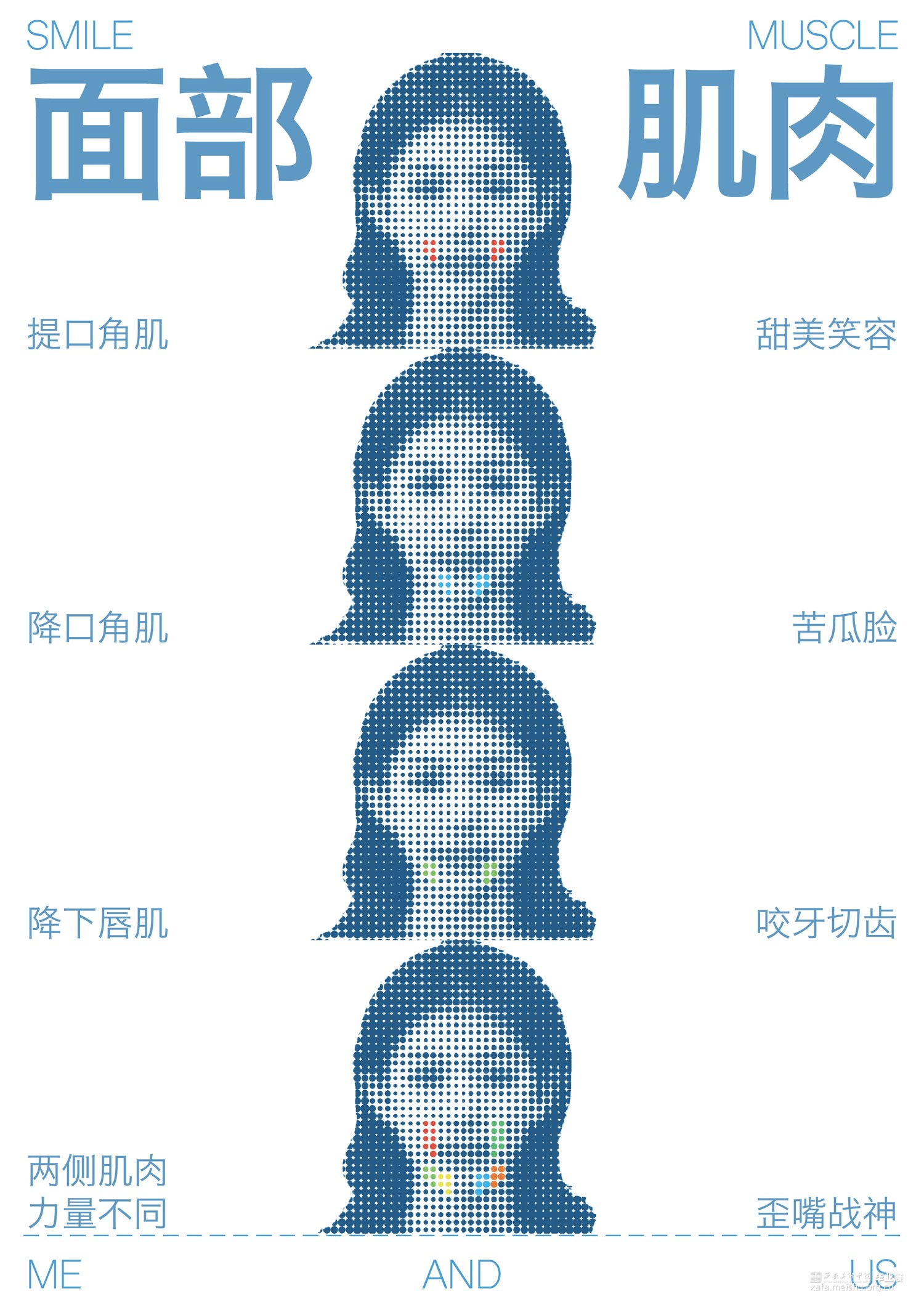 作品旨在探讨社交迎合行为在当今社会的影响,以及人们在面对社交压力时的心理状态和行为表现。通过图形化,图片化表现面部表情的弧度变化,研究年轻人如何寻找并建立真实的社交关系,以帮助他们摆脱社交压力,找到真实的自我。